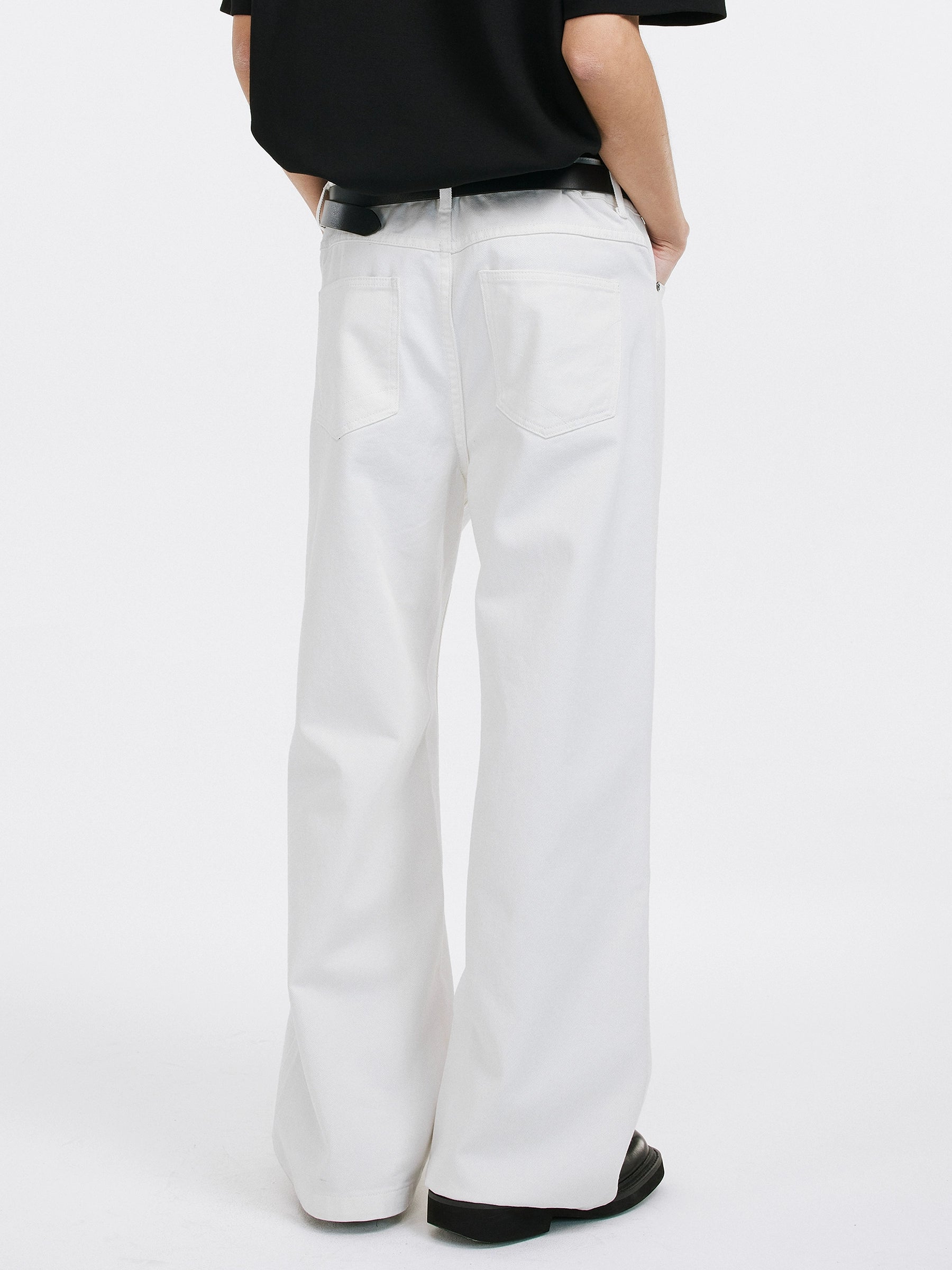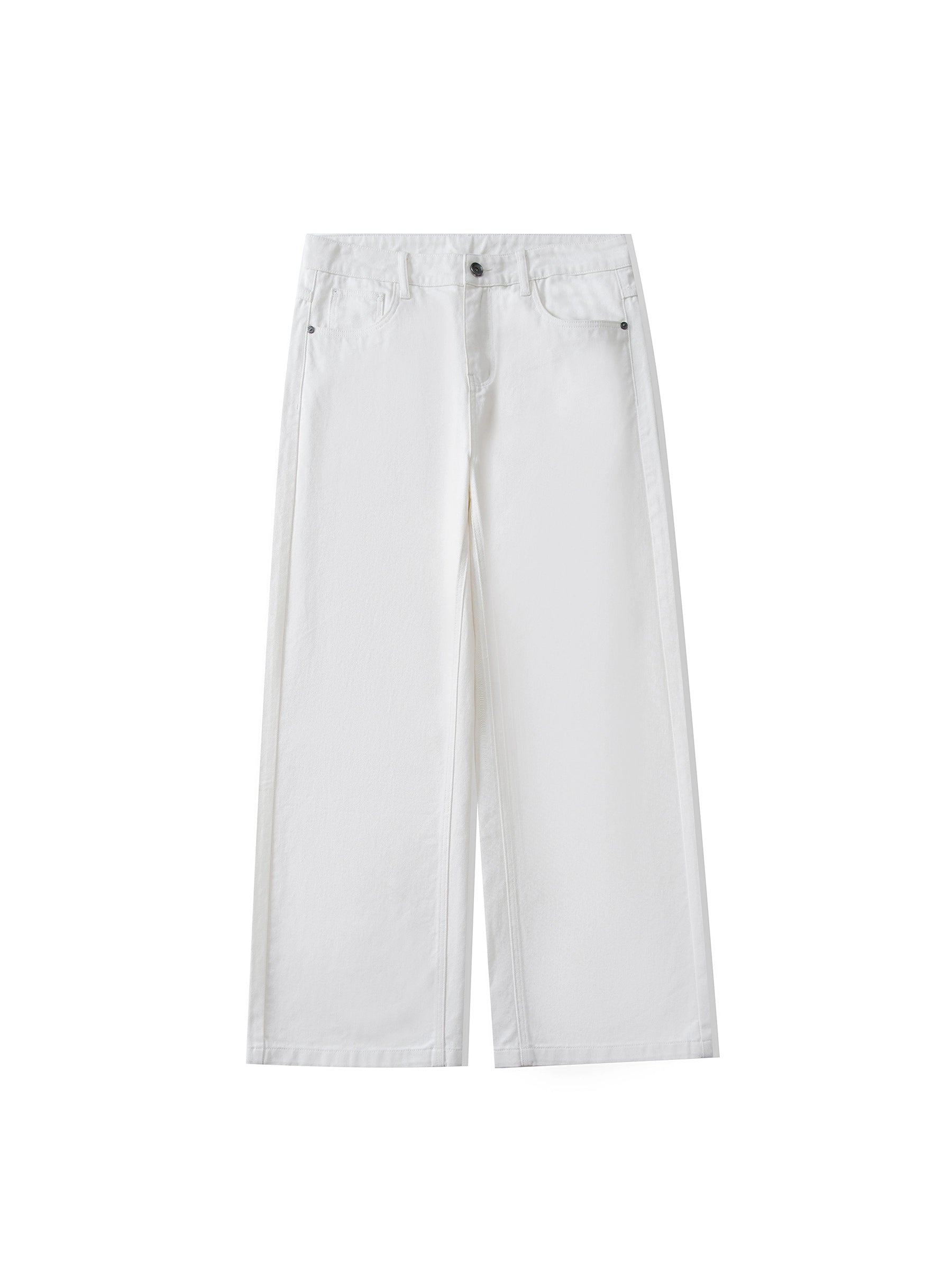 Crafted from quality 12-ounce per square meter all-cotton denim, these jeans feature a structured, three-dimensional silhouette that maintains its shape while offering a relaxed, straight fit. Custom-brand metal rivets add a touch of understated elegance, complementing the crisp white hue. The inclusion of an imported YKK metal zipper ensures durability and adds a refined finish.