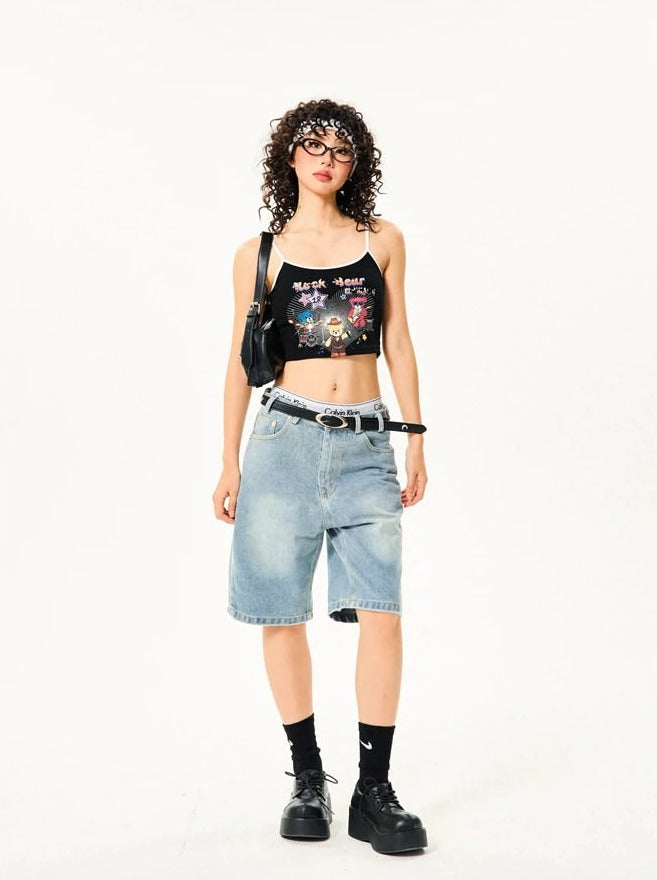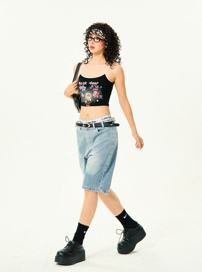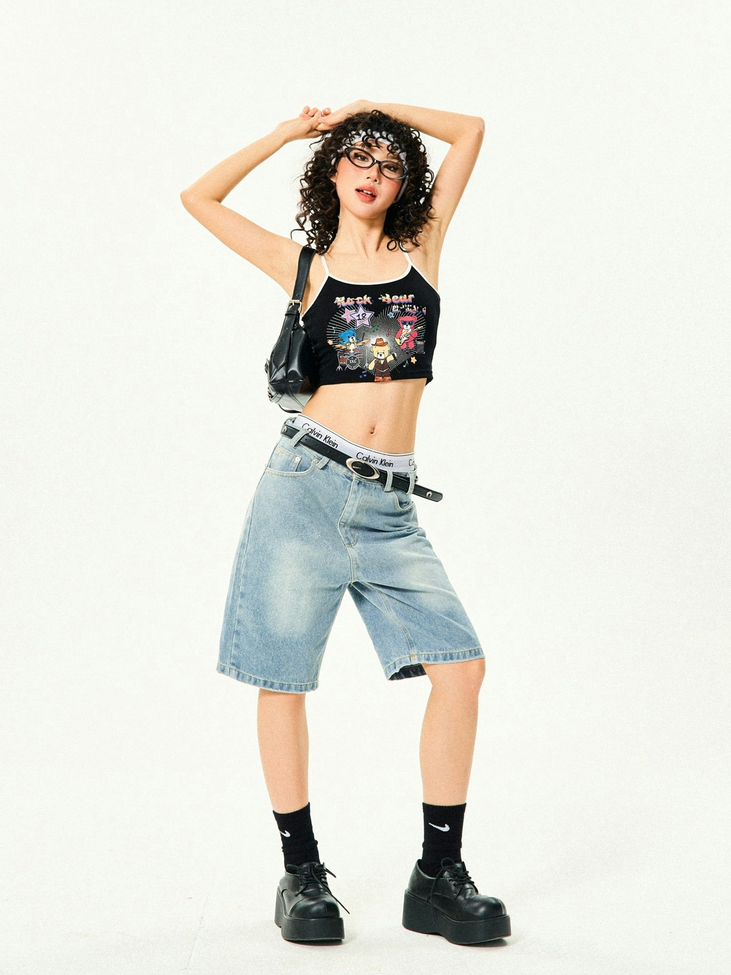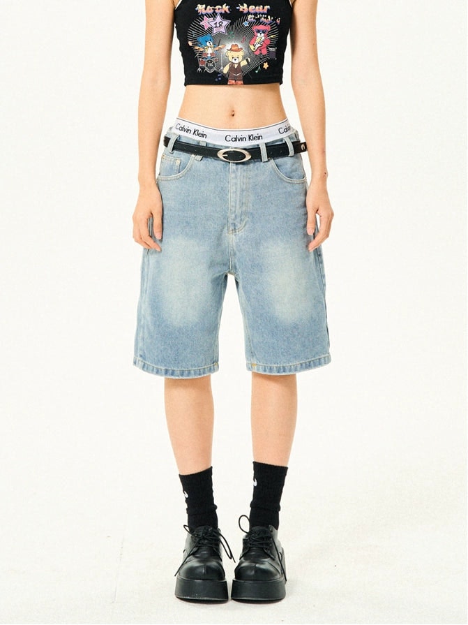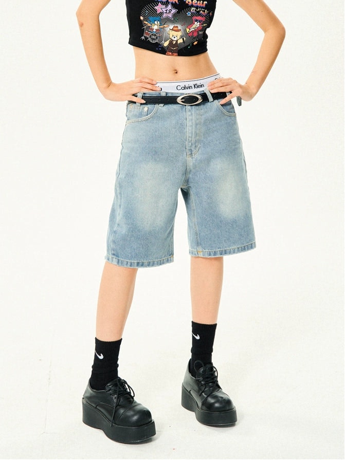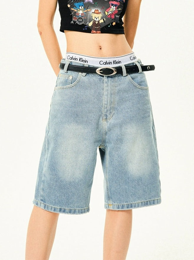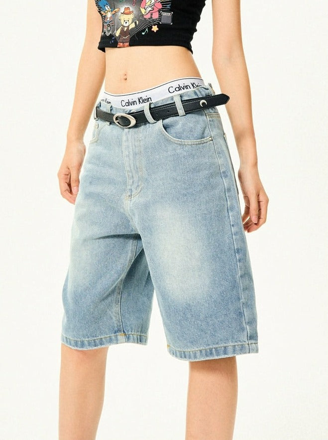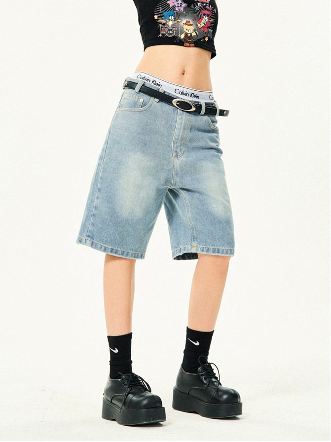 Straight Low-Waisted Faded Denim Bermuda Shorts