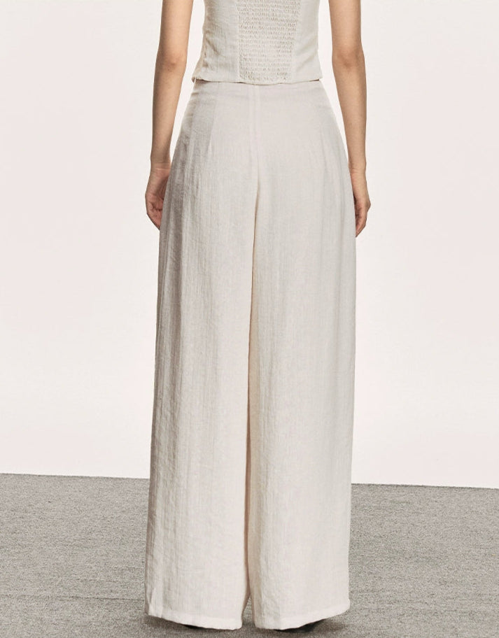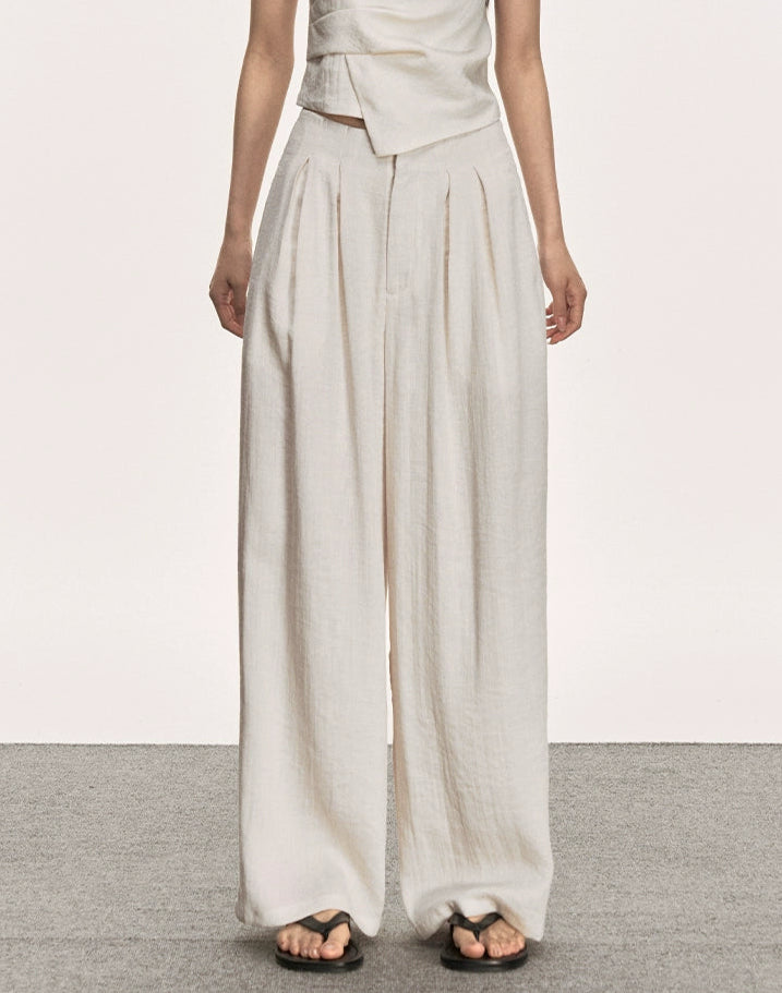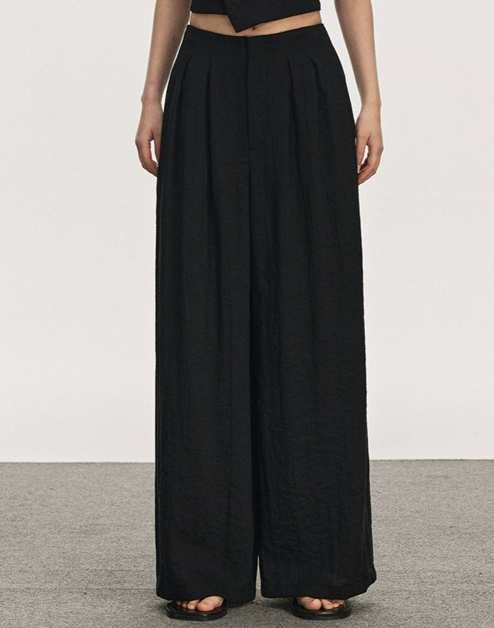 It's a go-to combo when you want something minimalist but not boring. The top is cut from a soft blend of rayon, TENCEL, and linen with a sculptural drape that adds texture without feeling heavy. The pants sit high with a soft pleated front that creates shape and movement, finished in a billowy wide-leg cut that balances freedom and refinement.