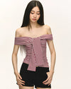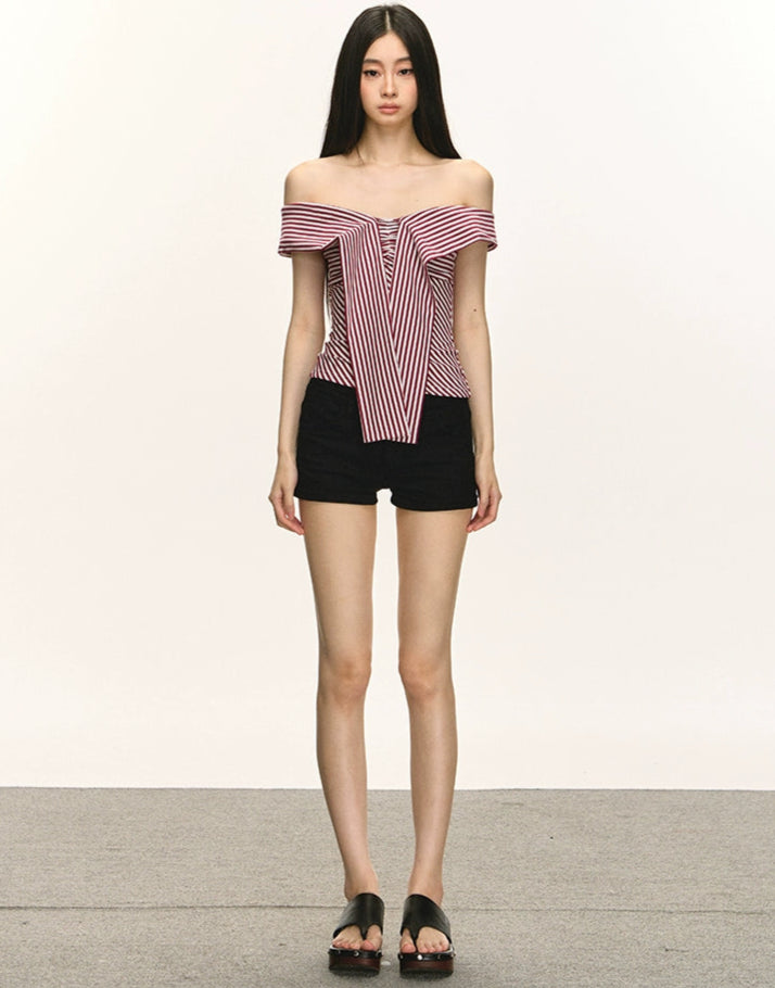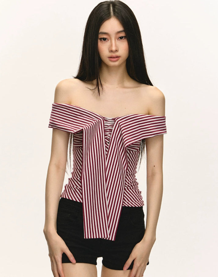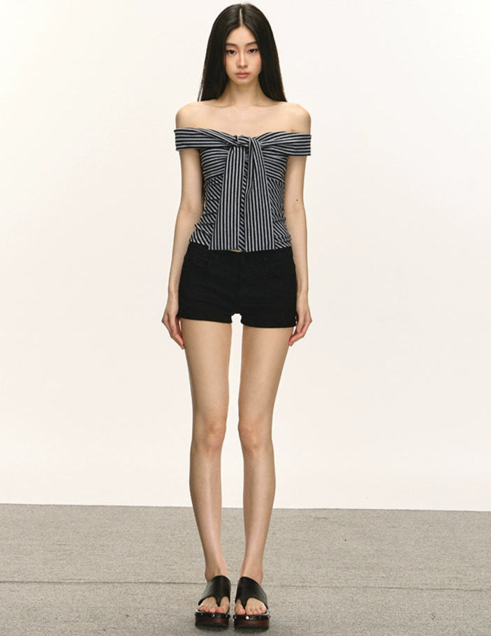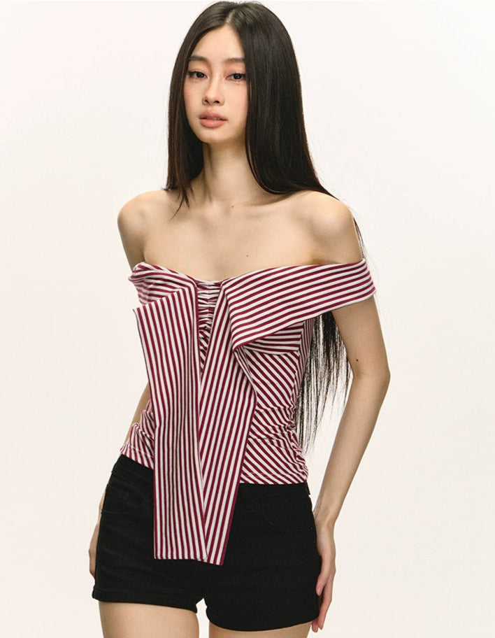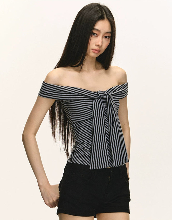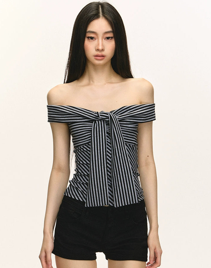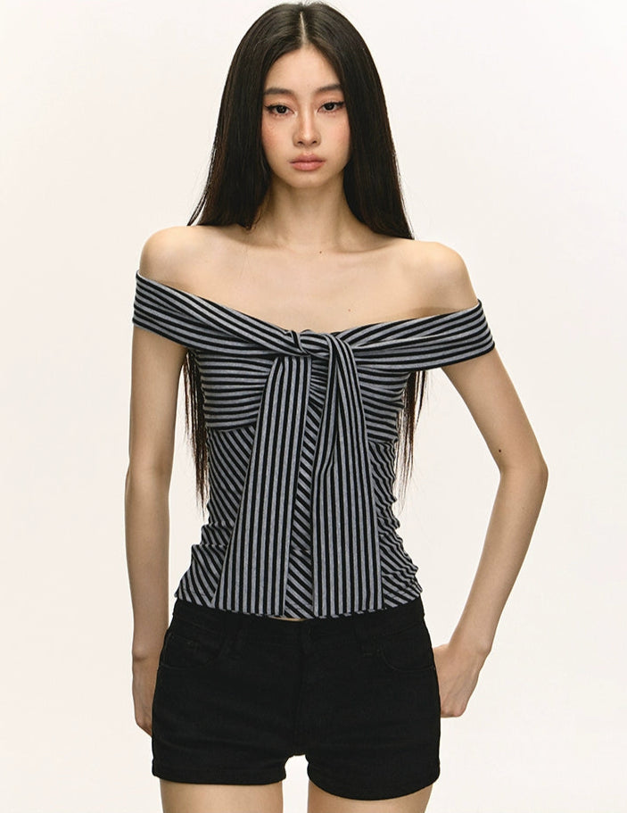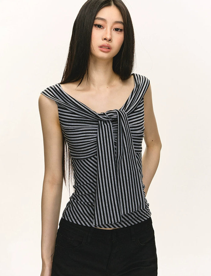 It’s the kind of piece that does the styling for you without trying too hard. Made from a soft, stretchy cotton blend, this top feels fitted without being restrictive. The vertical and diagonal stripe contrast highlights the curve-hugging silhouette, while the attached front-tie scarf adds structure and edge.