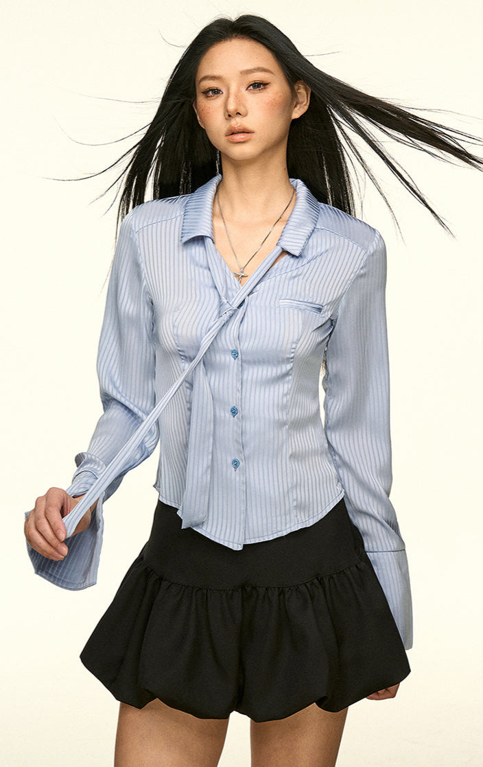 Striped Button-Up Long Sleeve Shirt with Tie Detail