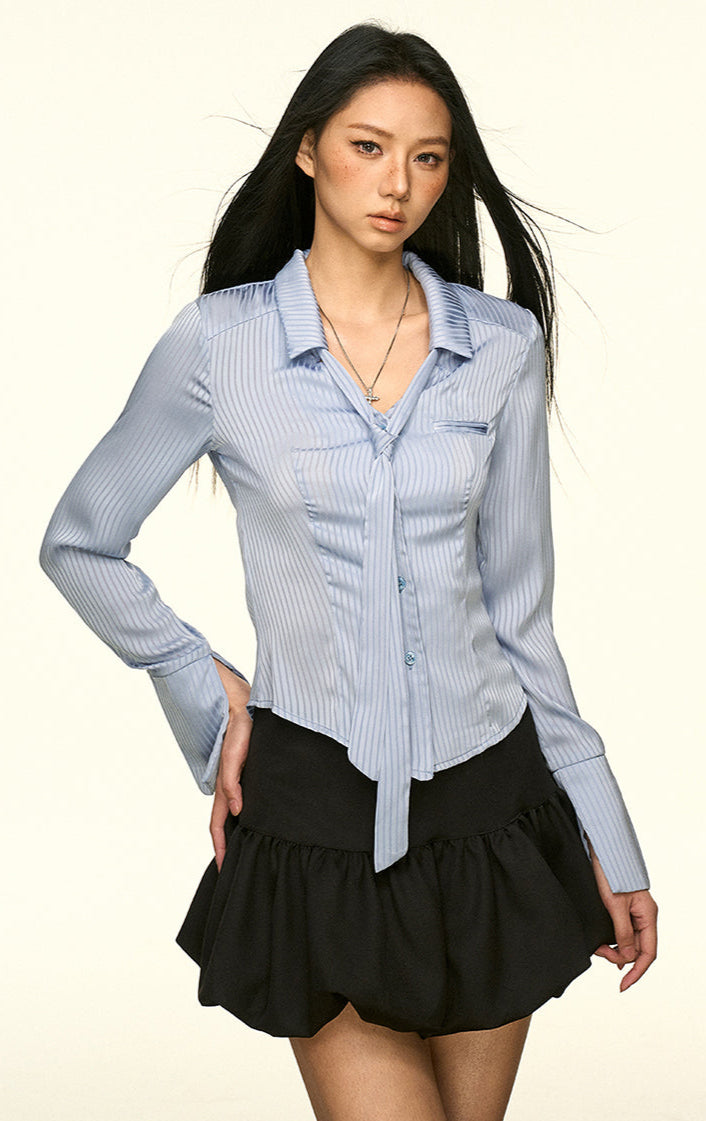It's a smart staple with an edge, blending clean structure with just enough flair to feel modern. Designed in a lightly fitted cut, the shirt features classic lapels, tonal blue stripes, and an asymmetrical hemline that shifts it away from strictly formal. The lightweight fabric gives it softness and movement, while the front tie adds a distinctive touch that plays well with both casual and dressed-up fits.