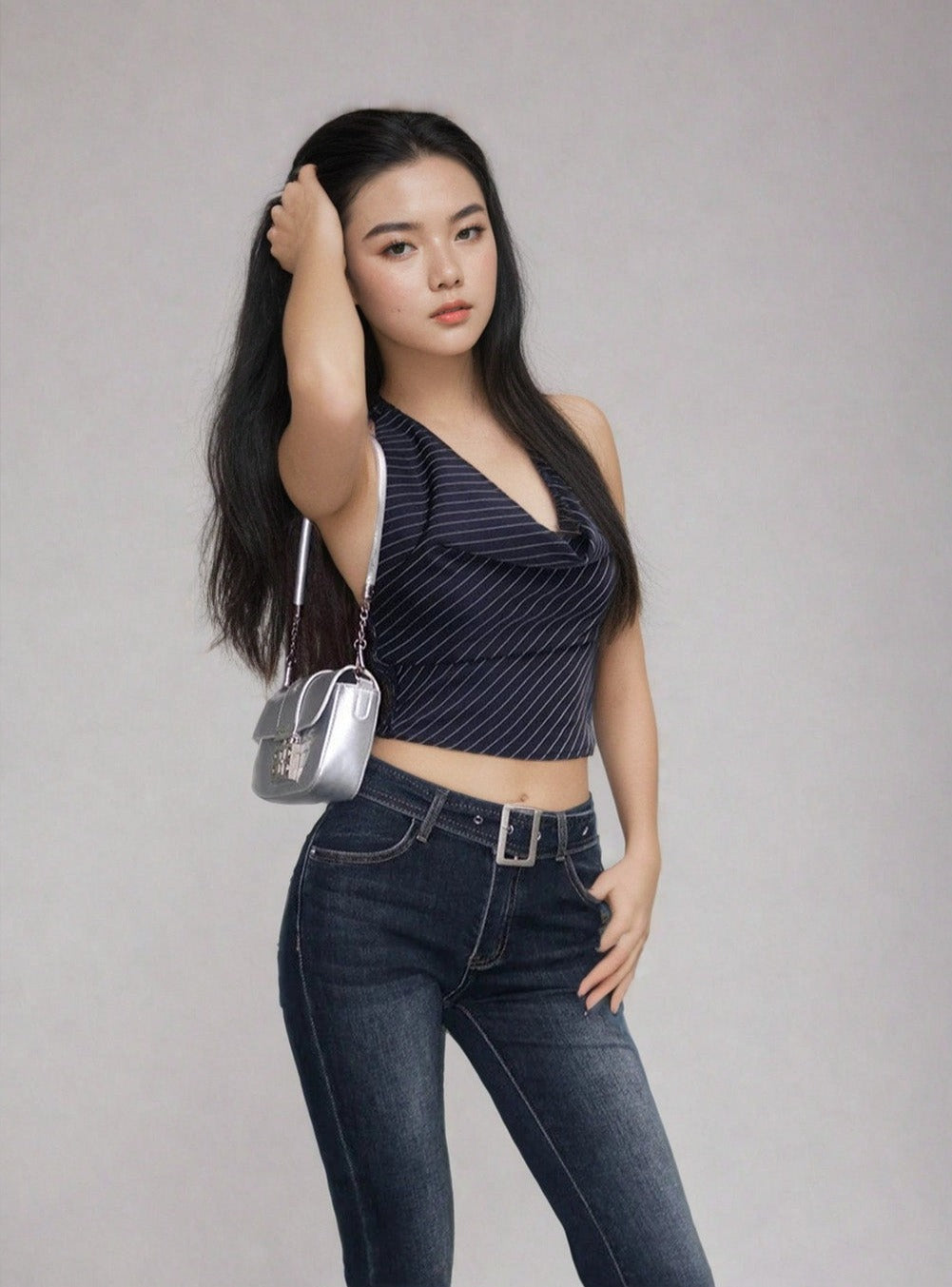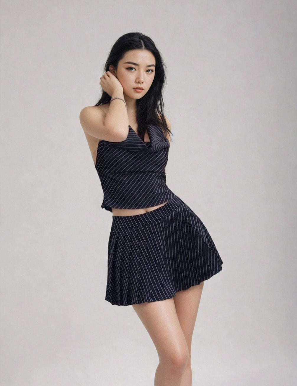 The set features a cowl-neck crop top with a graceful drape design that accentuates the shoulders and a complementary pleated mini-skirt for an airy, nonchalant look. Constructed with details such as a tie neck and a slightly curved hem to flatter the silhouette, the outfit is made from a quality striped fabric that ensures both durability and breathability. The fabric's crisp texture and clear, intricate stripes add a layer of sophistication, while the open back design brings a dash of edginess.