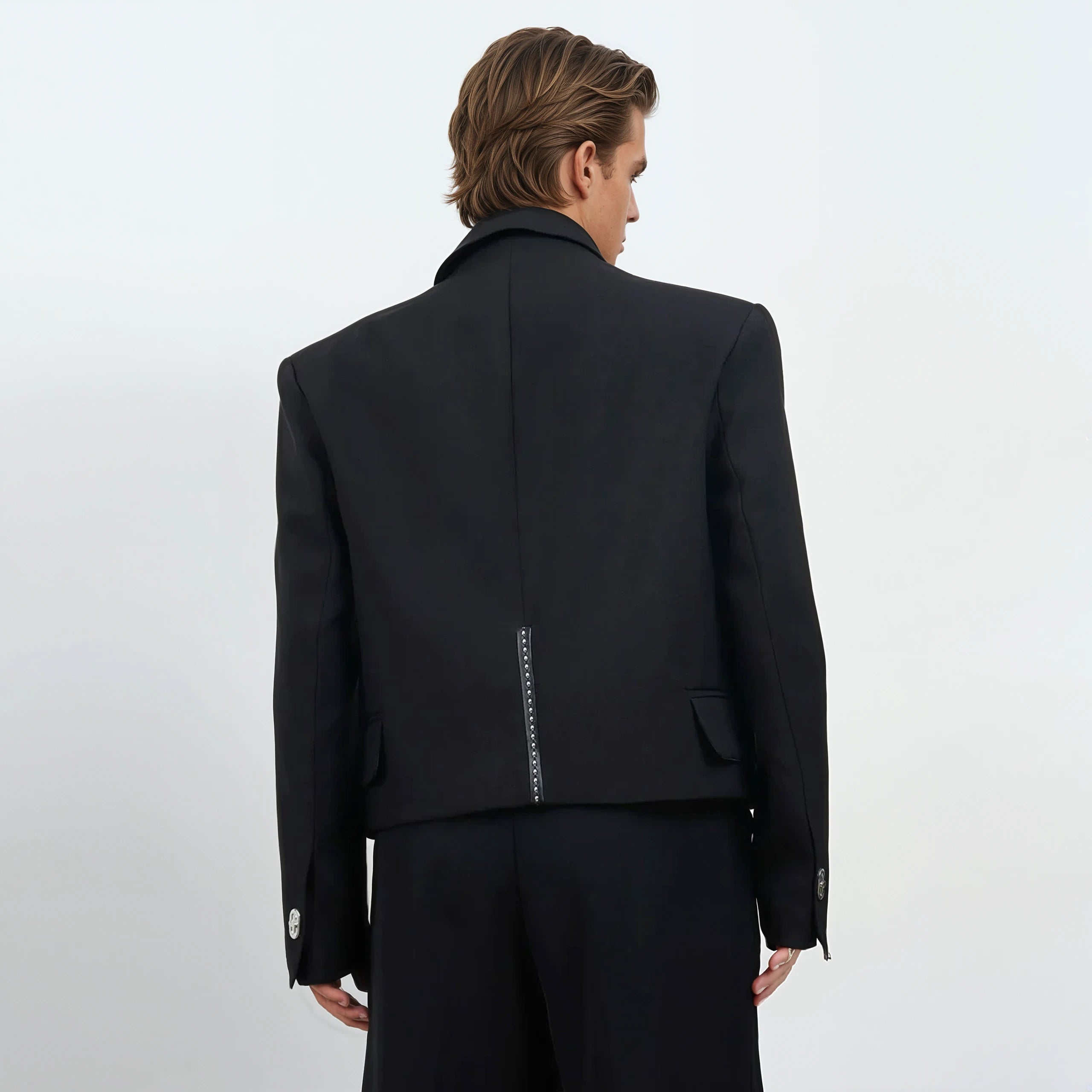 It's a strong statement piece that doesn’t try too hard—just the right amount of structured cool without overthinking it. Crafted from a medium-weight woven fabric, this short-length blazer features subtle shoulder padding and a crisp silhouette that keeps its shape. The solid black tone and narrow notched collar lend a timeless appeal, while the carabiner-inspired front closures add an unexpected utilitarian detail.