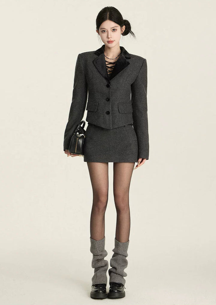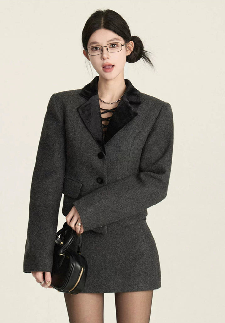 Crafted from a textured fabric blend with a soft yet weighty feel, it delivers a sculpted fit with a defined waist and a clean single-breasted front. The short cut pairs refinement with attitude, while the button details and pointed lapel channel understated depth. It feels elevated but not overdone, making it a go-to piece when you want to feel composed without trying too hard.