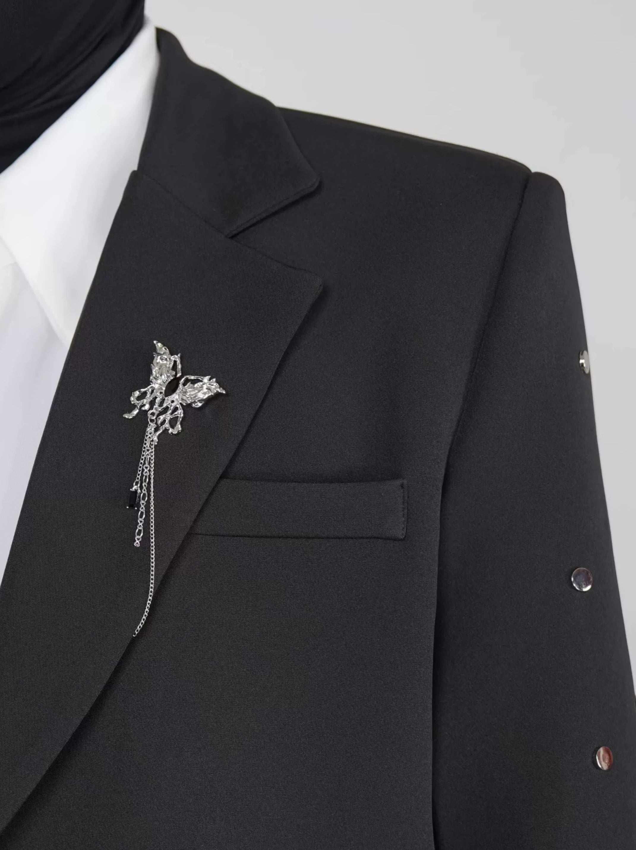 Designed for those who move between professional and casual settings without switching personas, it delivers polish with an unapologetic attitude. Crafted from smooth, wrinkle-resistant polyester, the tailored fit features subtle shoulder padding for structure and a cropped hem that updates the classic blazer shape. Its clean lines are elevated with stud detailing across the sleeves and a solid black finish, keeping the look streamlined and versatile without losing its character.