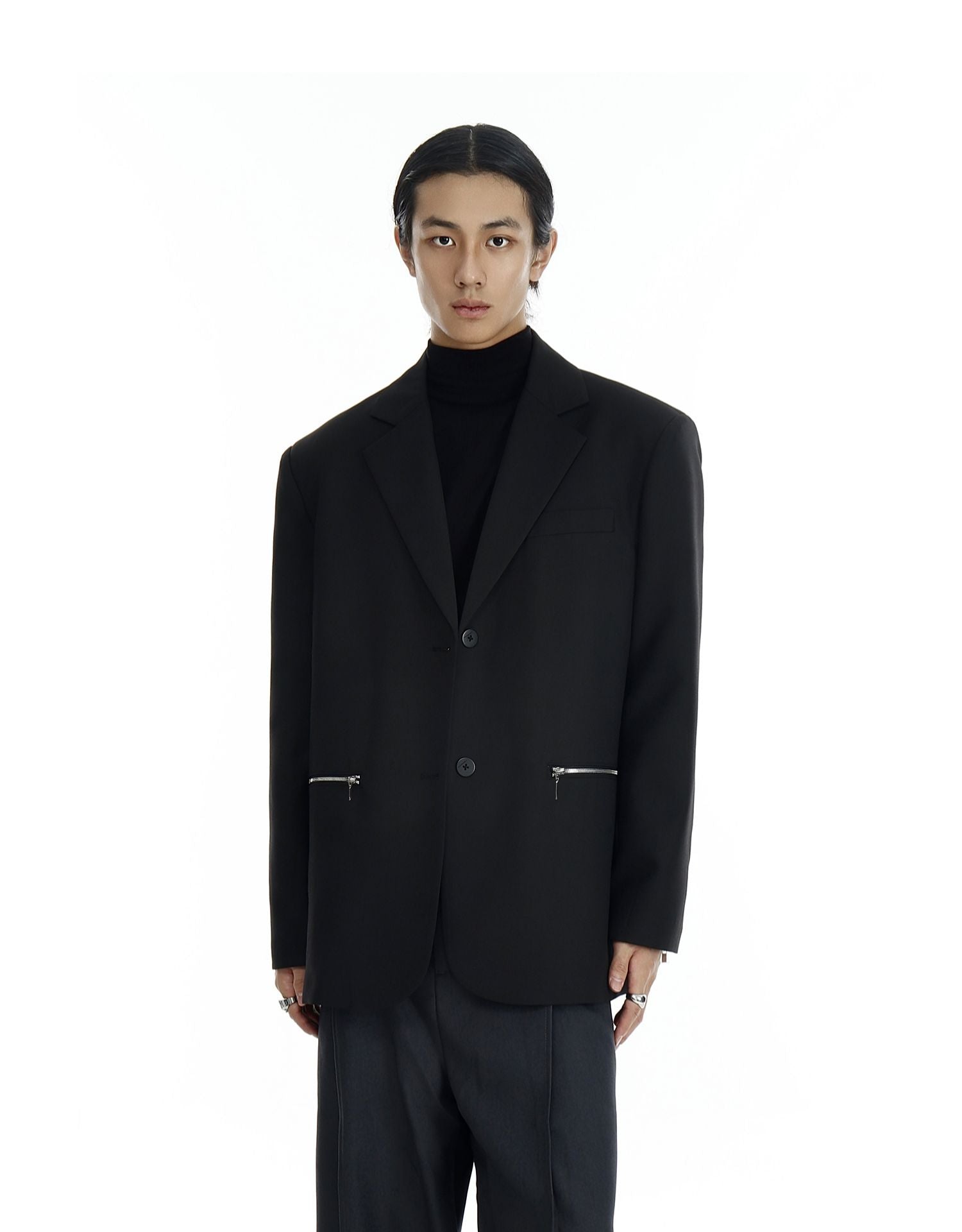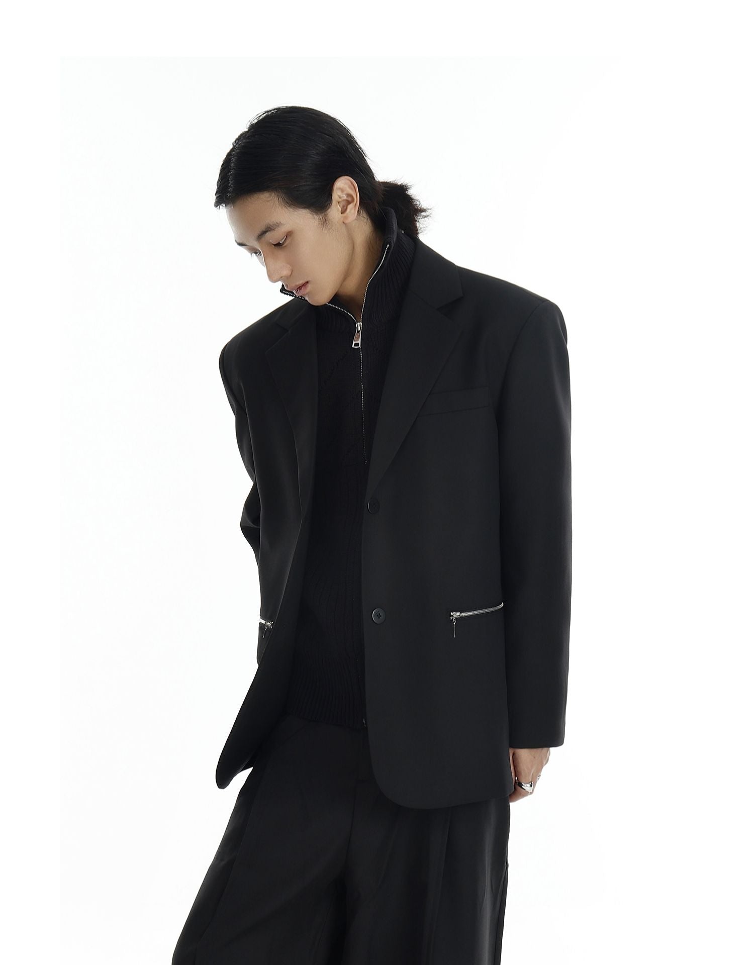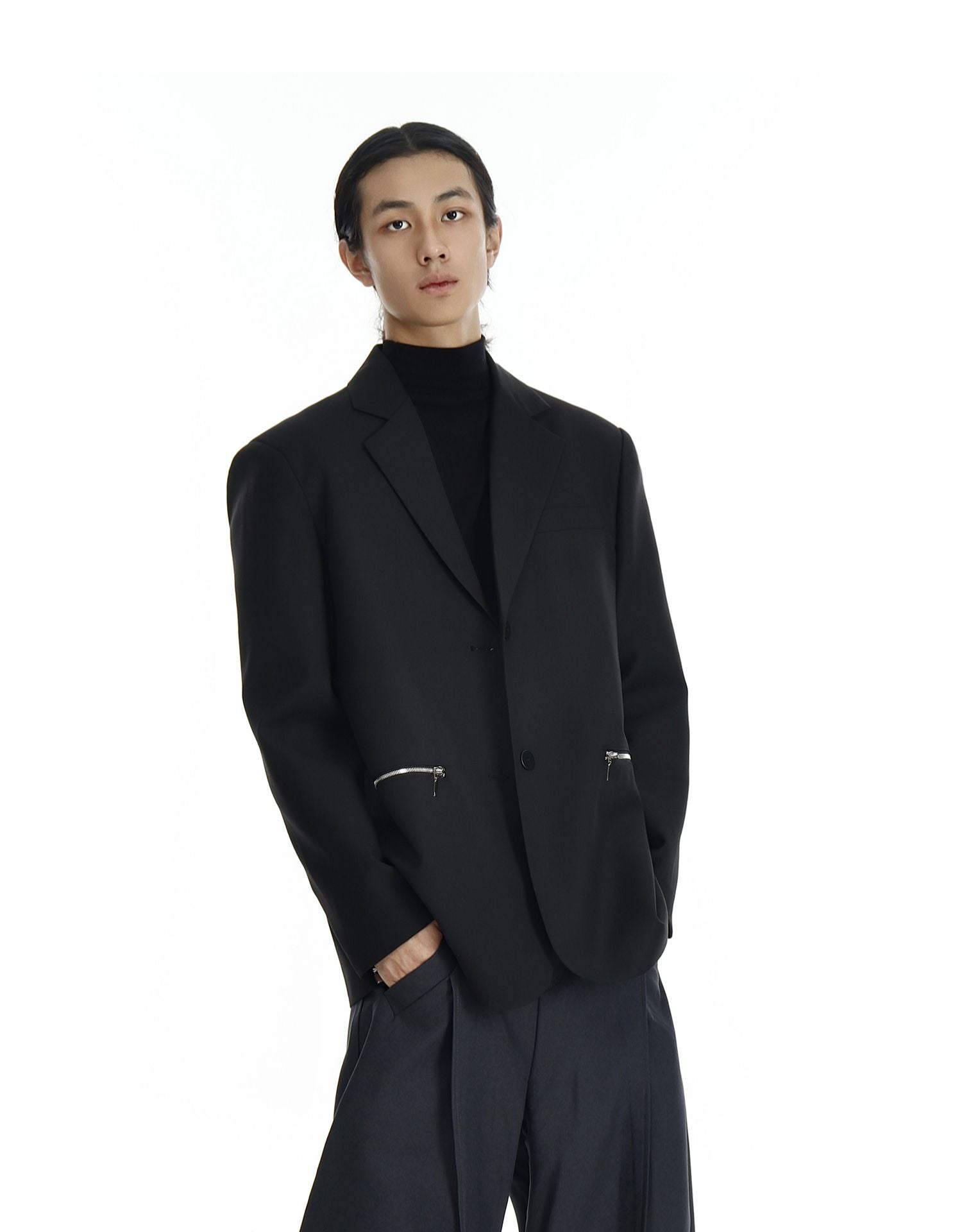 Design details: Silver zipper pockets, notch lapel, functional sleeve zippers