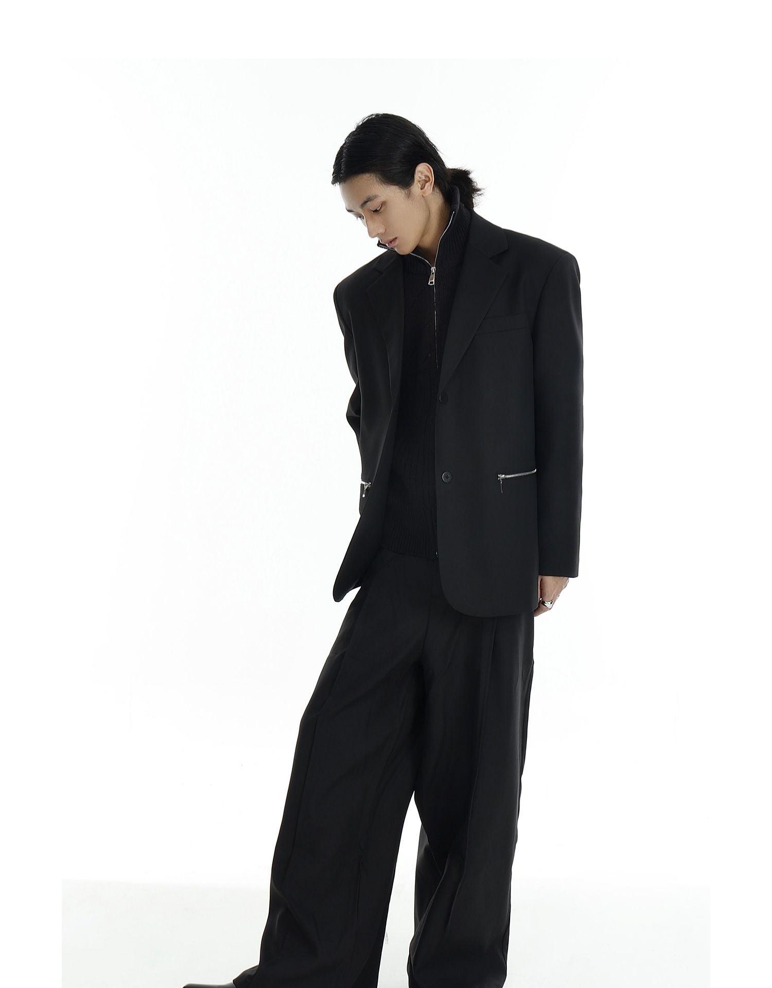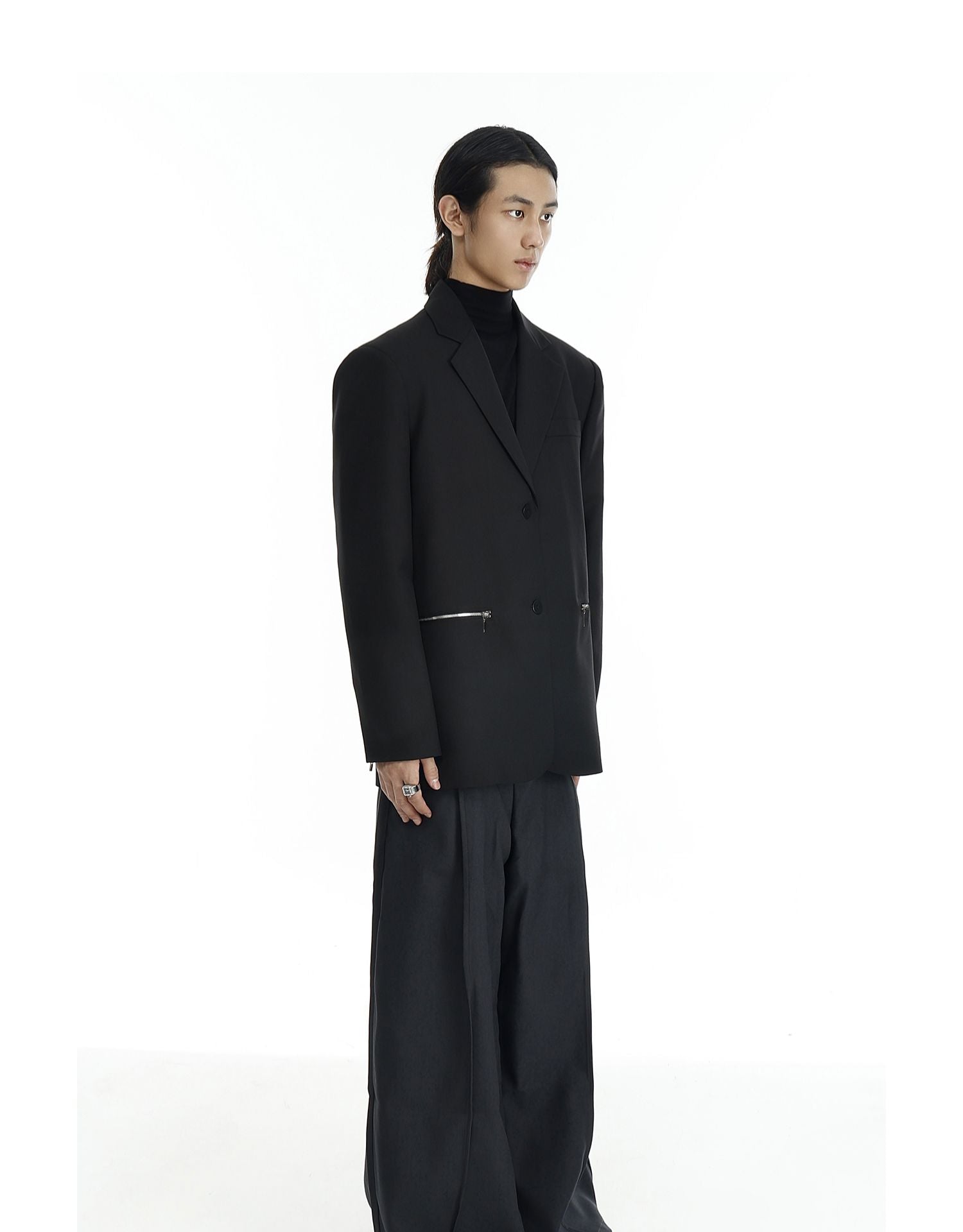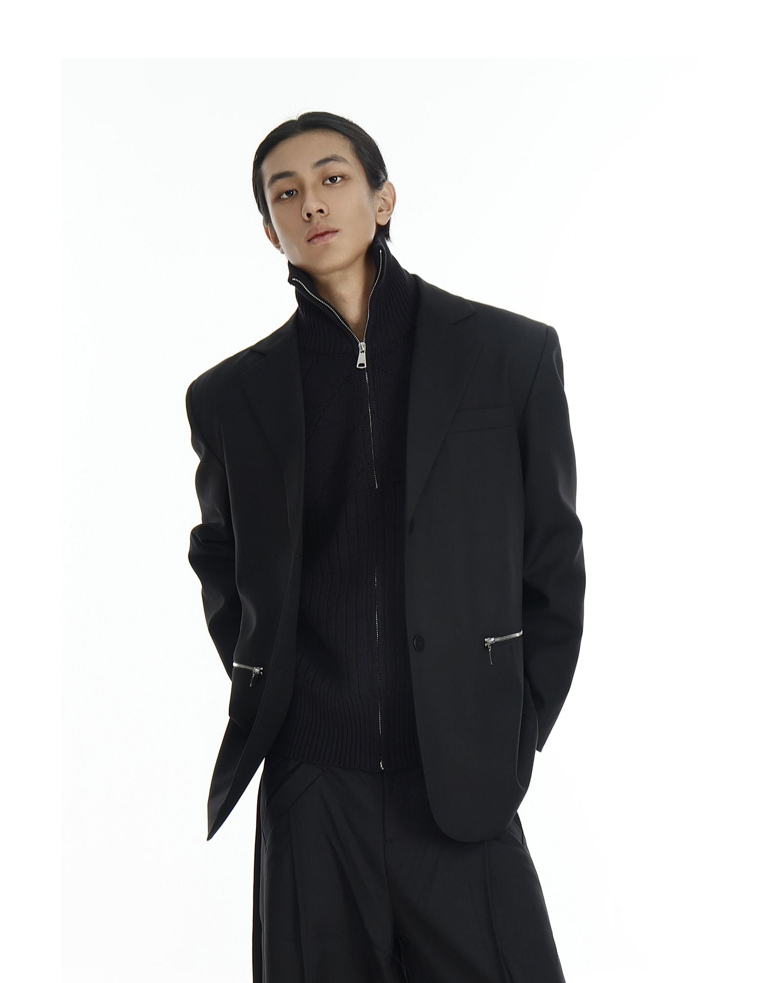Design details: Silver zipper pockets, notch lapel, functional sleeve zippers