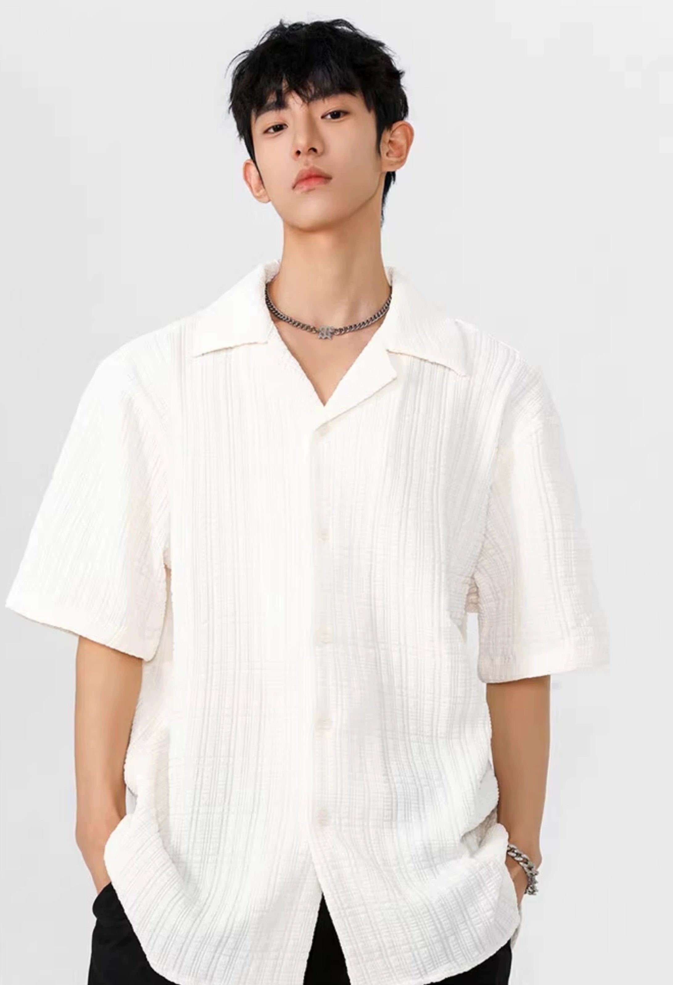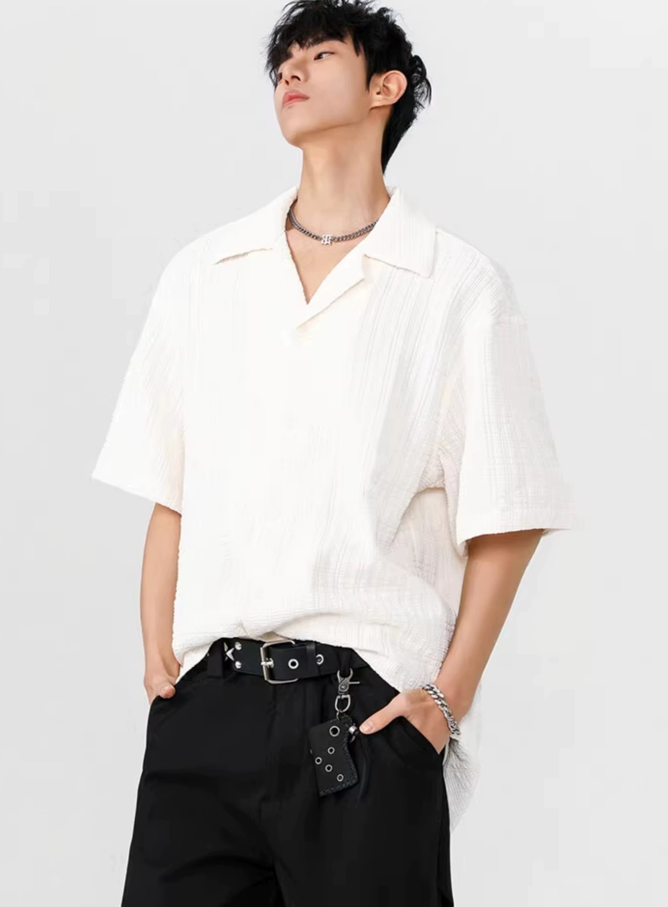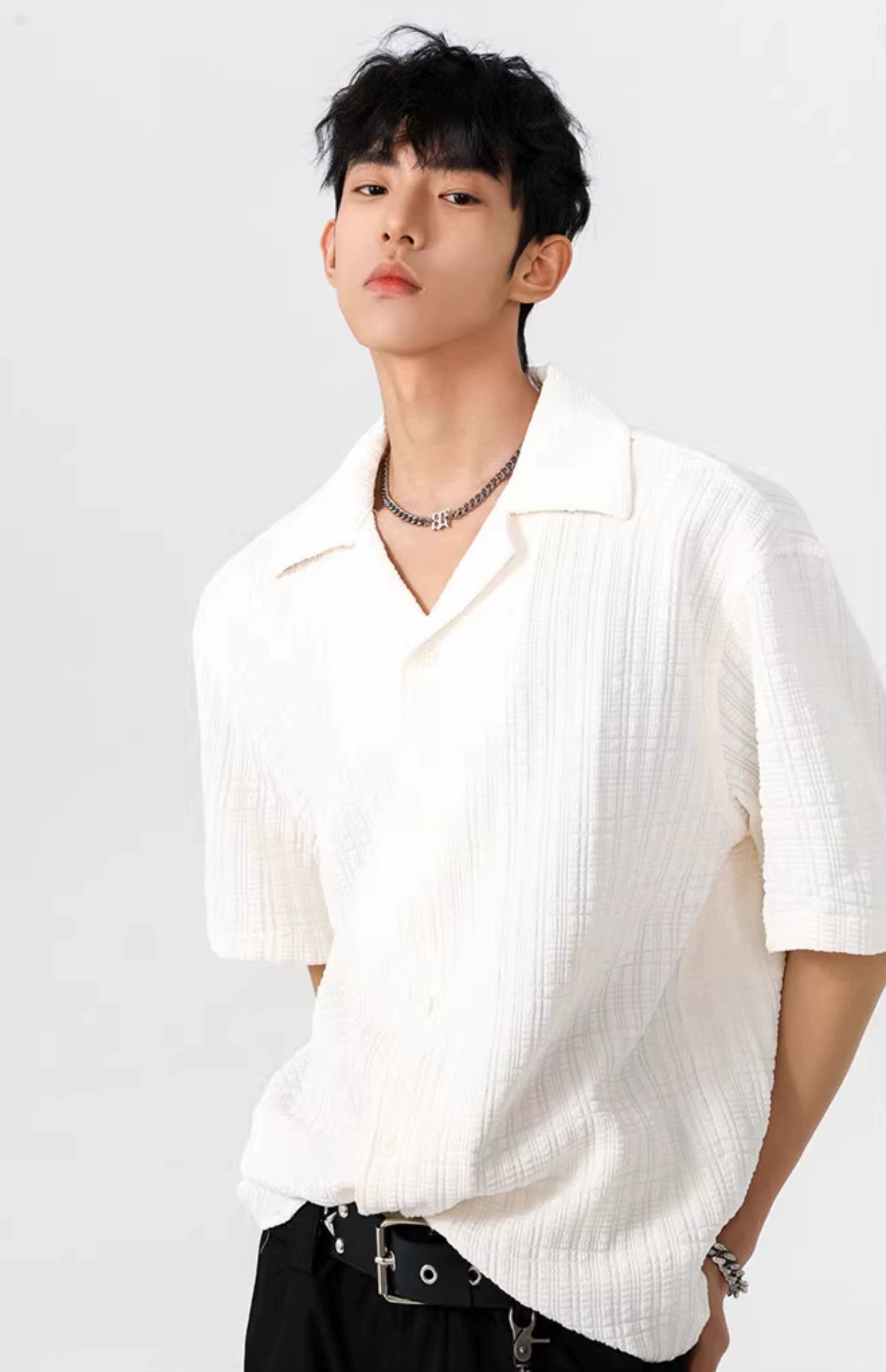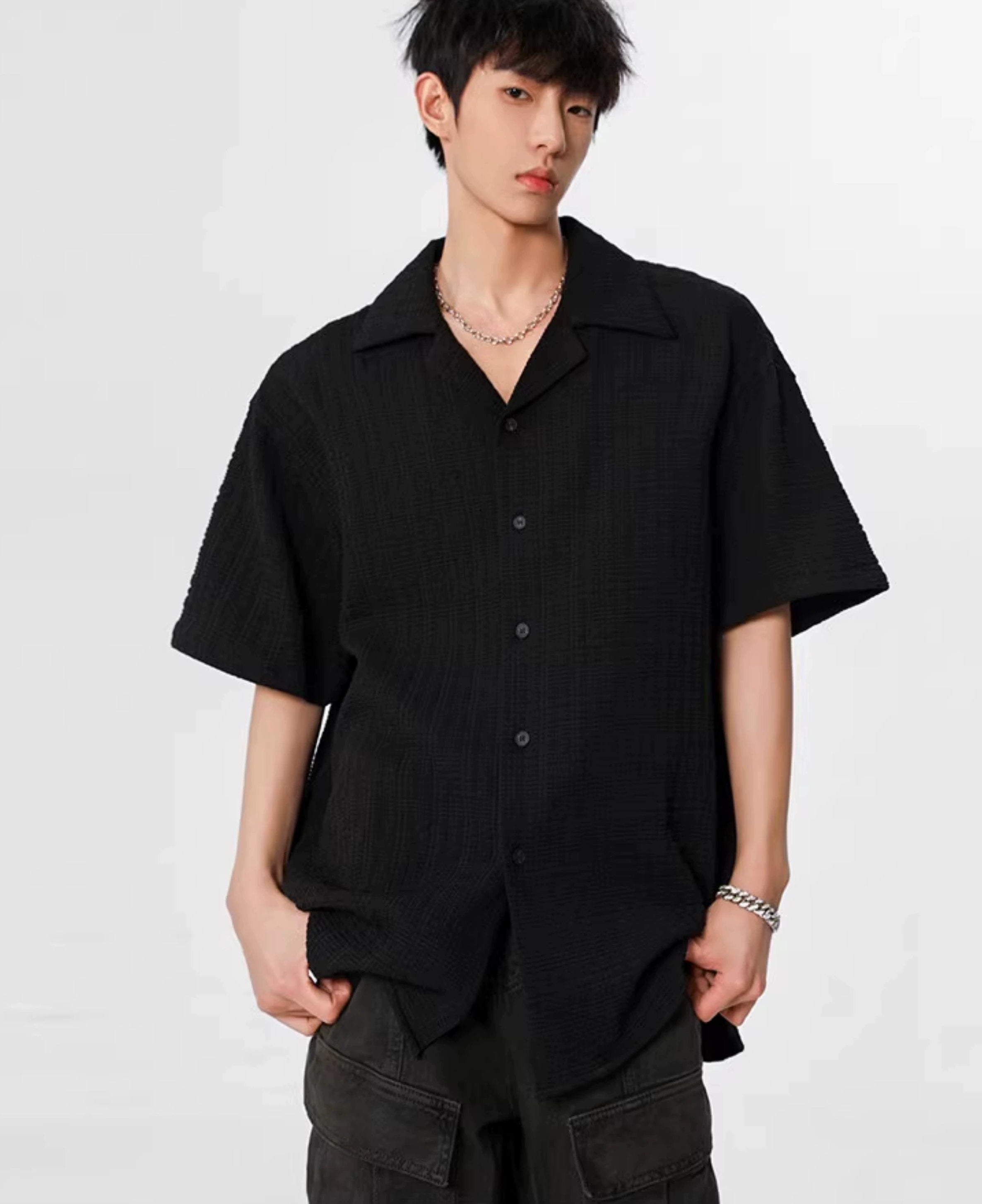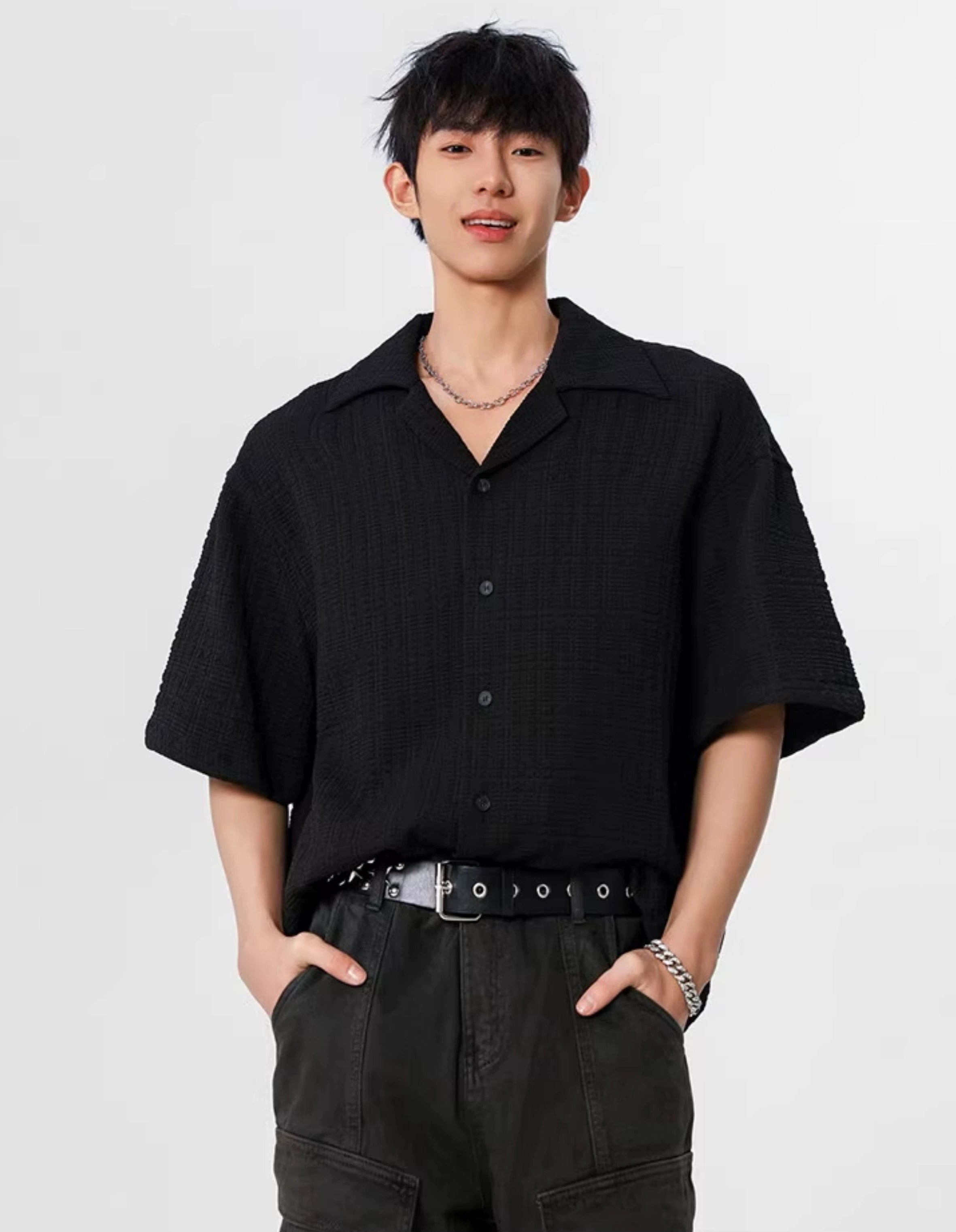 The subtle raised pattern gives it depth and edge, while the camp collar keeps things laid-back and clean. Made from 100% polyester, the shirt feels breathable and polished with just enough texture to stand out. The short sleeves and relaxed fit add movement, while the button-up closure lets you style it open or closed depending on your mood.