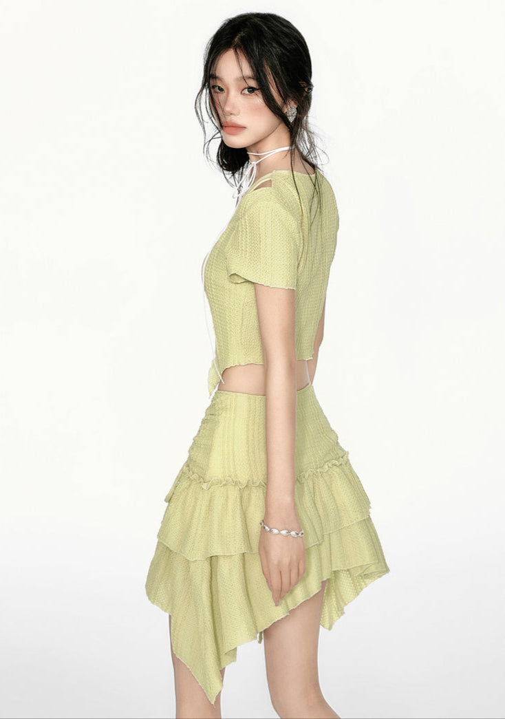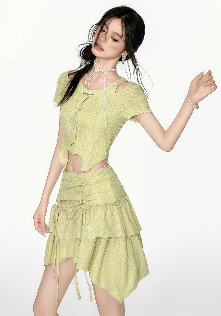 The cold-shoulder crop top features a textured knit fabric with a cutout design, adding a structured yet effortless vibe. Paired with a ruched, tiered ruffle mini skirt, this set creates a balanced silhouette that’s playful but never overdone. The top’s faux-layered design and asymmetric hem subtly elongate your frame, while the skirt’s adjustable drawstring waist and irregular hemline add movement and dimension. Made from soft, breathable fabric with a slight stretch, this set keeps you comfortable while making a statement.