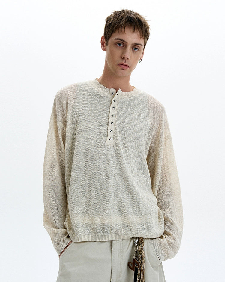 Textured Long Sleeve Sheer Henley Top with Button Detail