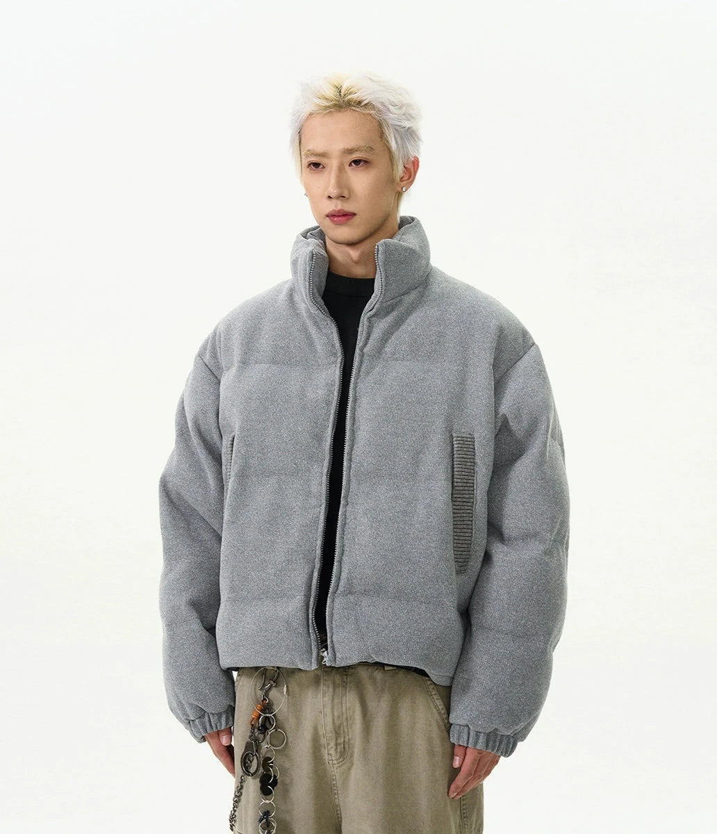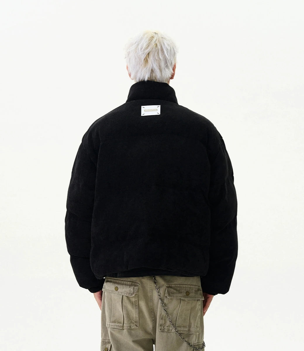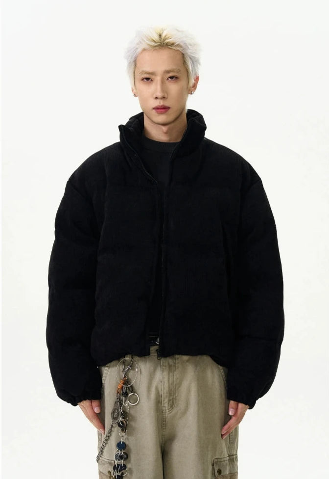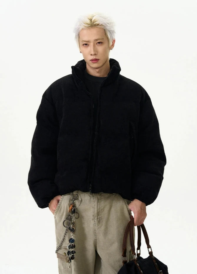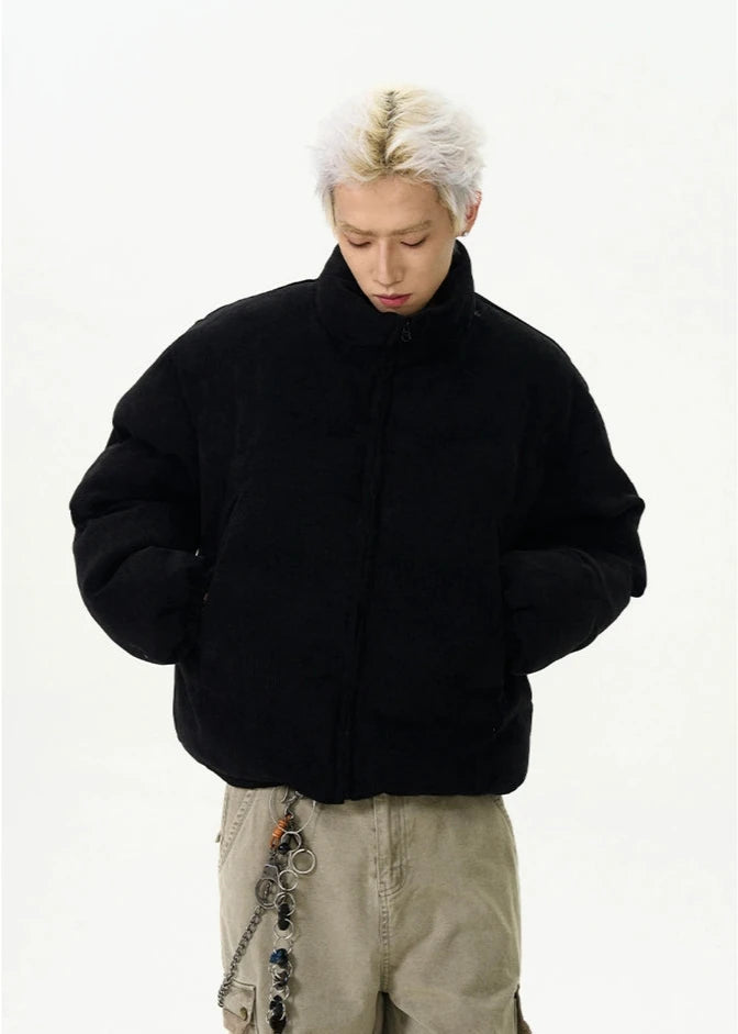 Crafted with a focus on detail, this jacket boasts a durable exterior with ribbed pocket accents that add a touch of sophistication to its relaxed silhouette. The thickened material ensures warmth, while the stand-up collar and zippered closure provide additional protection against chilly winds, creating an outerwear staple that's both practical and eye-catching.