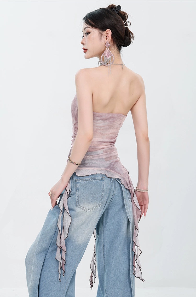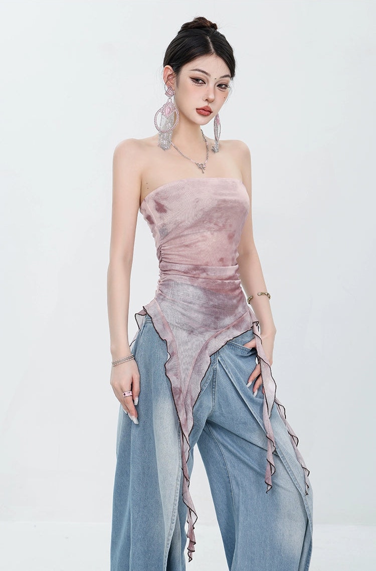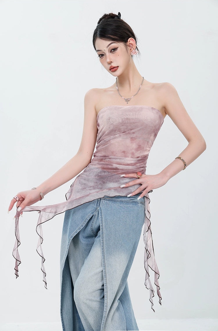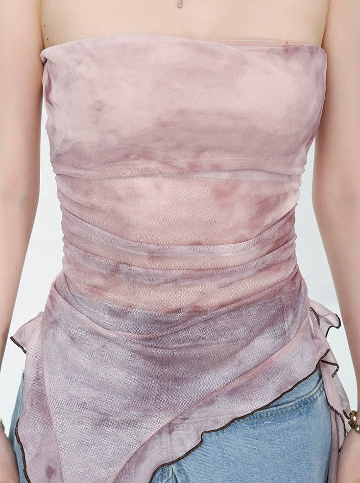 Tie-Dye Ruffled Mesh Tulle Tube Top
