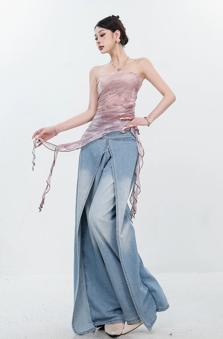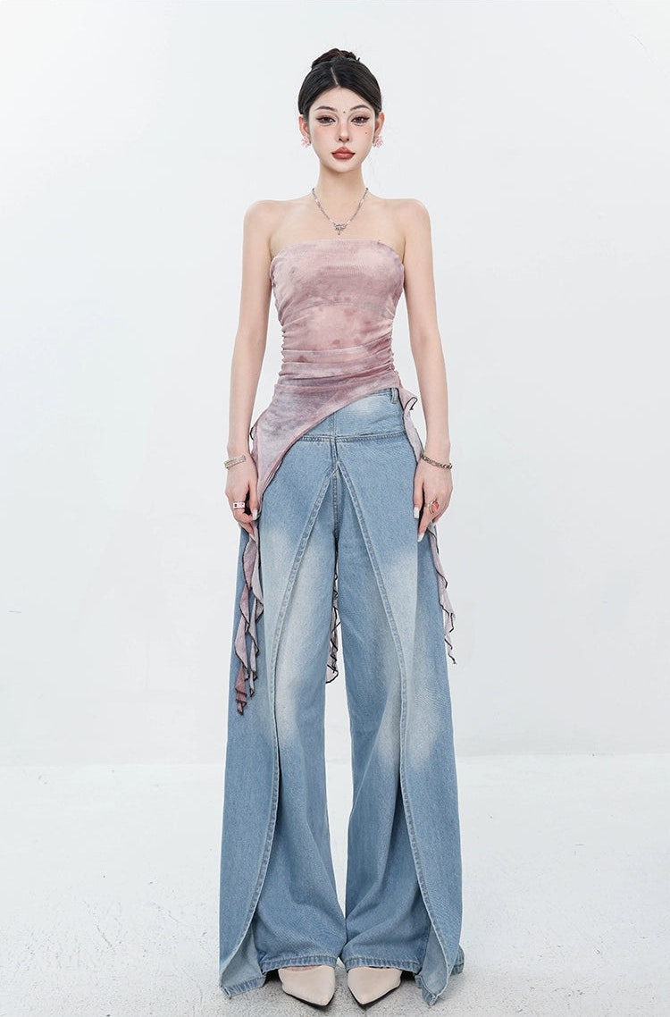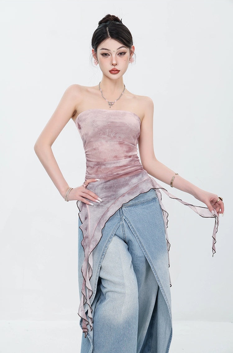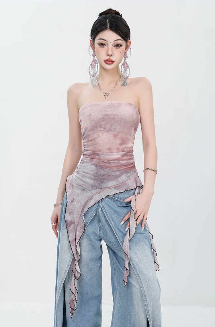 Tie-Dye Ruffled Mesh Tulle Tube Top