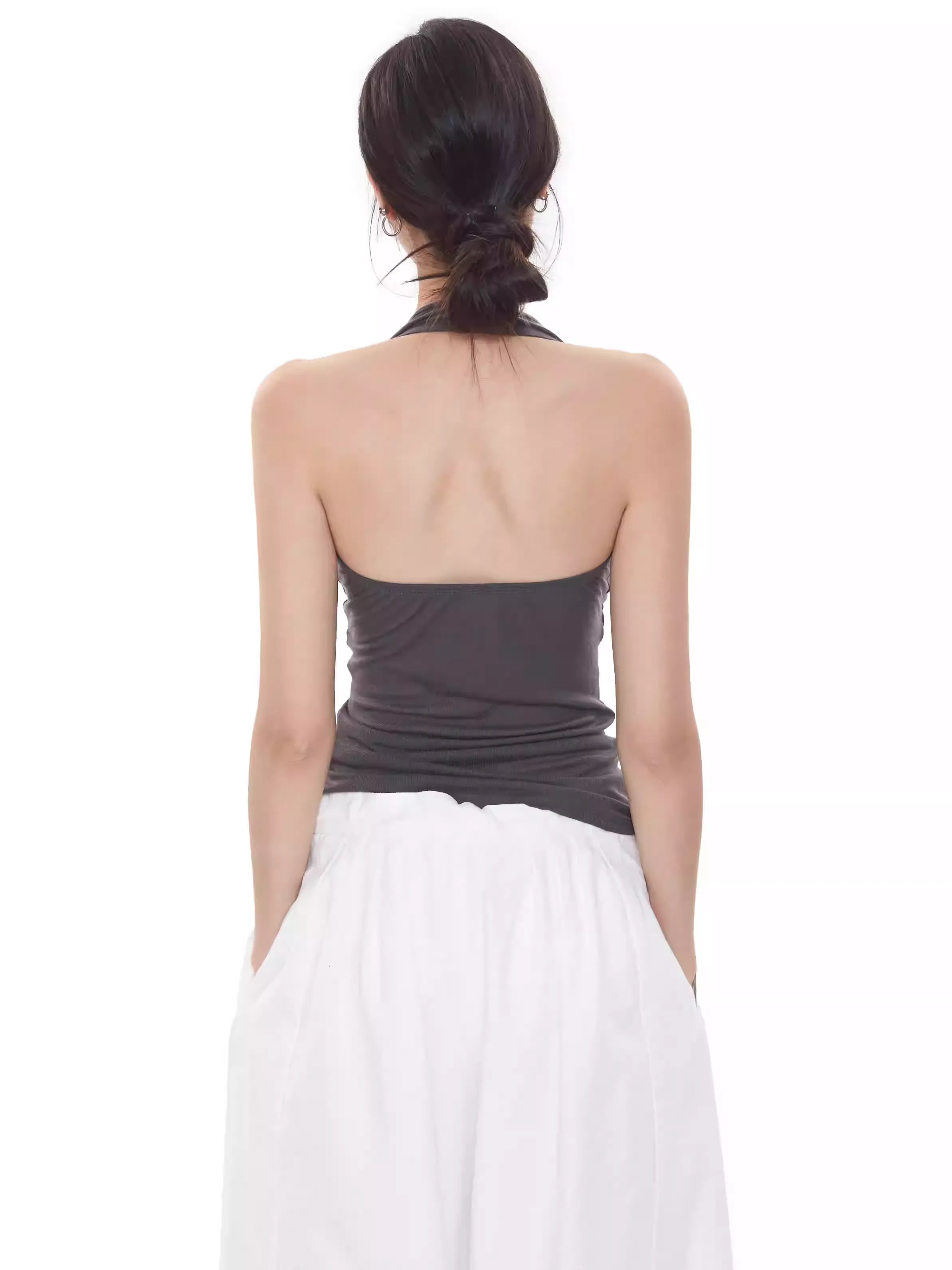 Designed with a lightweight, stretch fabric, it blends comfort and clean lines into an effortless wardrobe piece. Made from soft and breathable lyocell, the semi-sheer texture subtly adds dimension to the otherwise minimal silhouette. The open back and twisted front shape create a flattering structure whether you’re layering under jackets or wearing solo.