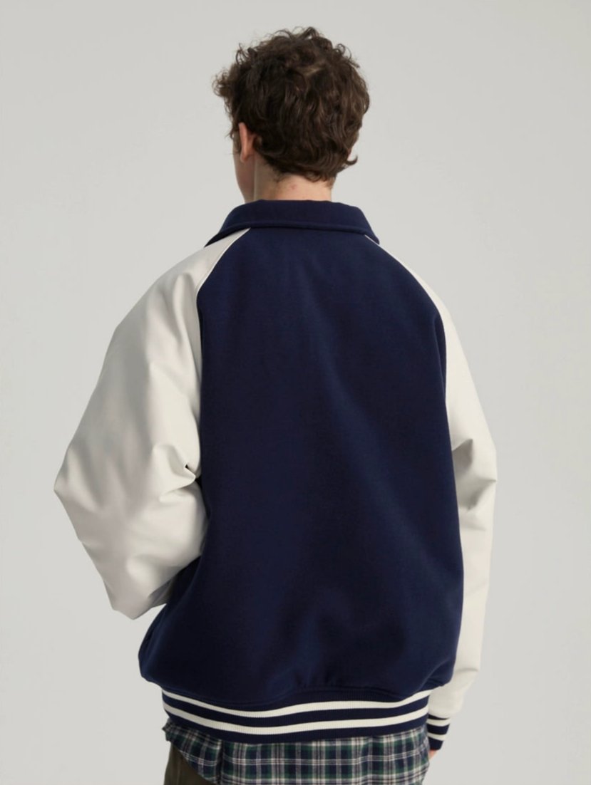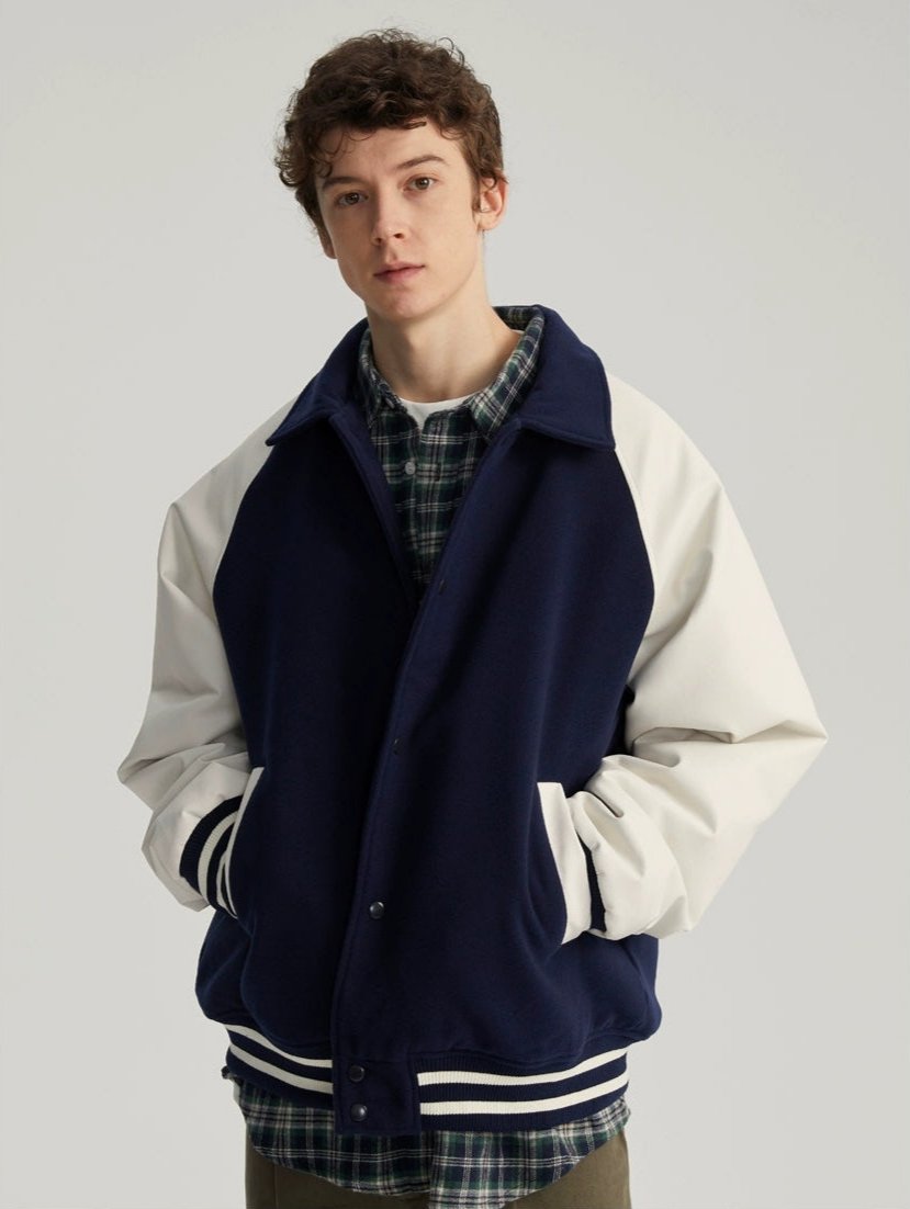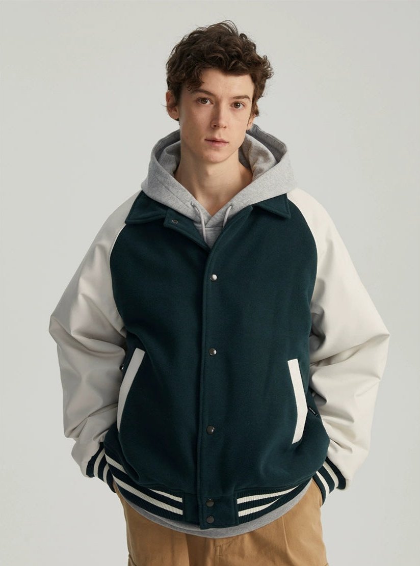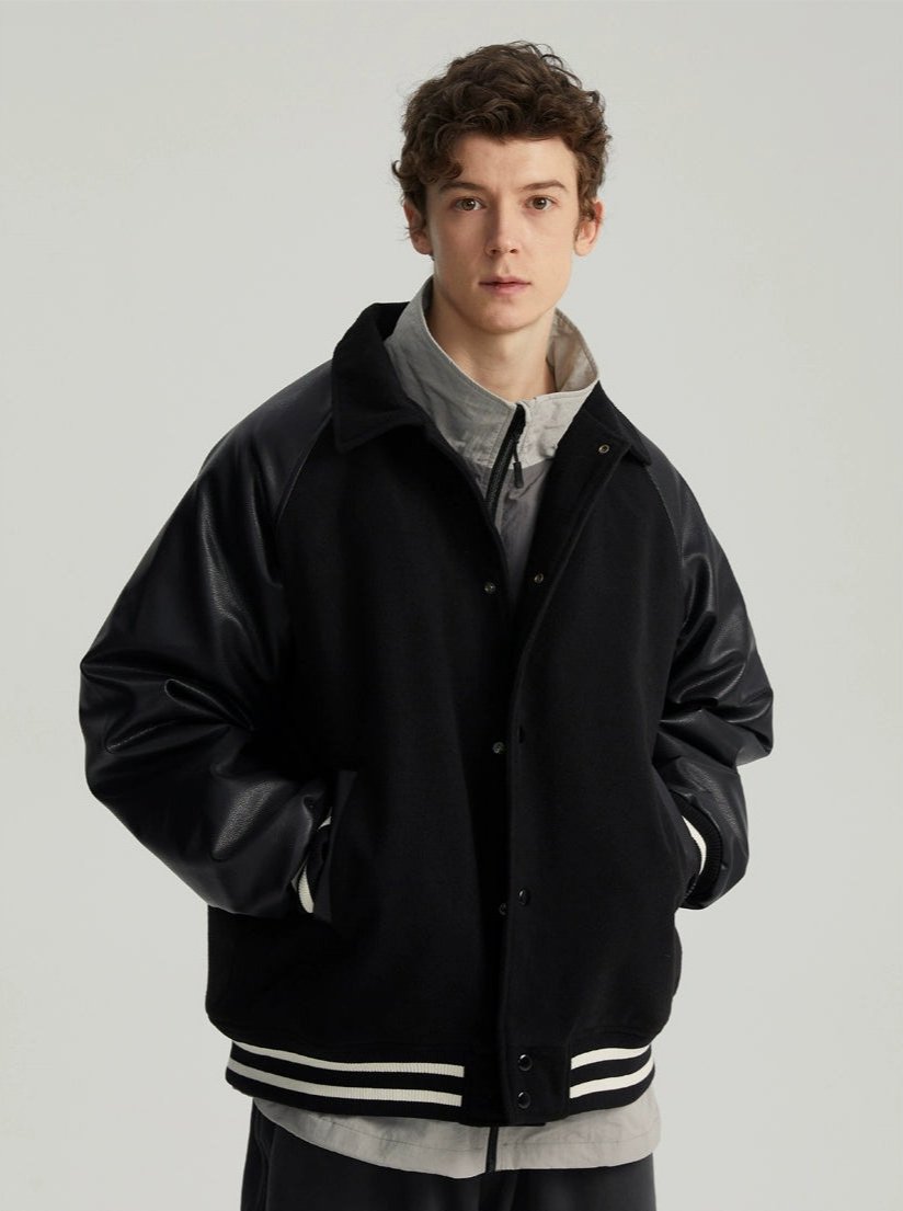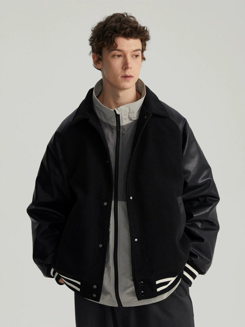 Read full Return PolicyExperience timeless style with a modern edge in our Varsity Bomber Jacket with Faux Leather Sleeves.