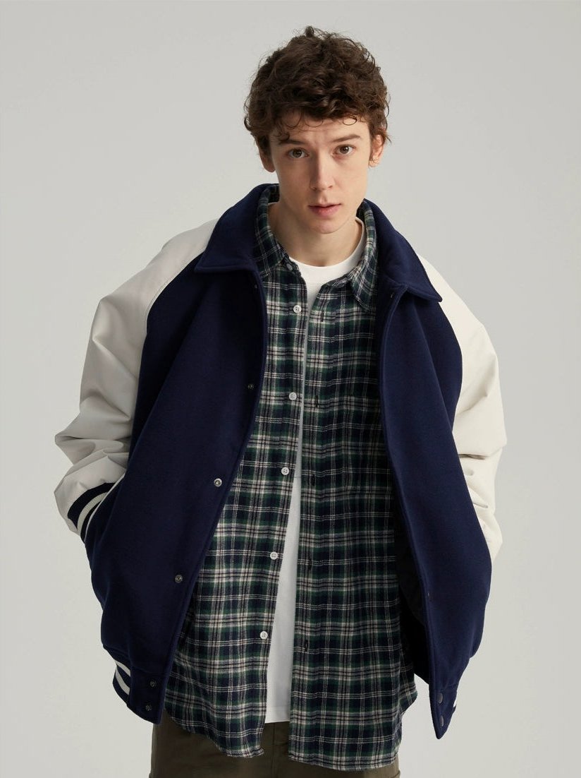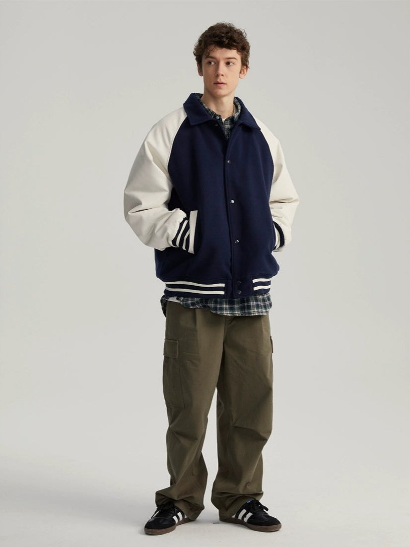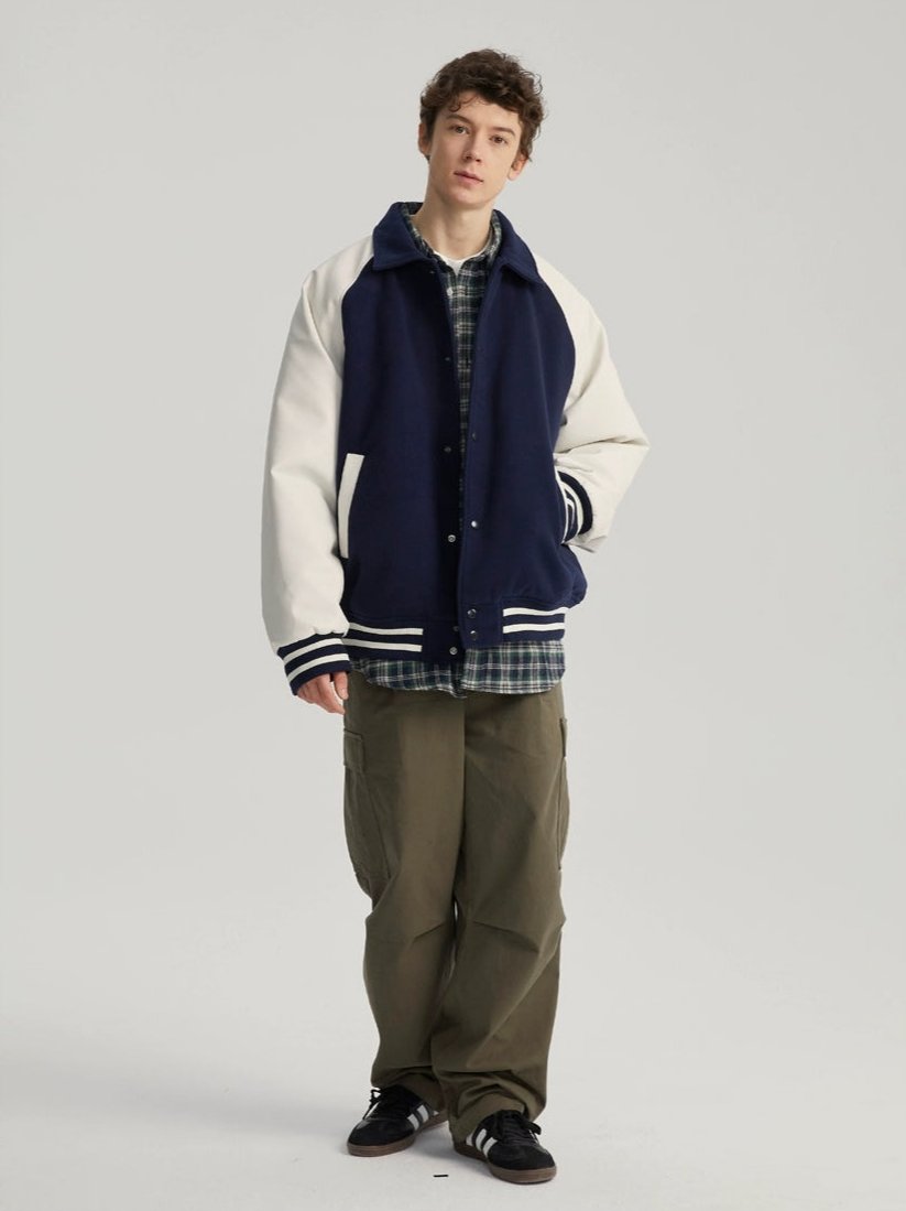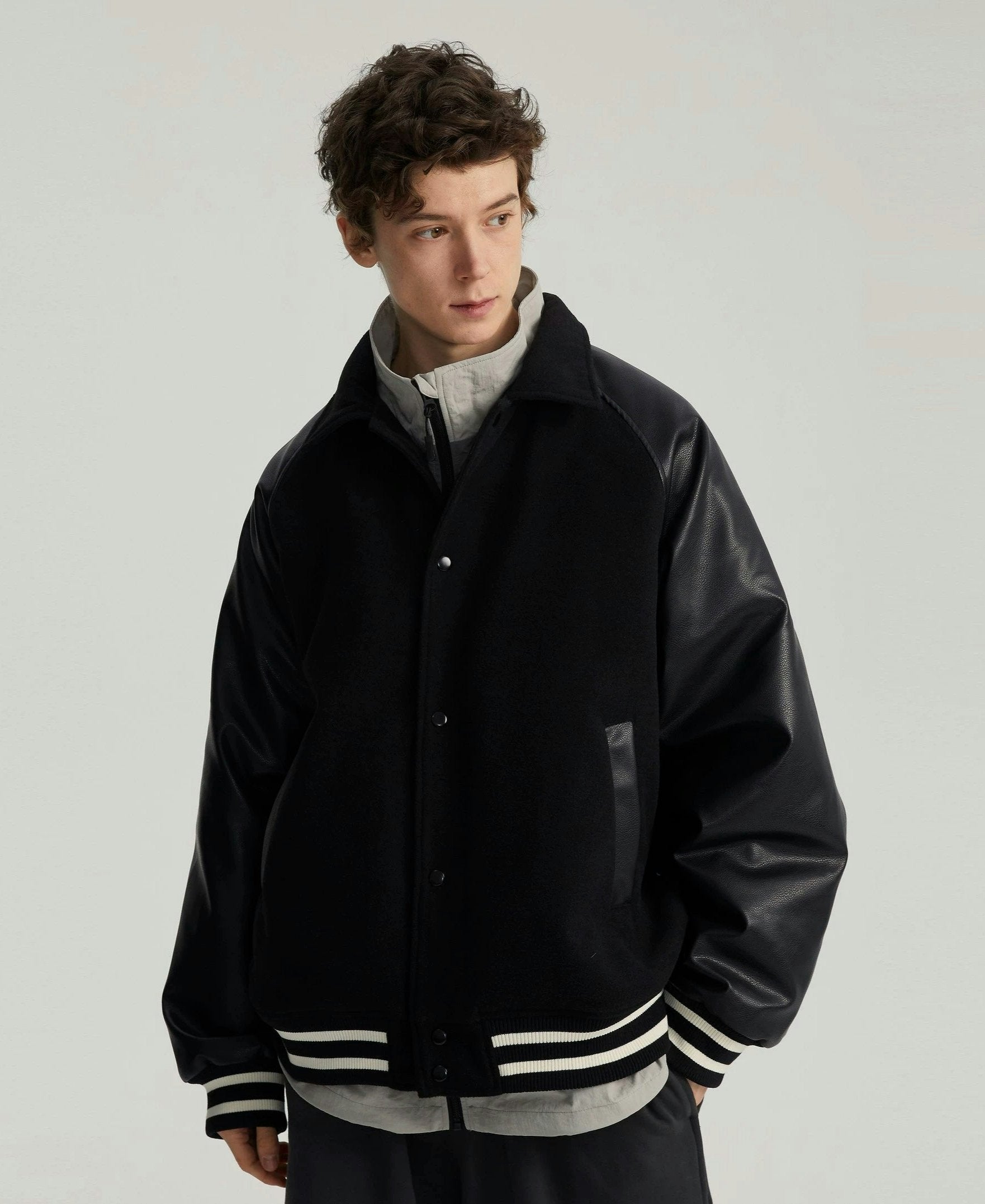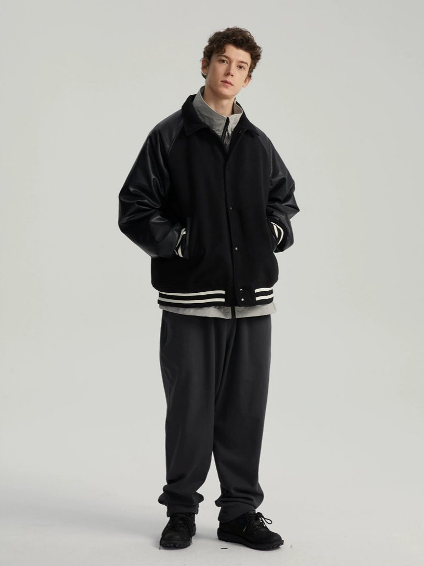 Read full Return PolicyExperience timeless style with a modern edge in our Varsity Bomber Jacket with Faux Leather Sleeves.