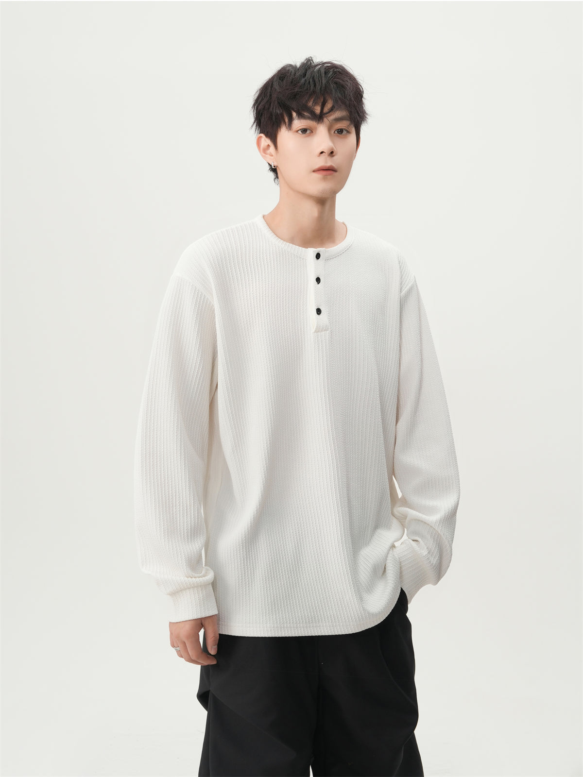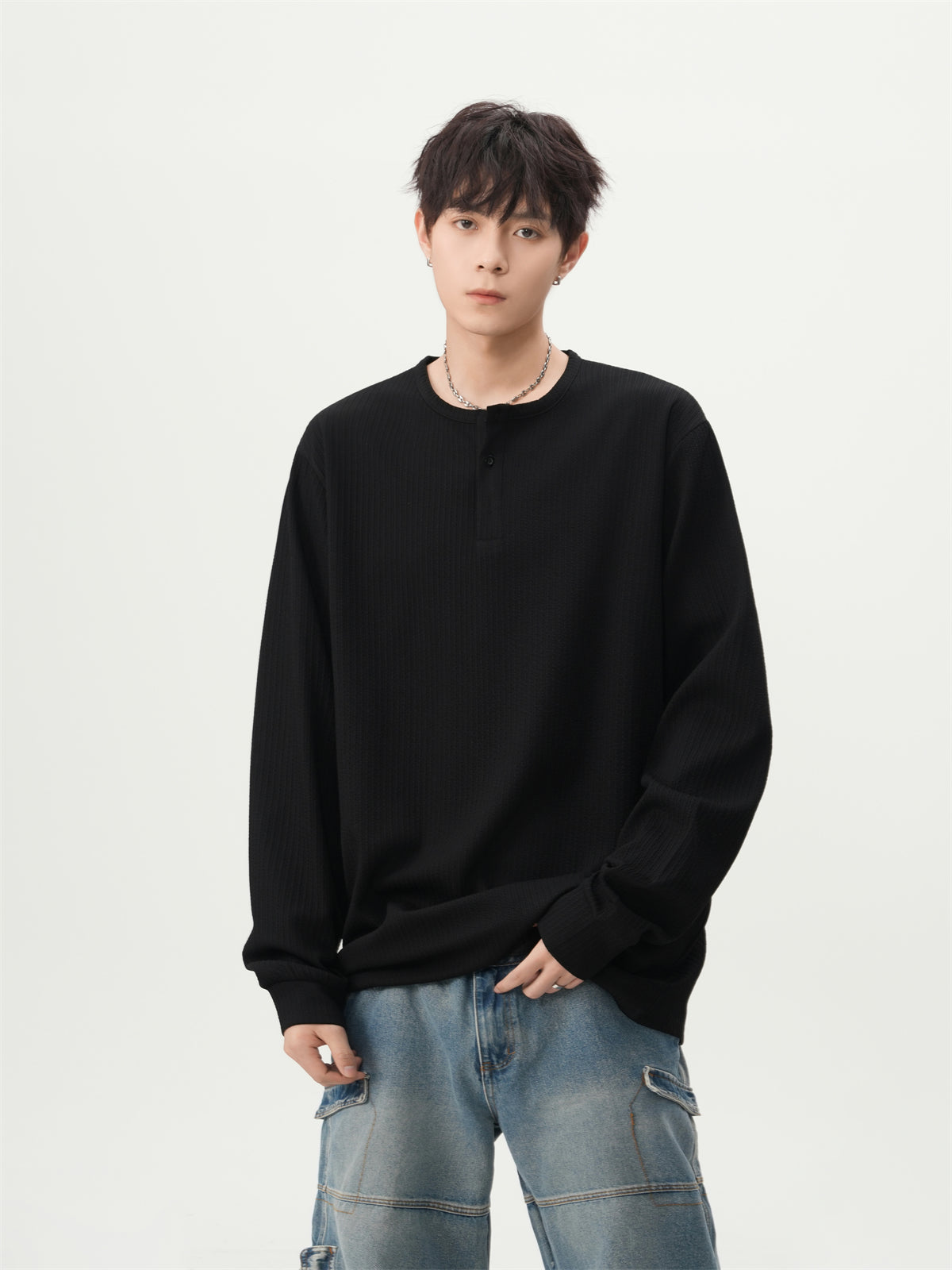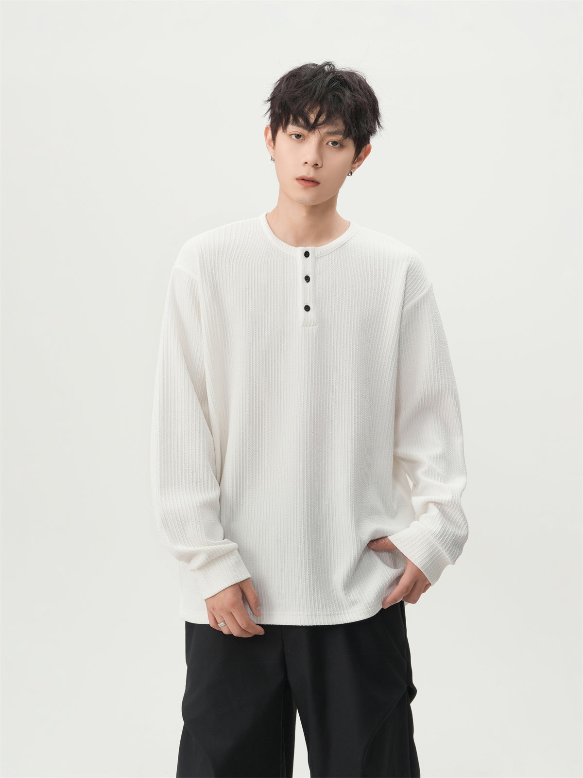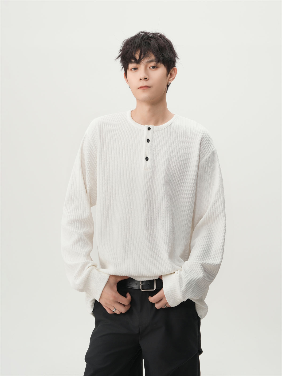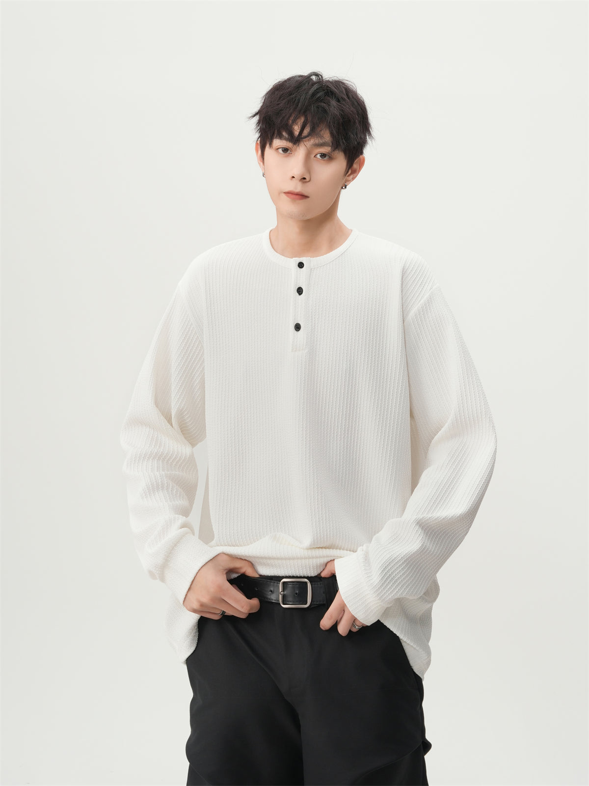 Designed with a half-button front and a classic henley neckline, it’s a staple that speaks for itself—clean, modern, and versatile. The textured waffle knit adds just the right amount of depth, elevating a simple long-sleeve to something with grip. Cut in a relaxed fit, it drapes with ease, making it ideal for layering or wearing solo. The soft-yet-durable fabric blend ensures all-day comfort without losing structure. Wear it buttoned up for a polished look or leave it undone for a more undone, effortless vibe.