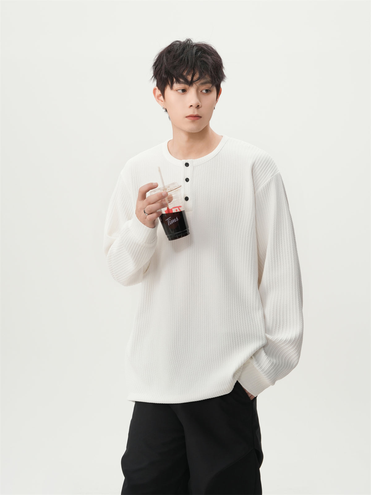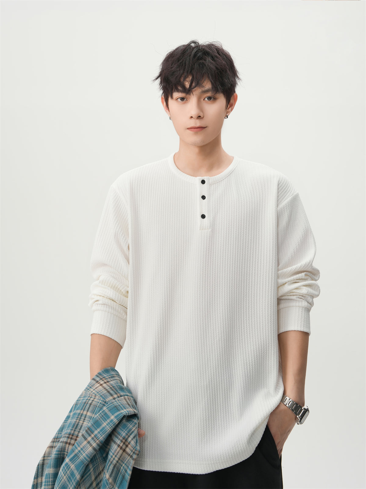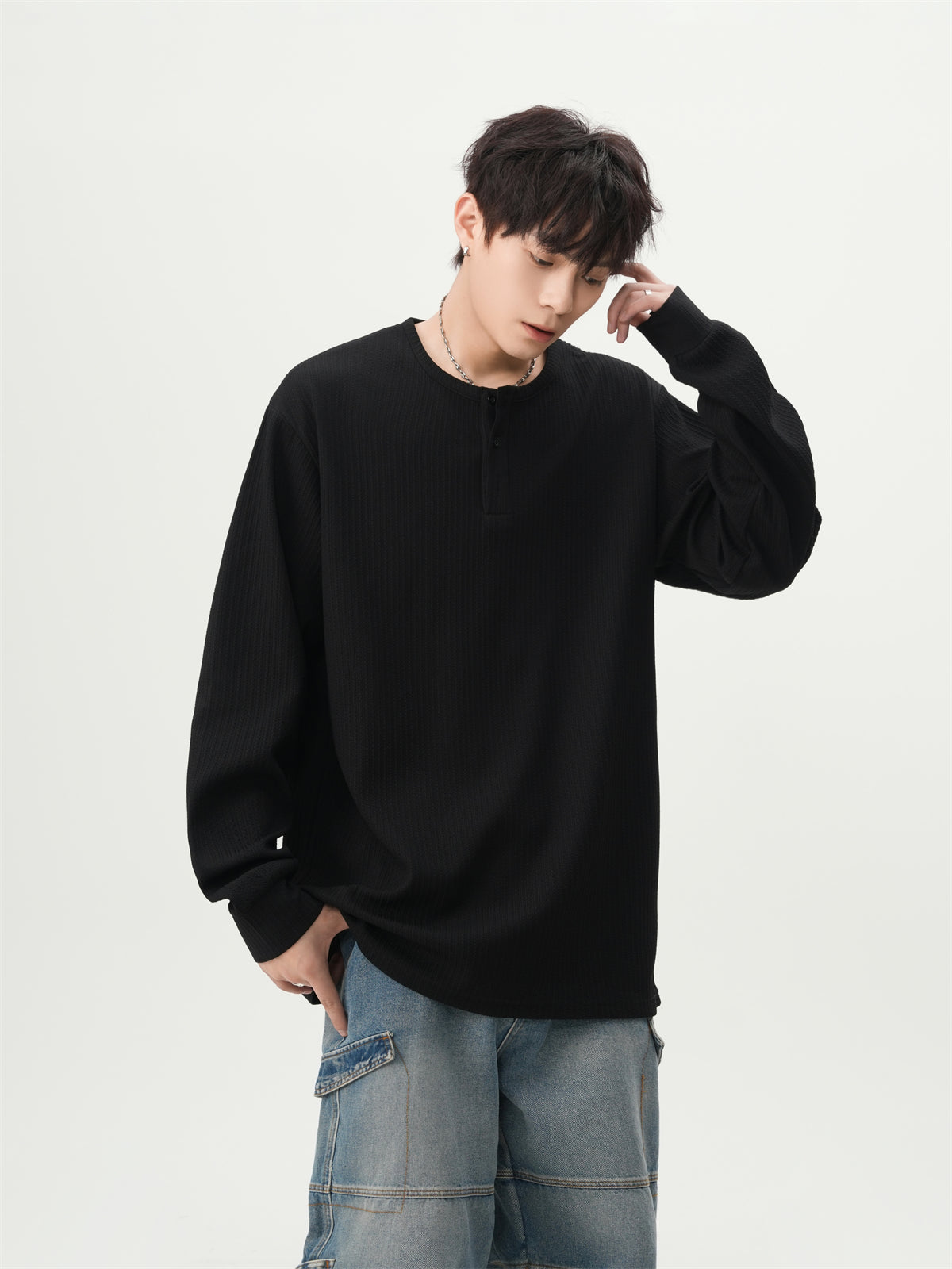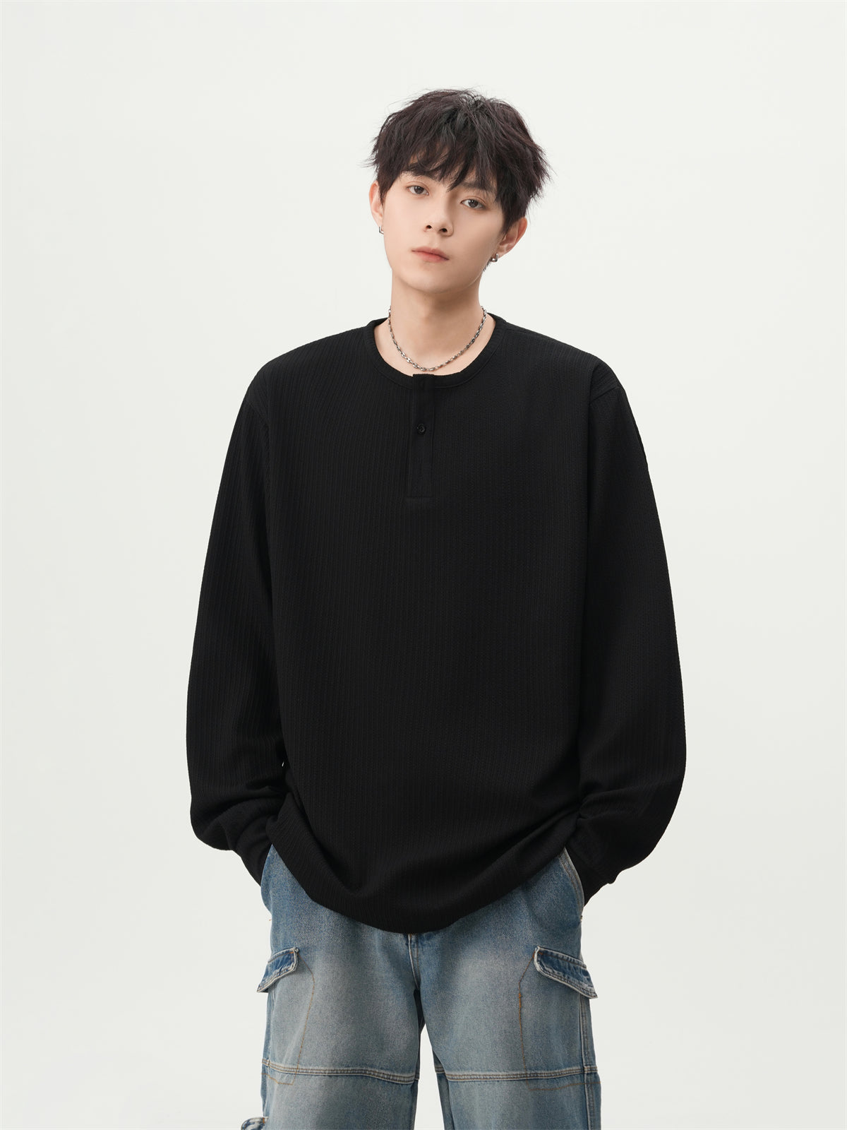 Designed with a half-button front and a classic henley neckline, it’s a staple that speaks for itself—clean, modern, and versatile. The textured waffle knit adds just the right amount of depth, elevating a simple long-sleeve to something with grip. Cut in a relaxed fit, it drapes with ease, making it ideal for layering or wearing solo. The soft-yet-durable fabric blend ensures all-day comfort without losing structure. Wear it buttoned up for a polished look or leave it undone for a more undone, effortless vibe.