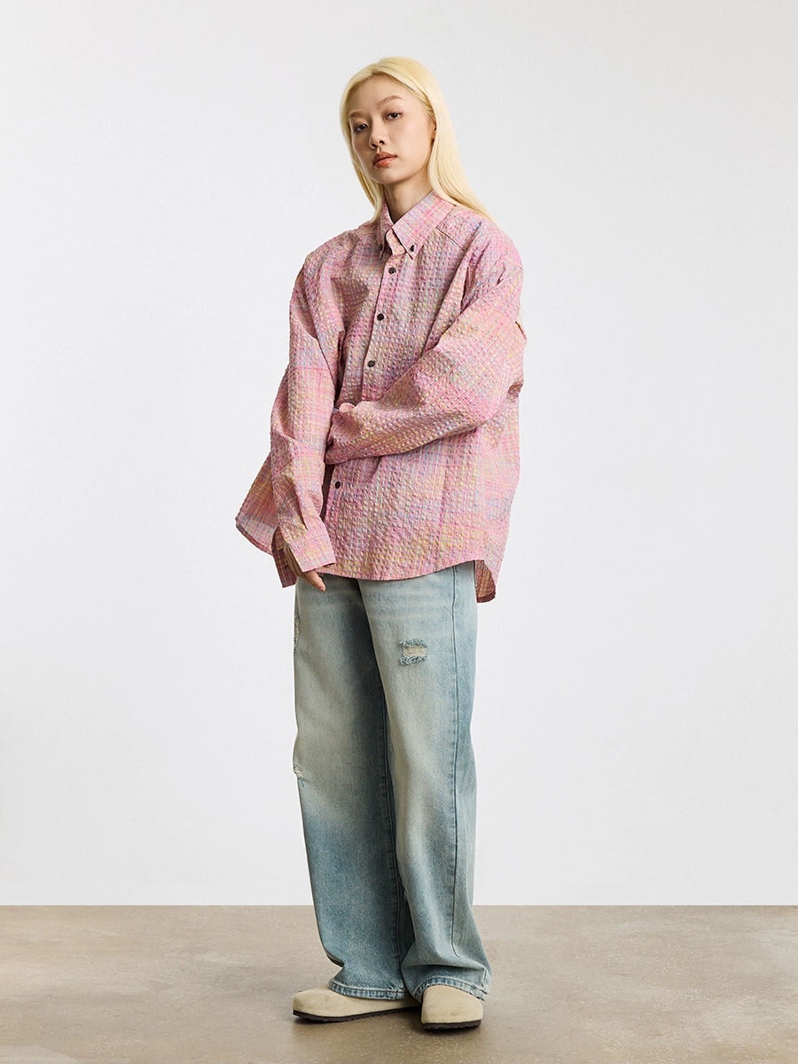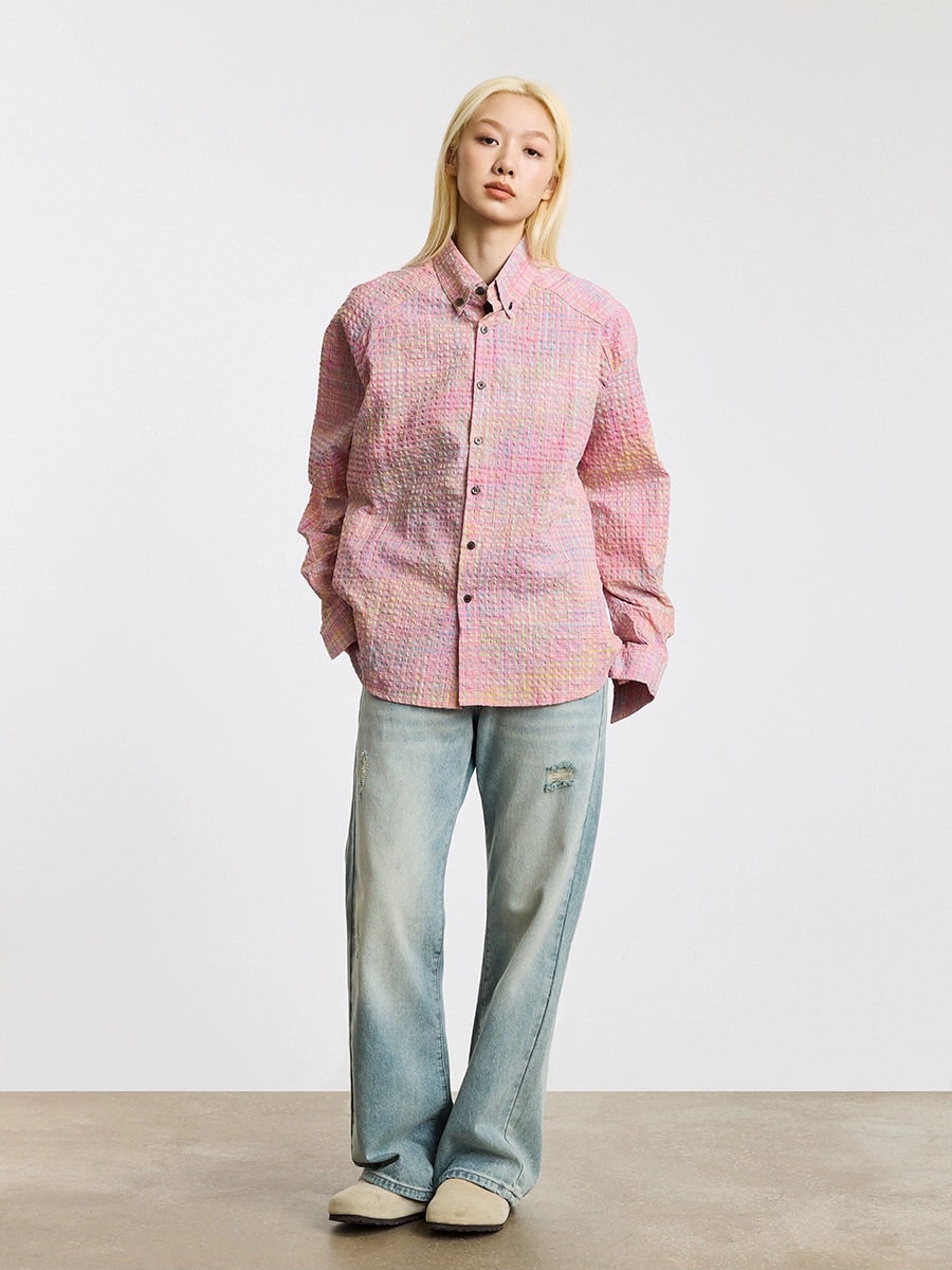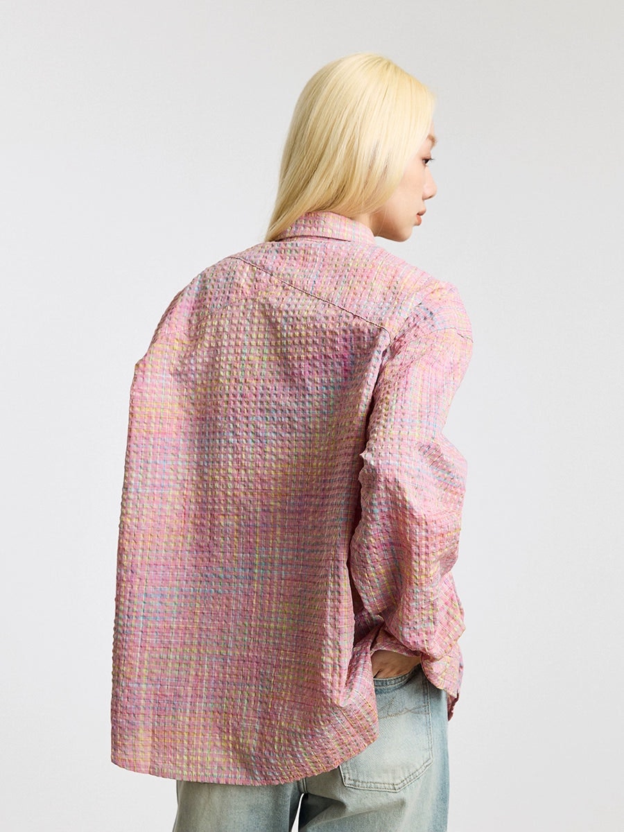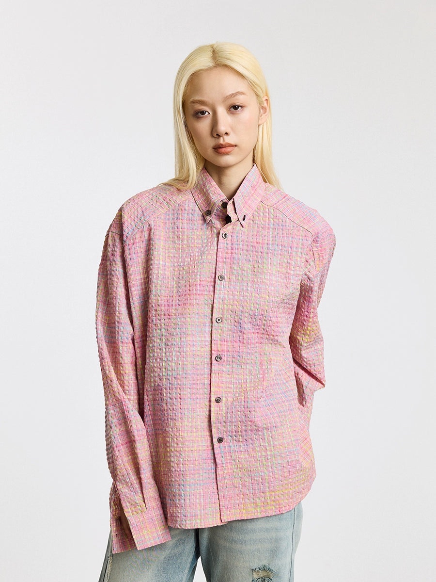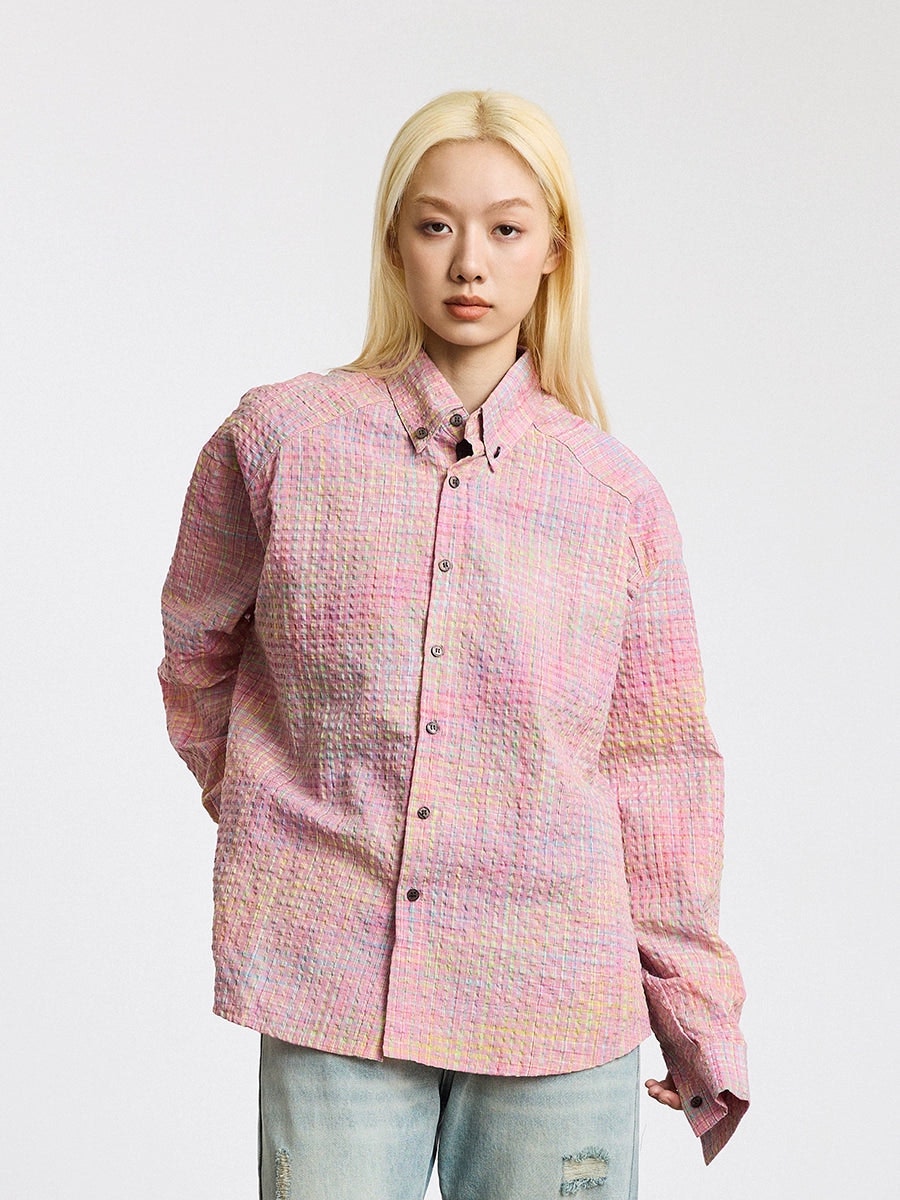 Crafted with attention to detail, this long sleeve shirt features a distinctive waffle texture that adds a touch of edgy elegance to your outfit. The breathable fabric ensures a seamless transition from a relaxed daytime look to an enigmatic evening ensemble, while the classic sword collar and gradient fuchsia pattern underscore the shirt's unique aesthetic.