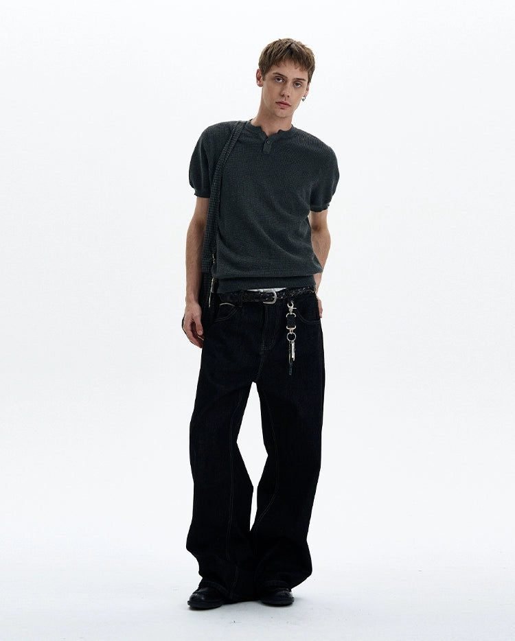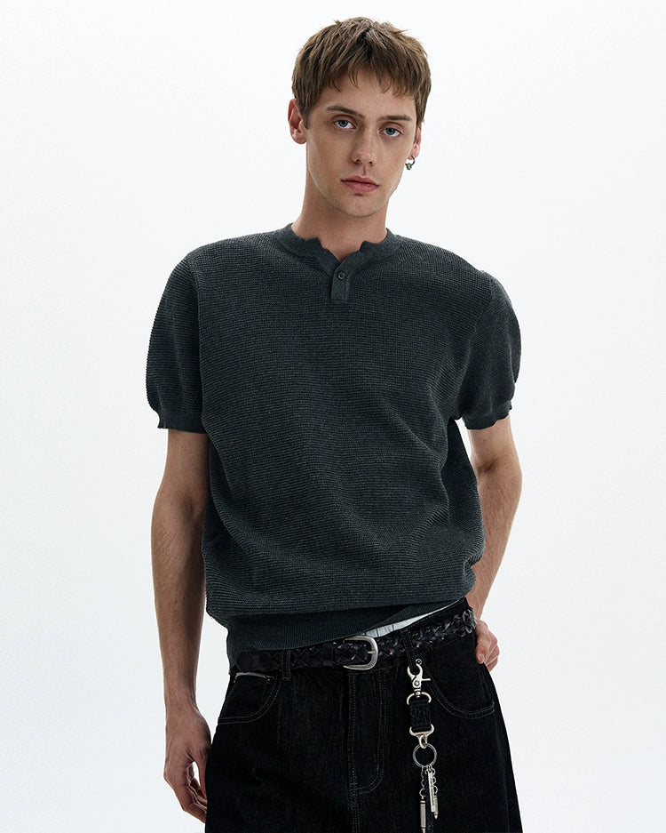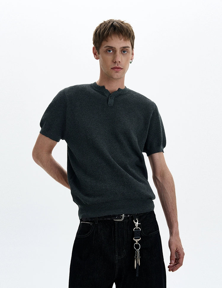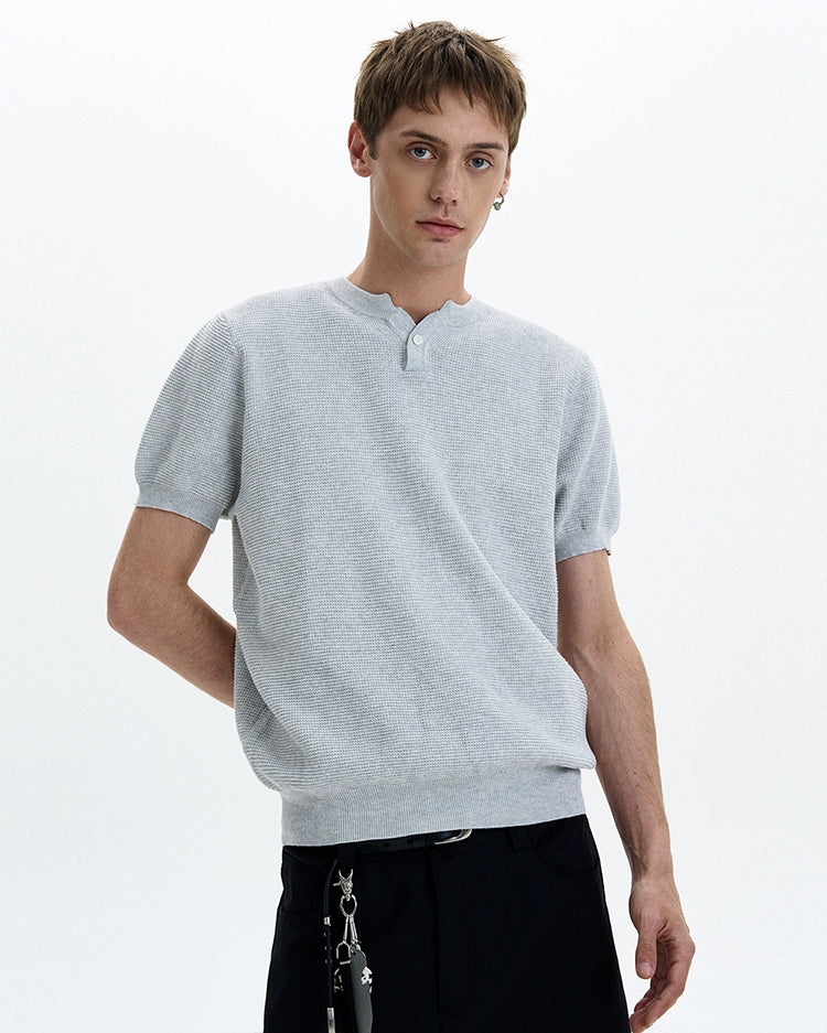 Clean lines, relaxed structure, and everyday comfort make this top an easy staple that fits into any low-key rotation. Made from a lightweight knit, it’s soft to the touch but holds its form, finished with a minimal placket and tonal buttons for a streamlined look. The square-knit texture adds a touch of depth while remaining breathable and versatile for layering or wearing on its own.