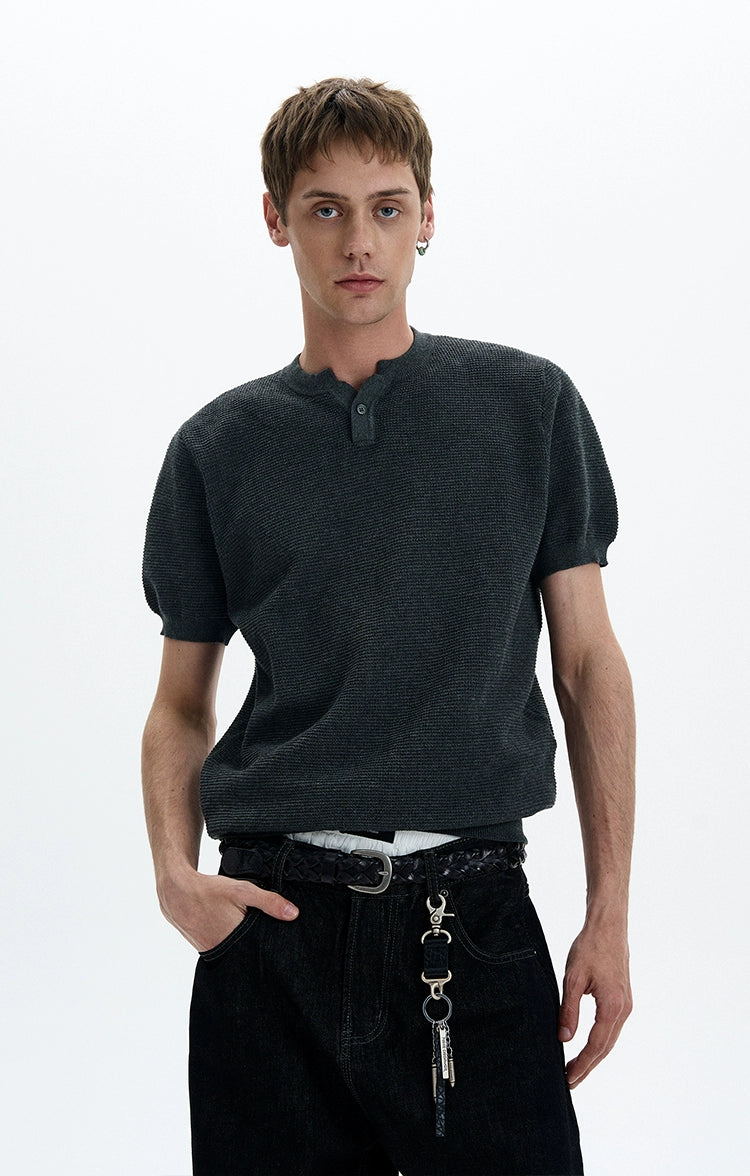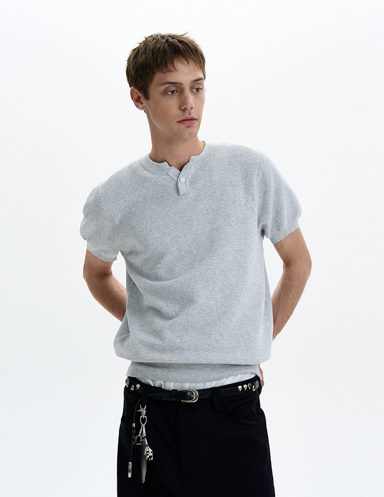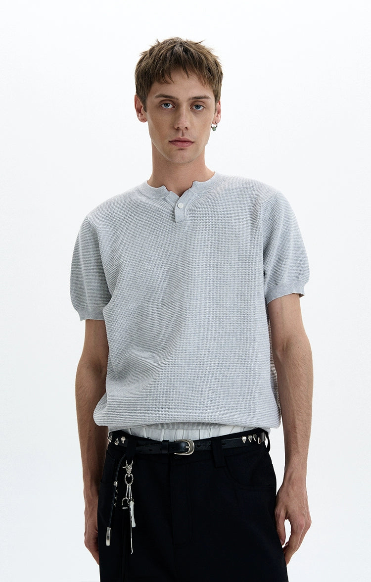 Waffle Textured Short Sleeve Henley Knit Lightweight Top