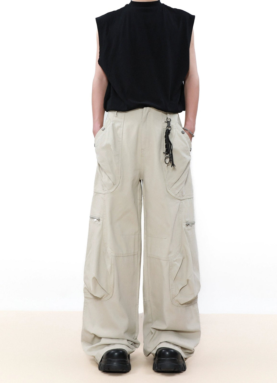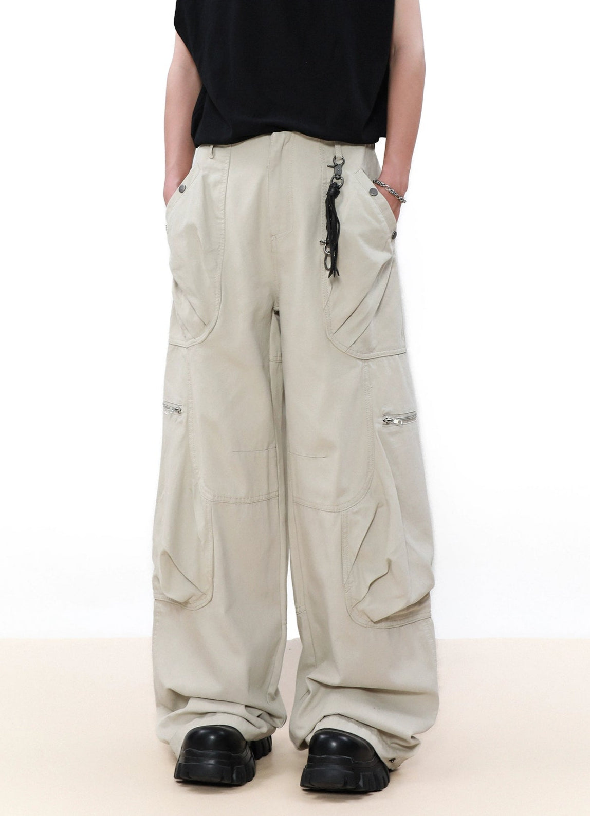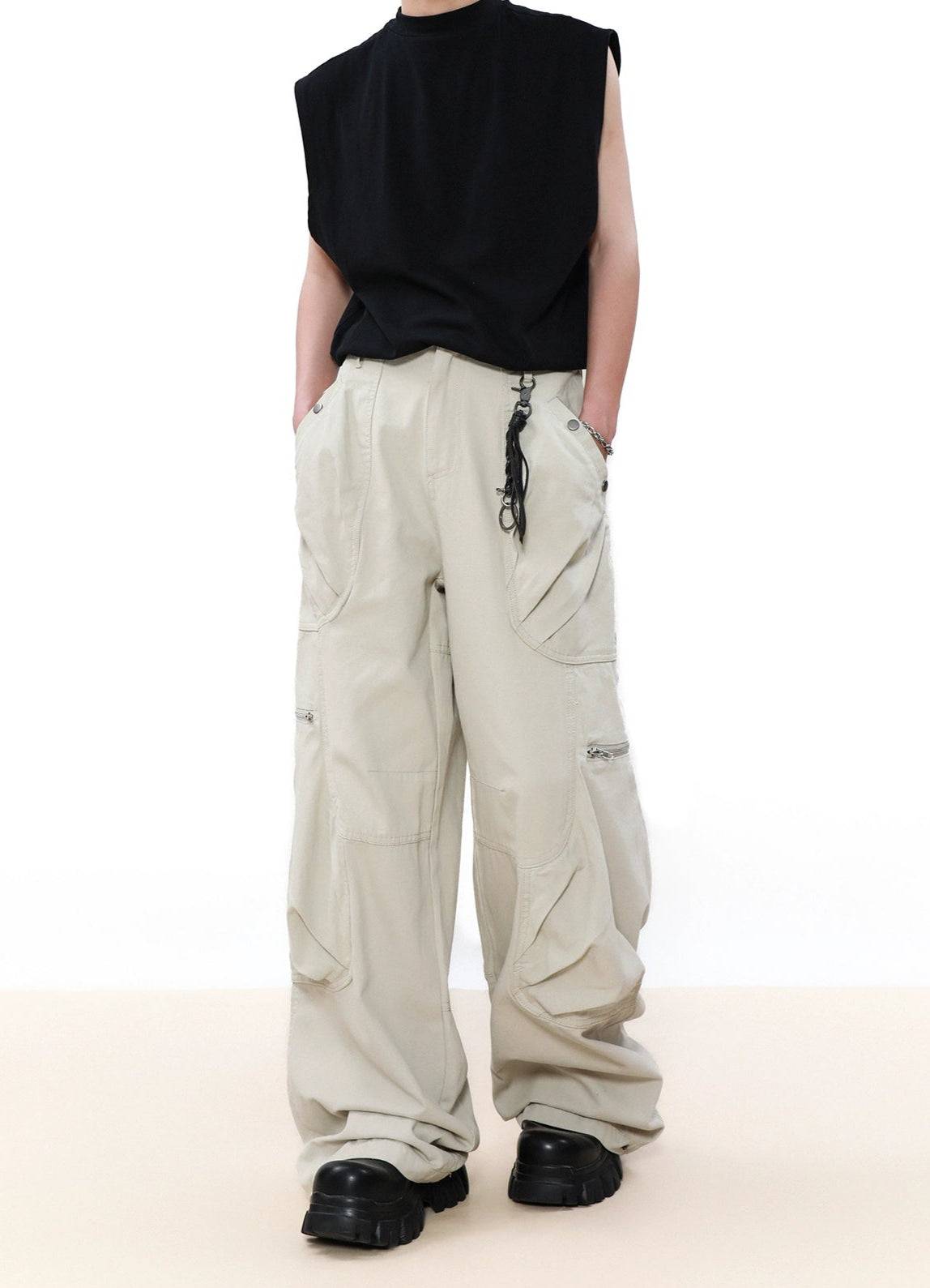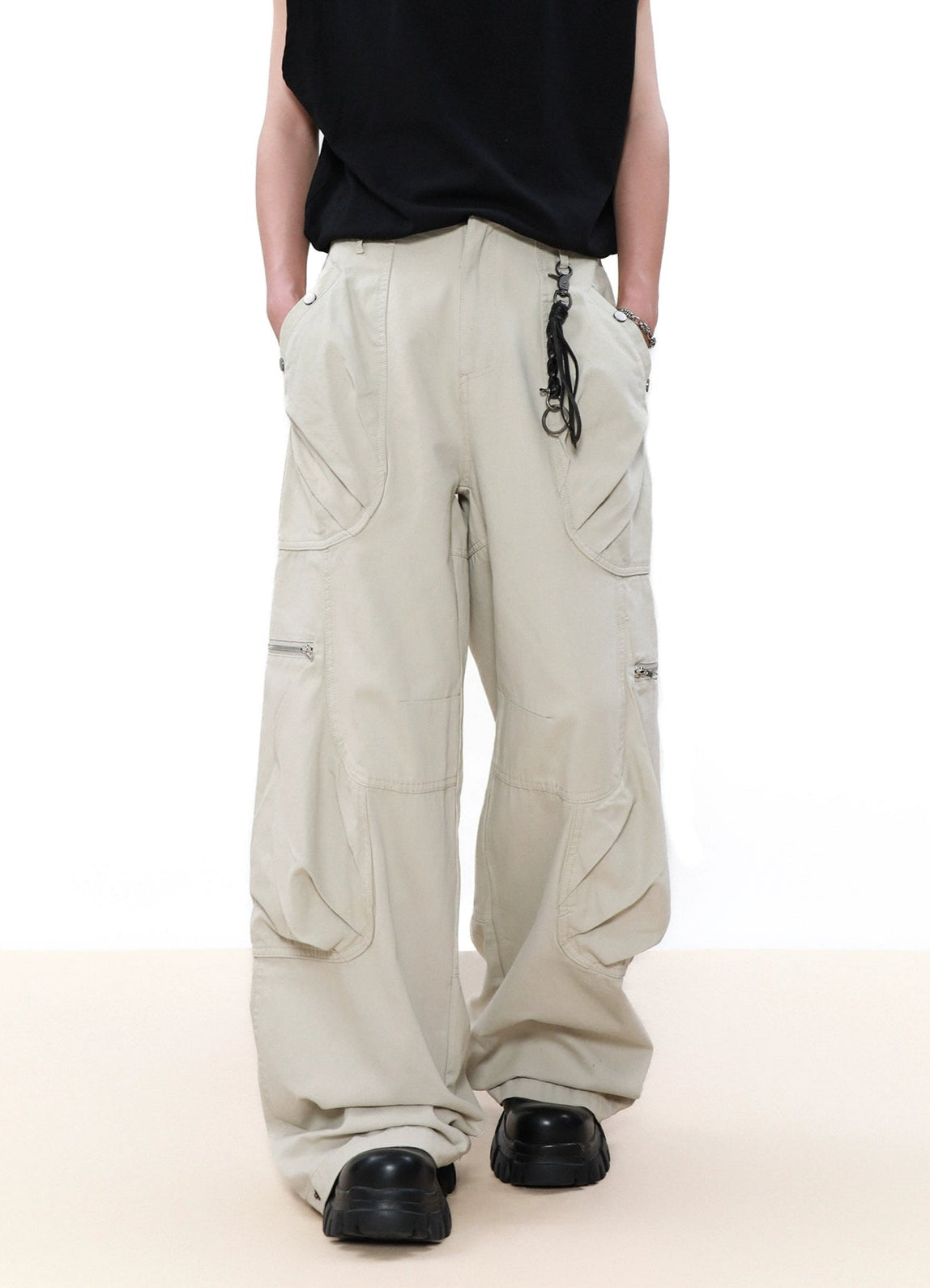 Perfect for those who want to strike a balance between utility and modern streetwear aesthetics. Crafted from 100% cotton, these pants offer a smooth, breathable feel, making them ideal for all-day wear. The mid-rise waist and loose, straight fit combine comfort with a relaxed vibe, while subtle pleats and zipper detailing elevate their design. Their sturdy, medium-weight fabric ensures durability without compromising on comfort.