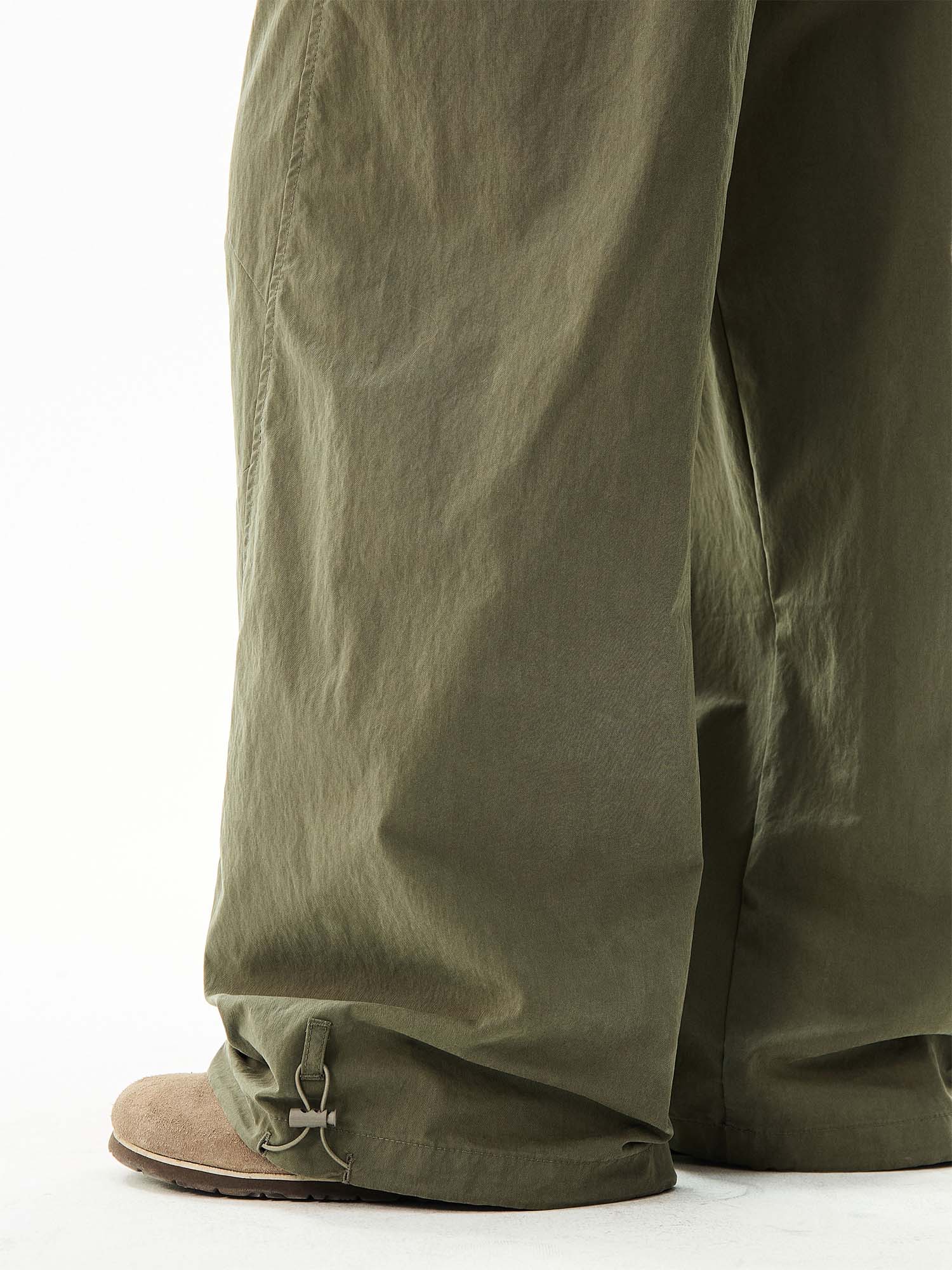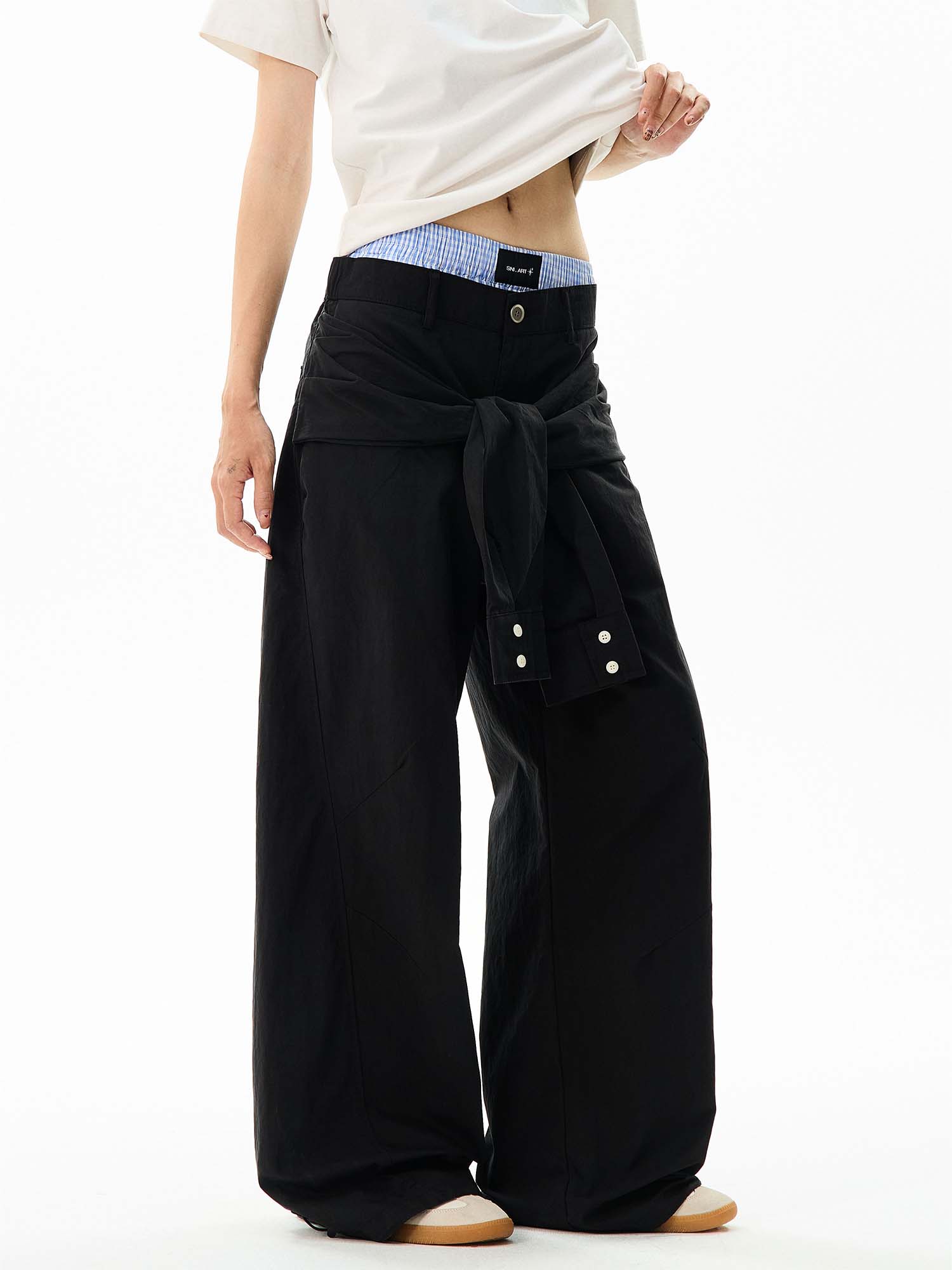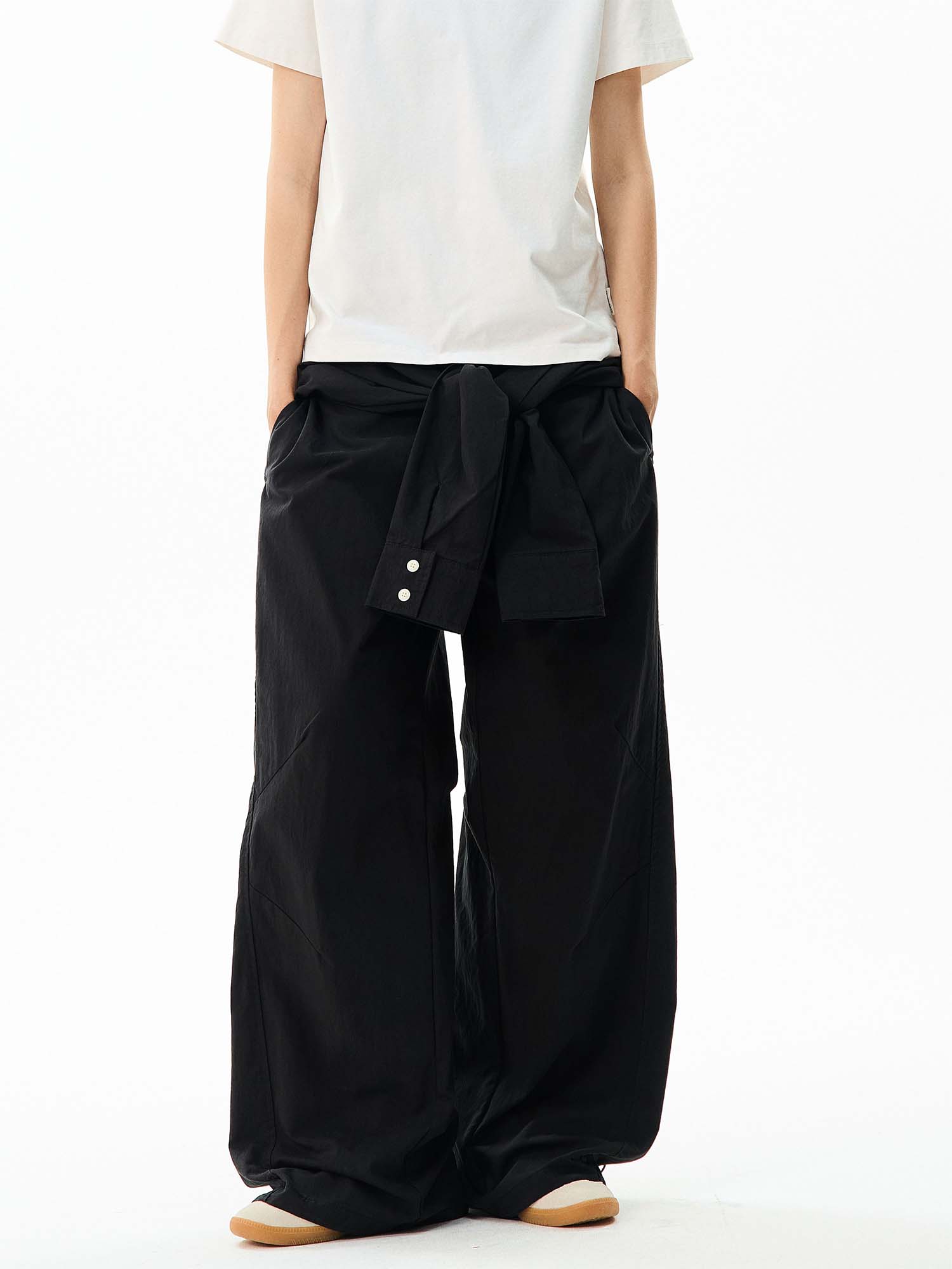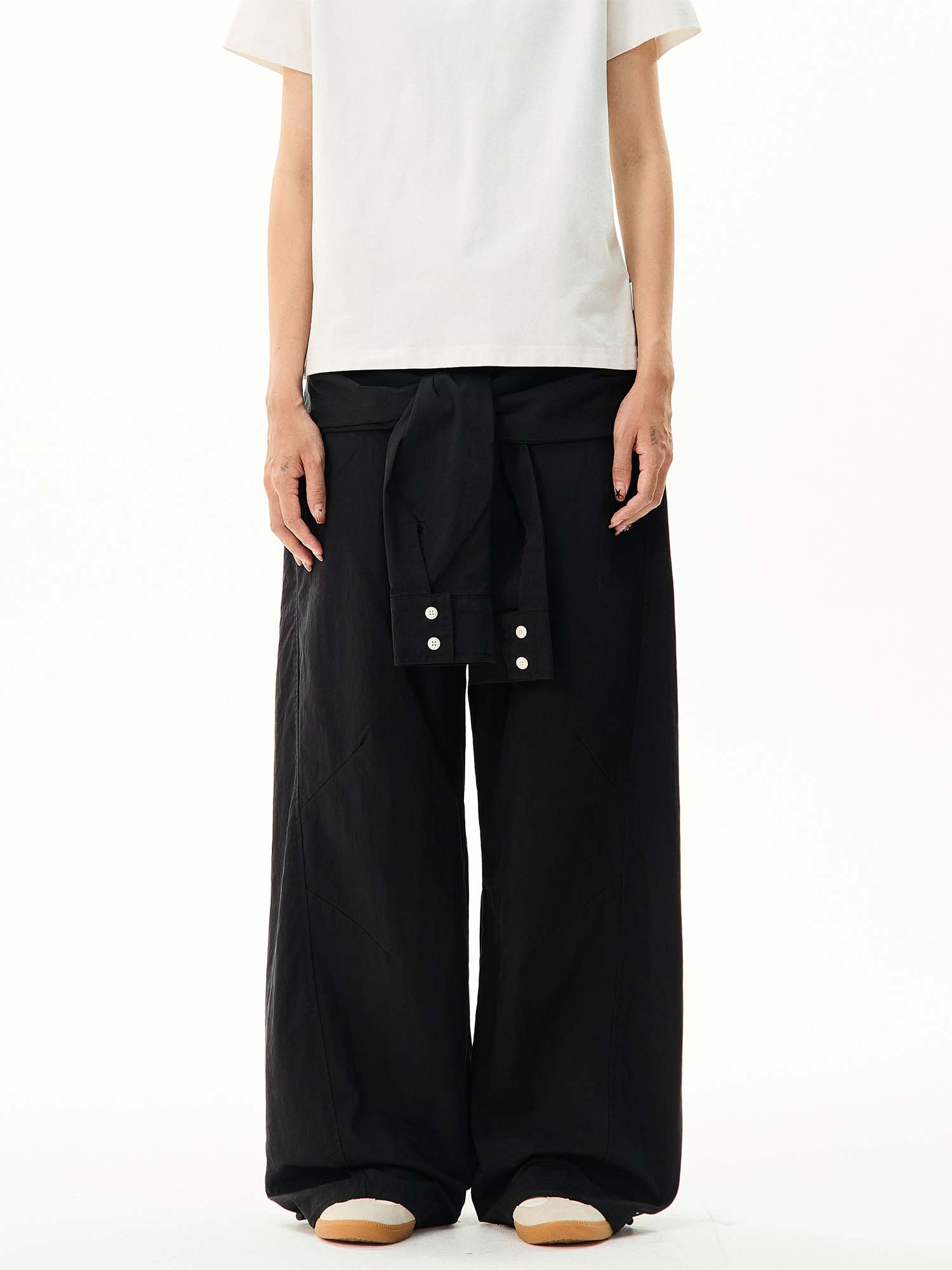 These pants feature a statement wraparound belt detail for an elevated edge, perfect for making a bold yet understated statement. Expertly crafted with a cotton-nylon blend, their soft yet durable fabric provides all-day comfort while maintaining a sturdy structure. The wide-leg design brings a nonchalant charm, while functional pockets and subtle stitching add a touch of retro utility.