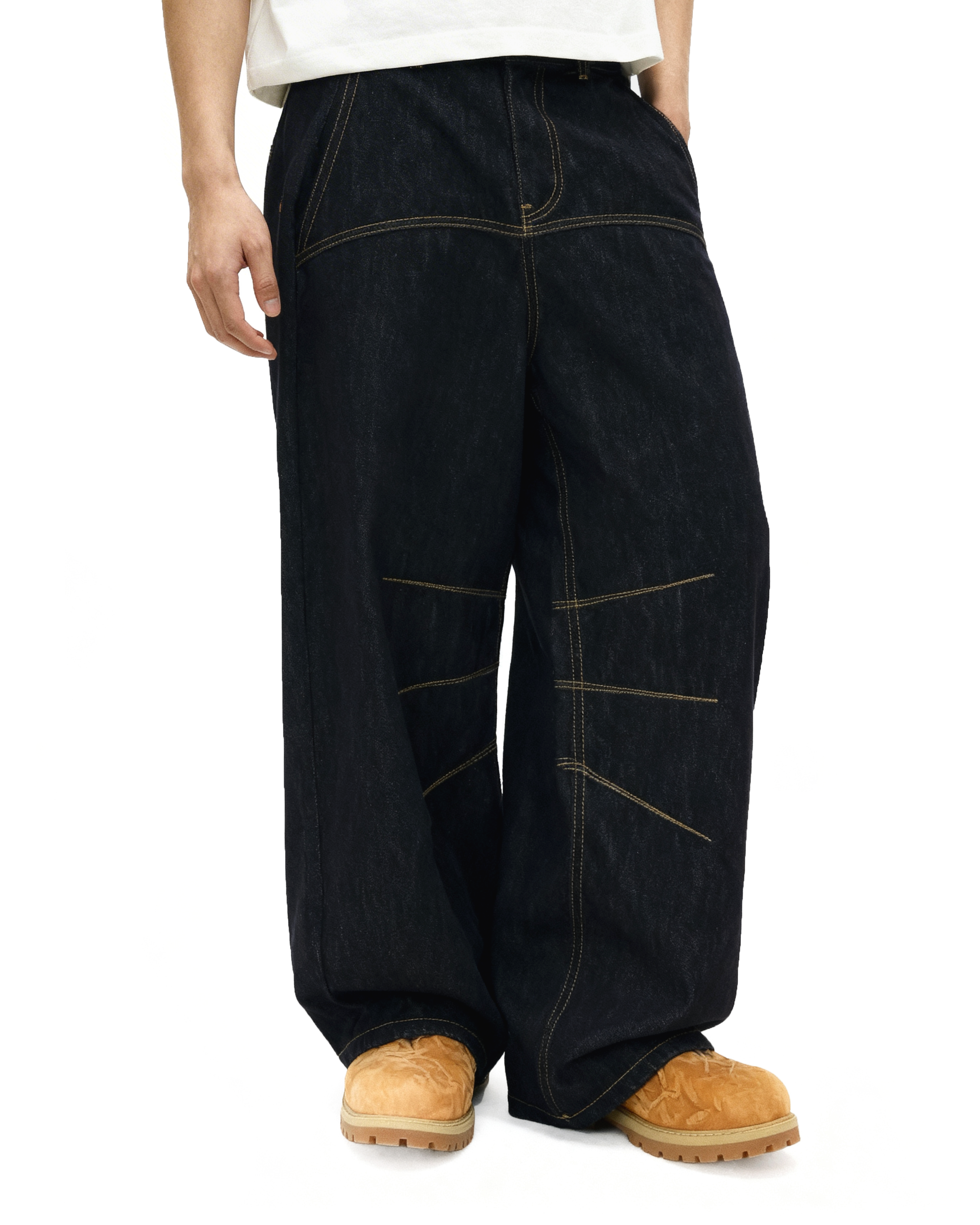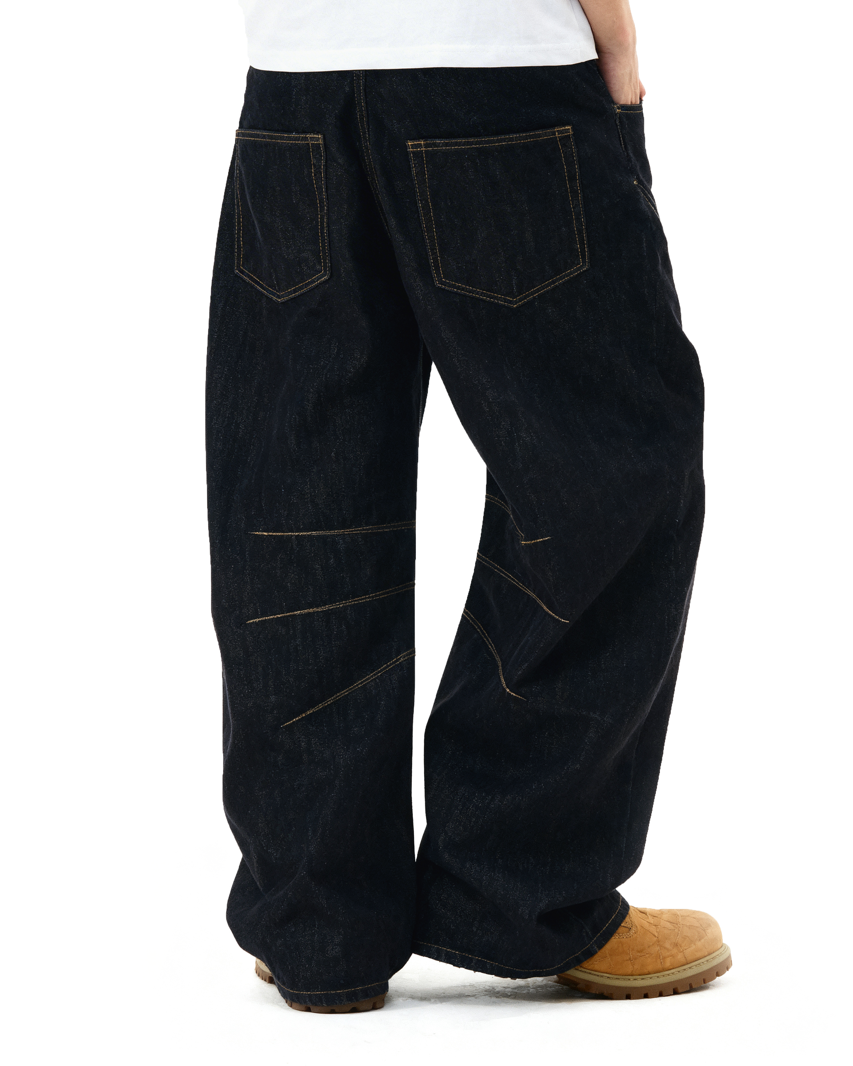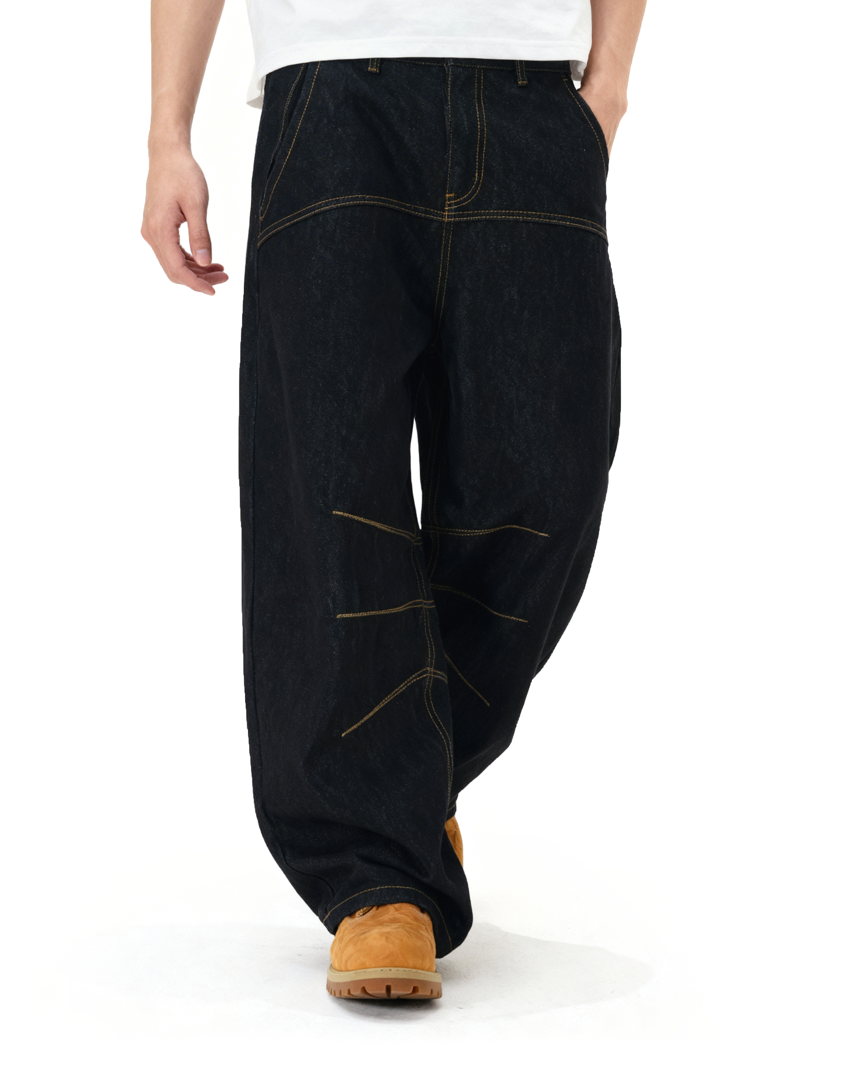 Crafted from heavyweight raw denim, the texture is slightly slubbed for a more rugged look and lived-in feel over time. Yellow contrast seams run across the front and legs, breaking up the deep black tone with visual structure. The oversized fit adds movement and breathability without sacrificing attitude.