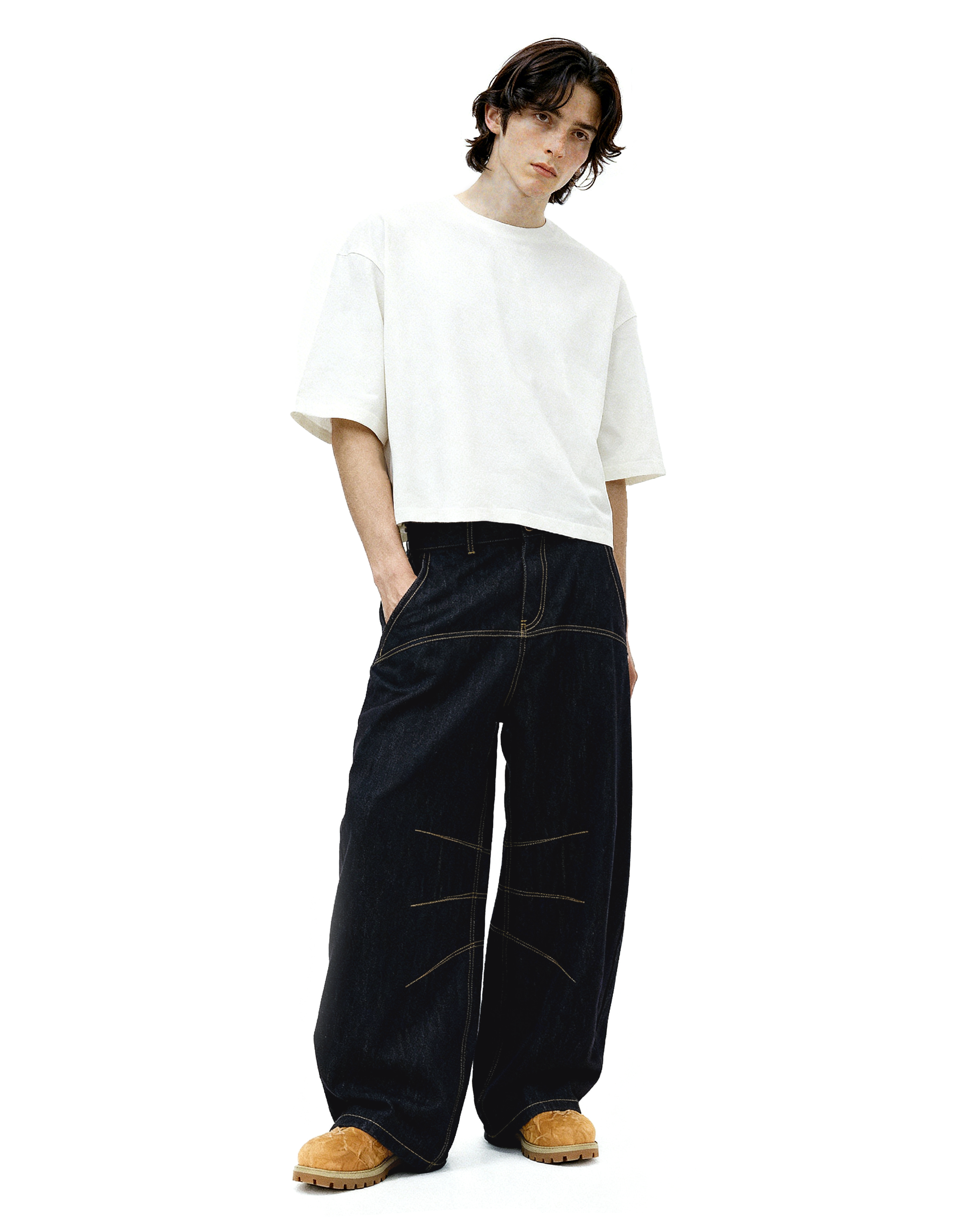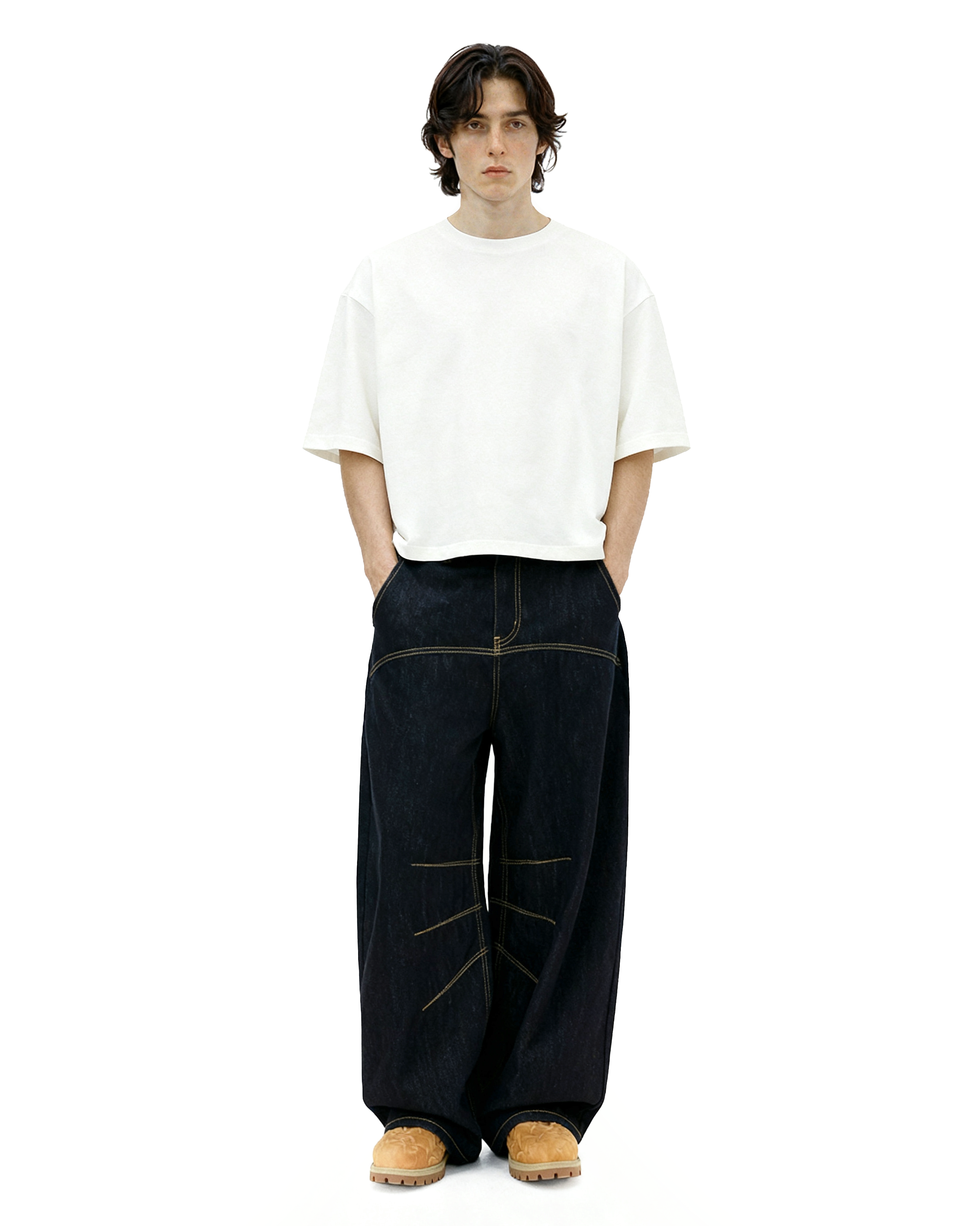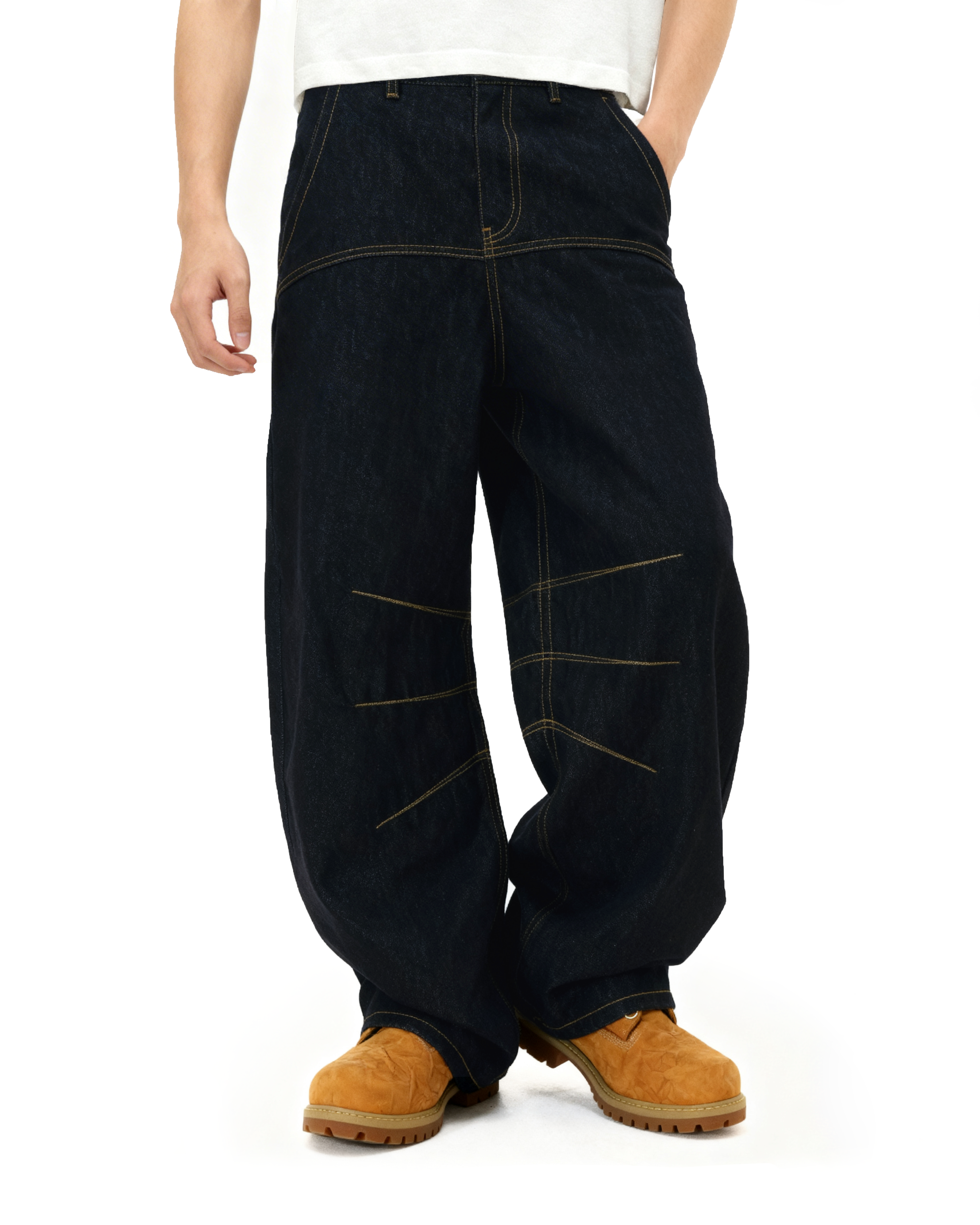 Crafted from heavyweight raw denim, the texture is slightly slubbed for a more rugged look and lived-in feel over time. Yellow contrast seams run across the front and legs, breaking up the deep black tone with visual structure. The oversized fit adds movement and breathability without sacrificing attitude.