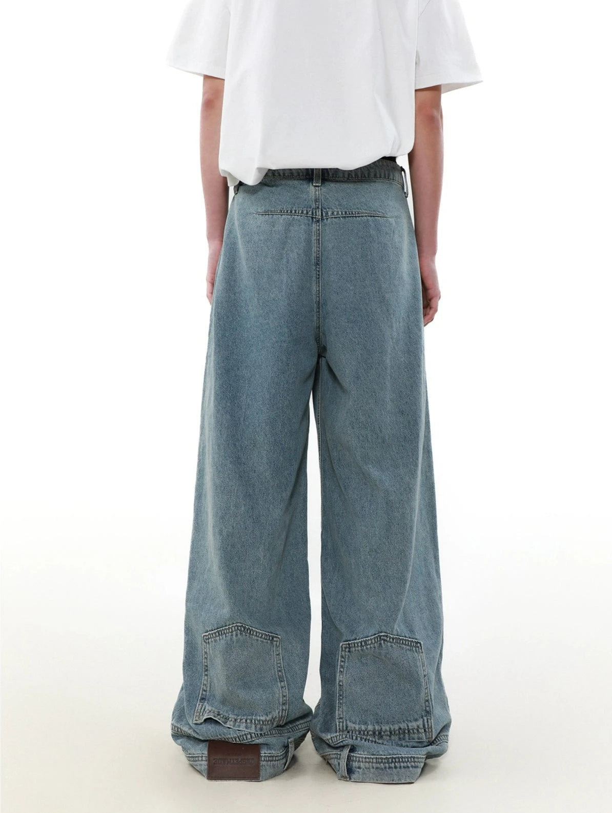 Crafted from robust denim fabric, these jeans combine a unique upside-down construction with eye-catching contrast stitching for a standout look. The wide-leg cut and nonrestrictive fit cater to comfort without sacrificing style, perfect for individuals who appreciate thoughtful craftsmanship and design details.