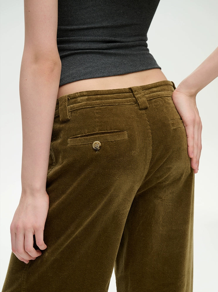 Crafted with a soft yet structured feel, they balance vintage texture with a modern shape for all-day wear. Made from heavyweight corduroy with rich color depth, the fabric is soft to the touch, with fine, rounded ridges and a gentle drape that adds movement. The loose fit and slightly dropped waist give off a laid-back vibe without compromising structure. Subtle details like curved front pockets, a back pocket design, and a contrast button elevate the finish without trying too hard. These pants are built for low-key weekends, casual meet-ups, or toned-down work looks.
