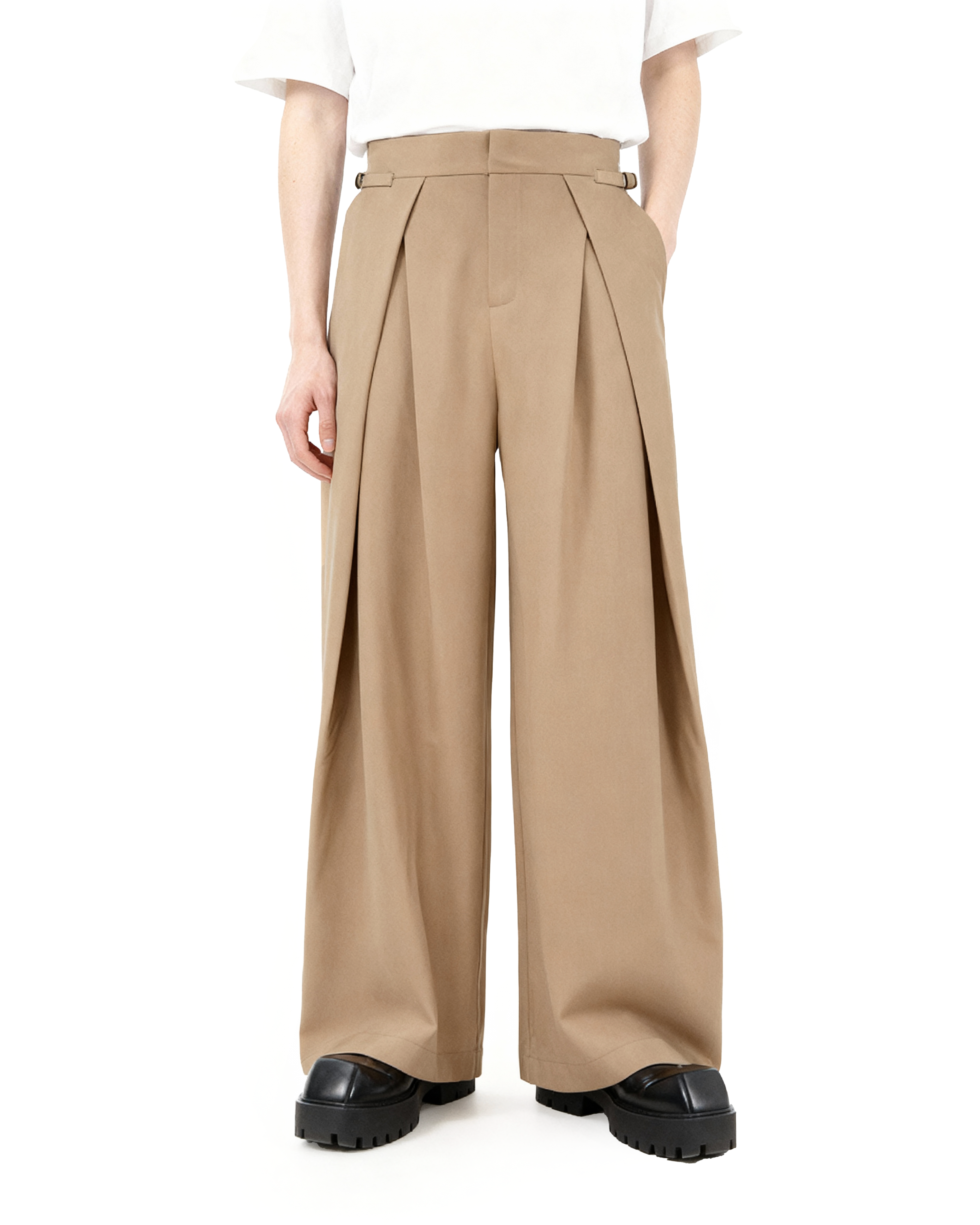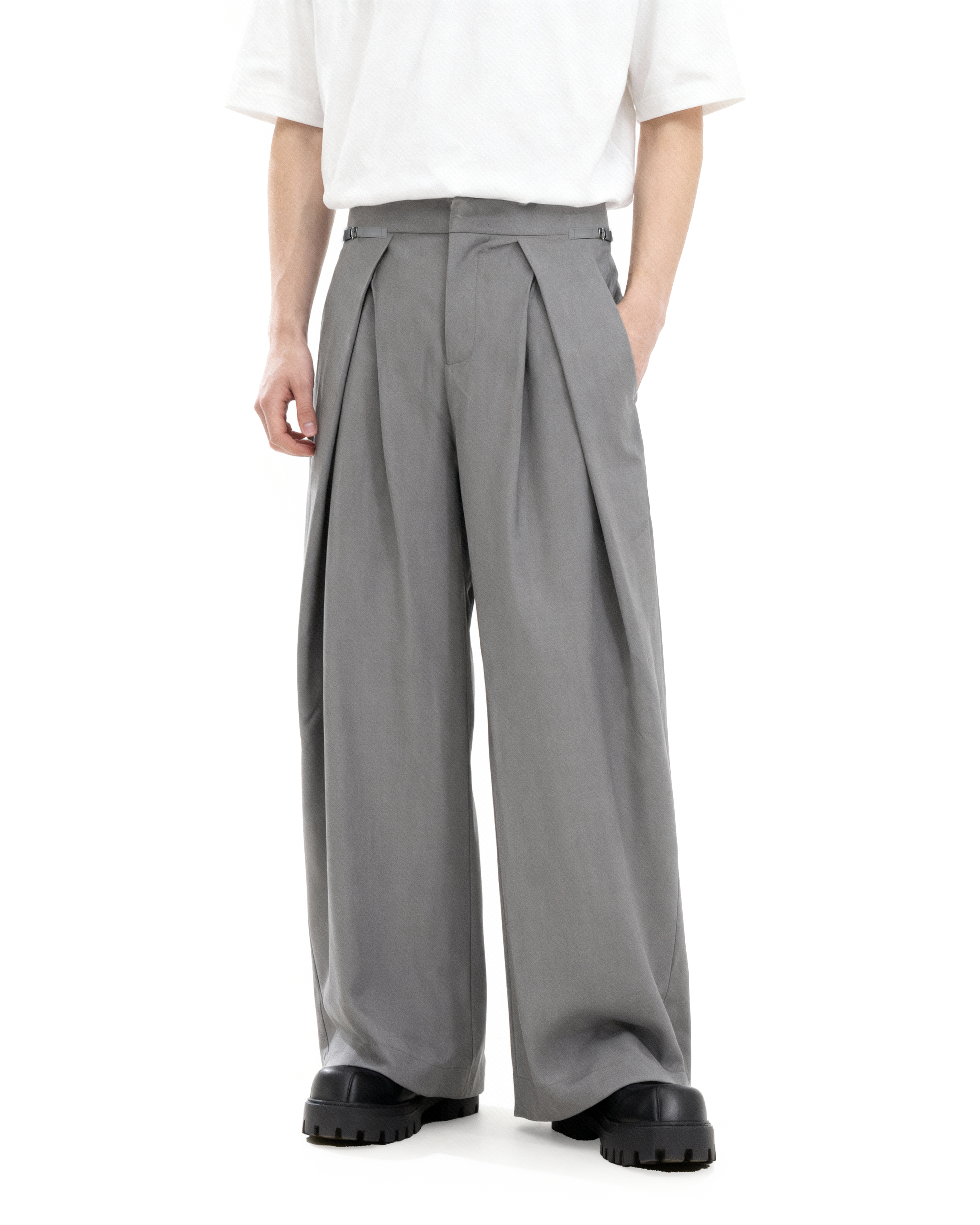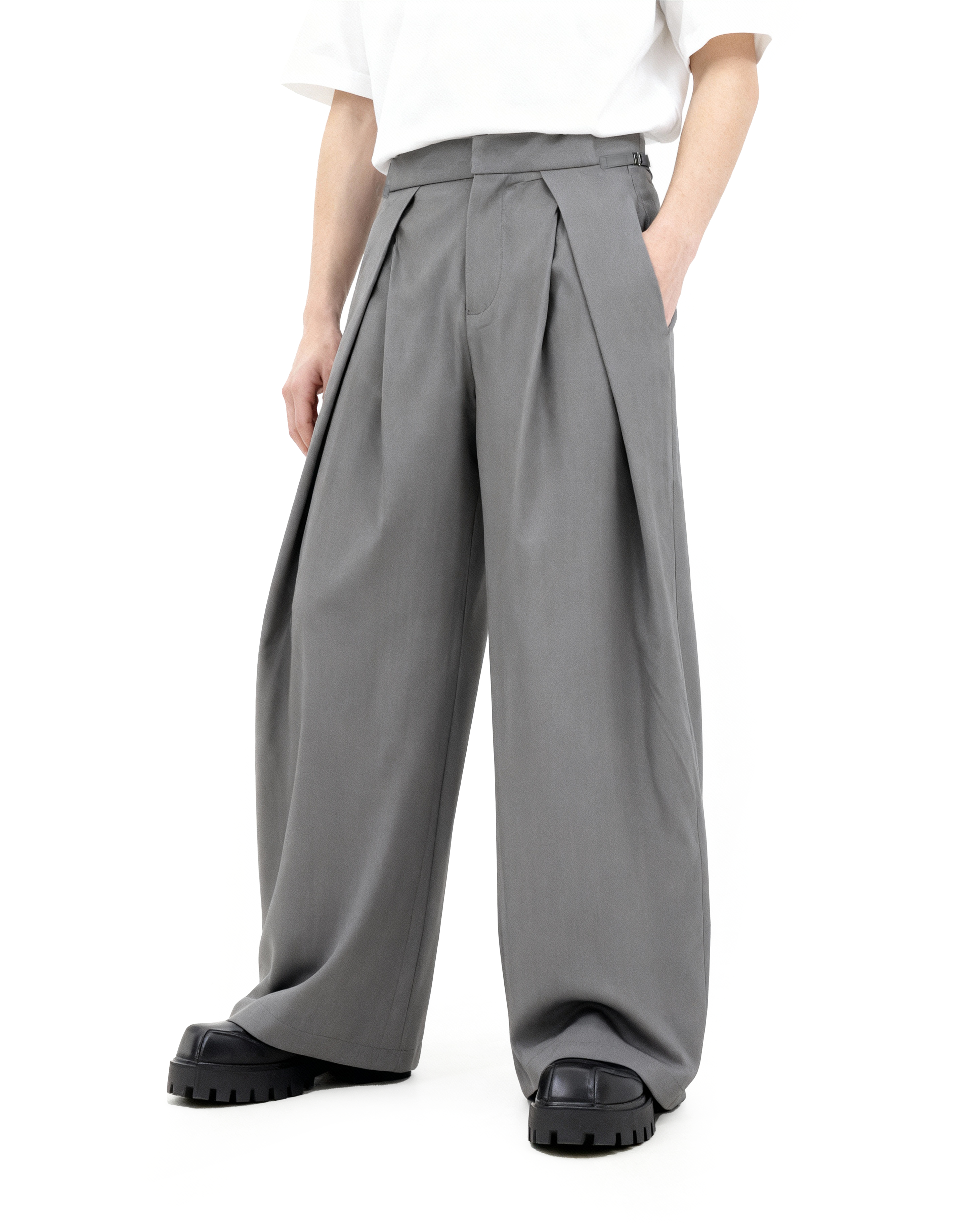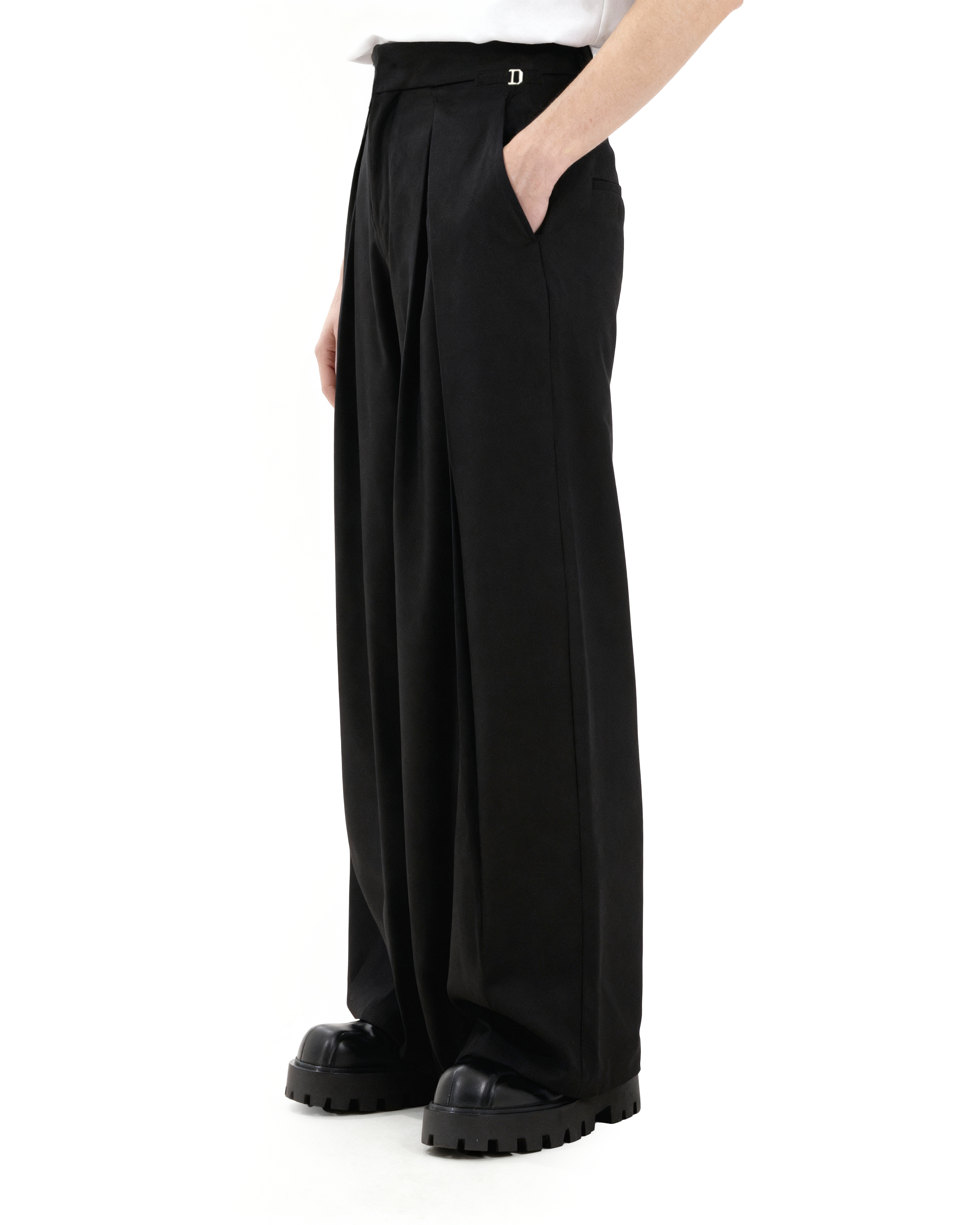 These trousers are crafted from a premium polyester blend, offering both durability and comfort with a hint of stretch. The pleated design and wide-leg cut combine to create a fluid silhouette that exudes confidence, while the solid color and minimalistic style ensure they remain a timeless staple.