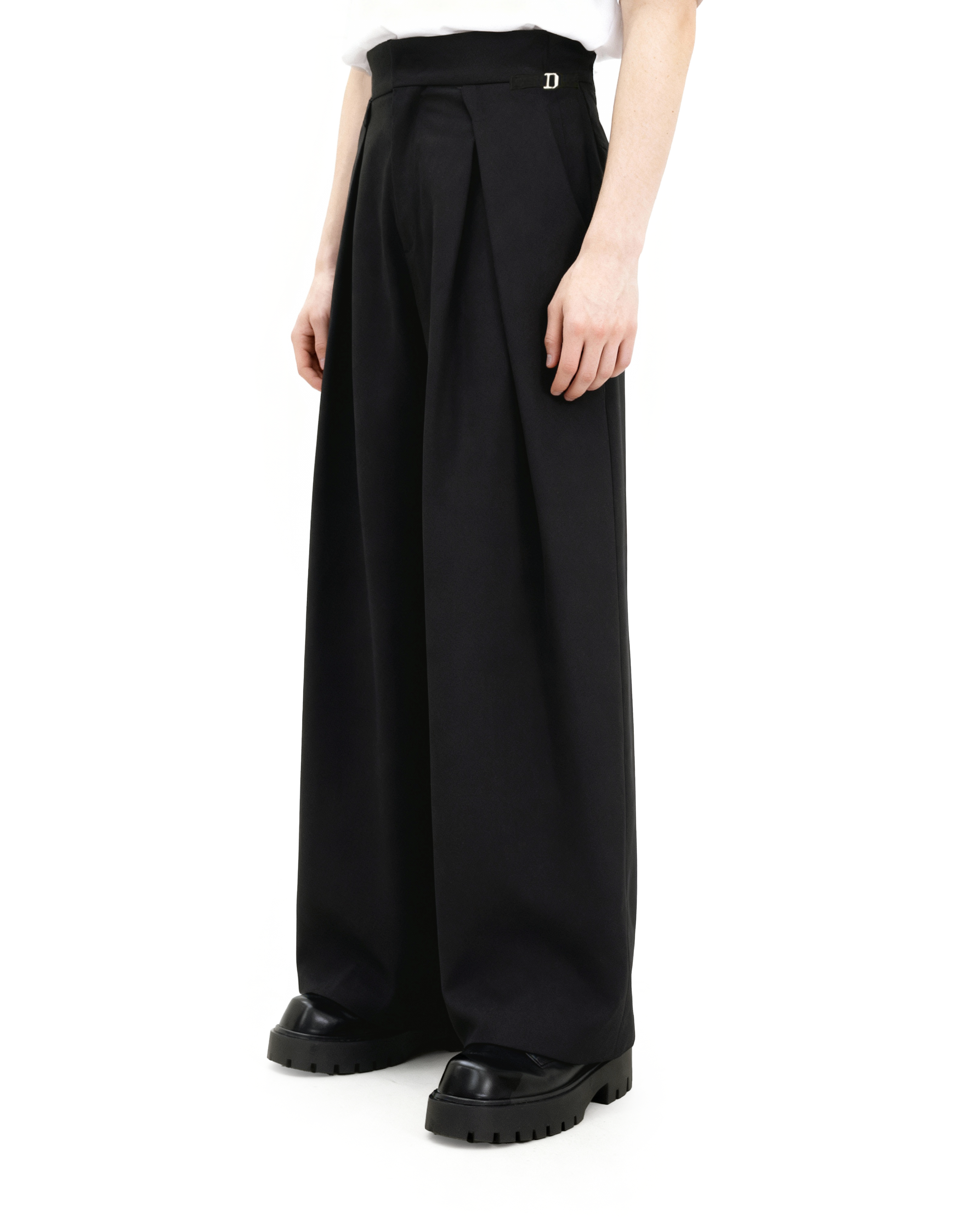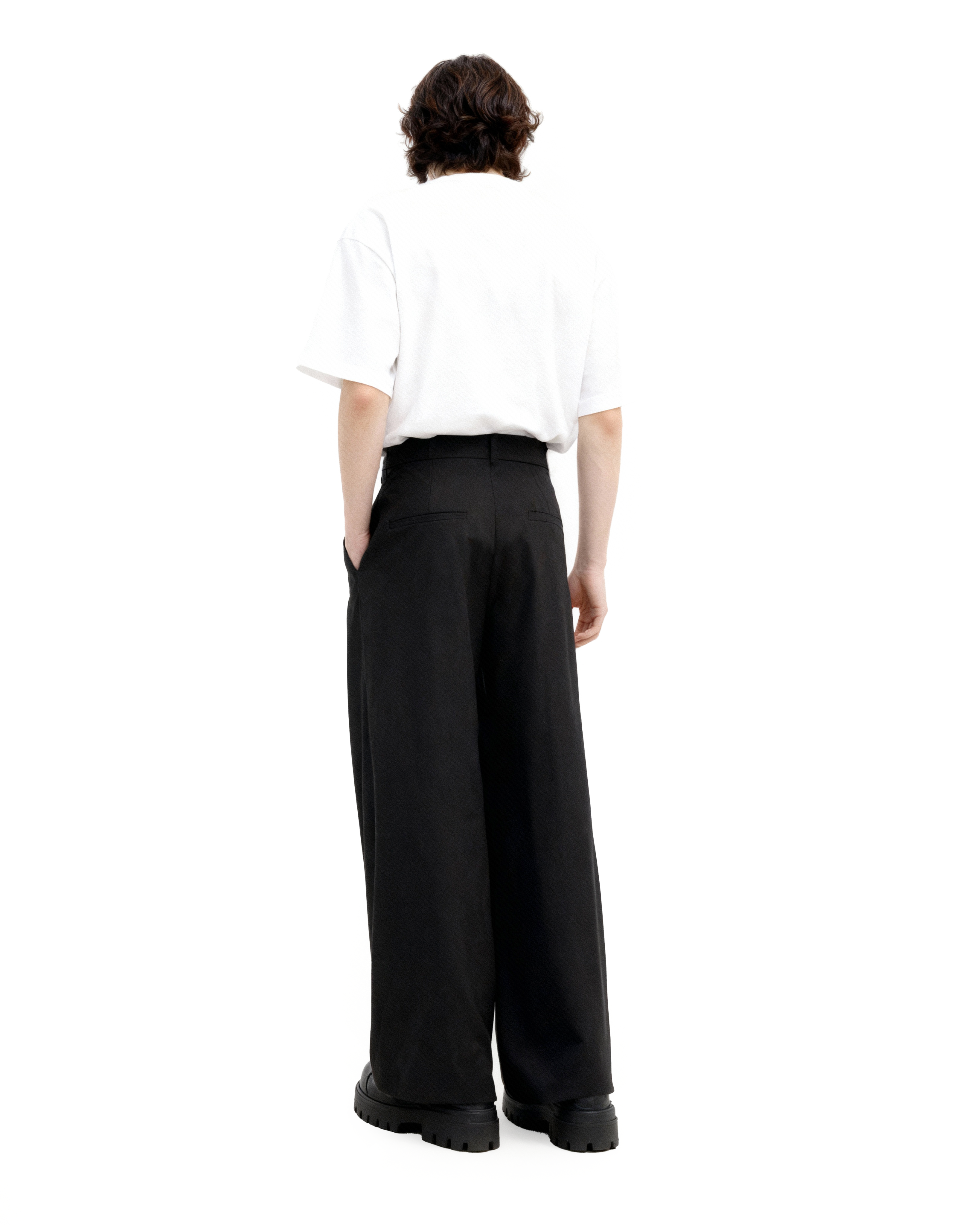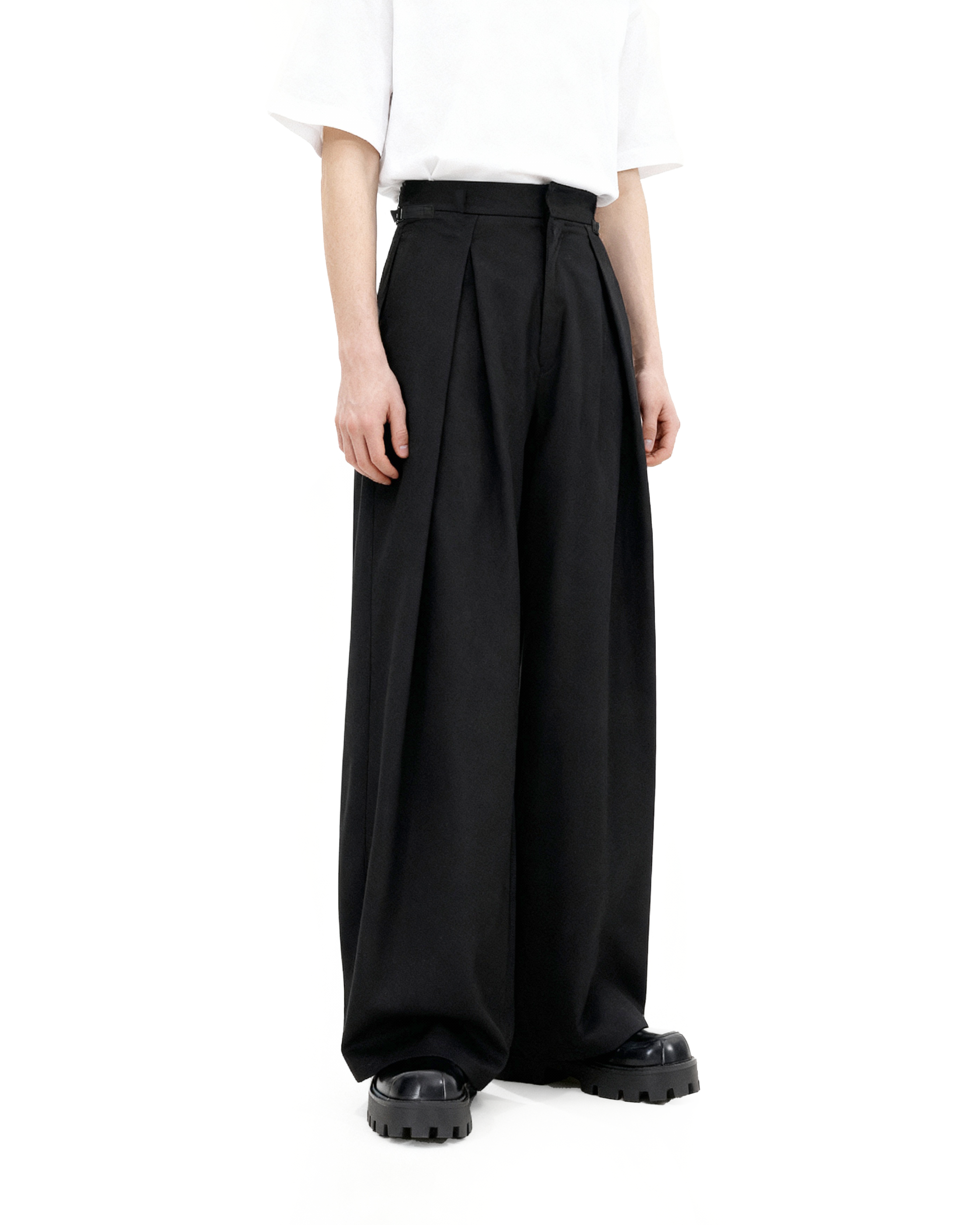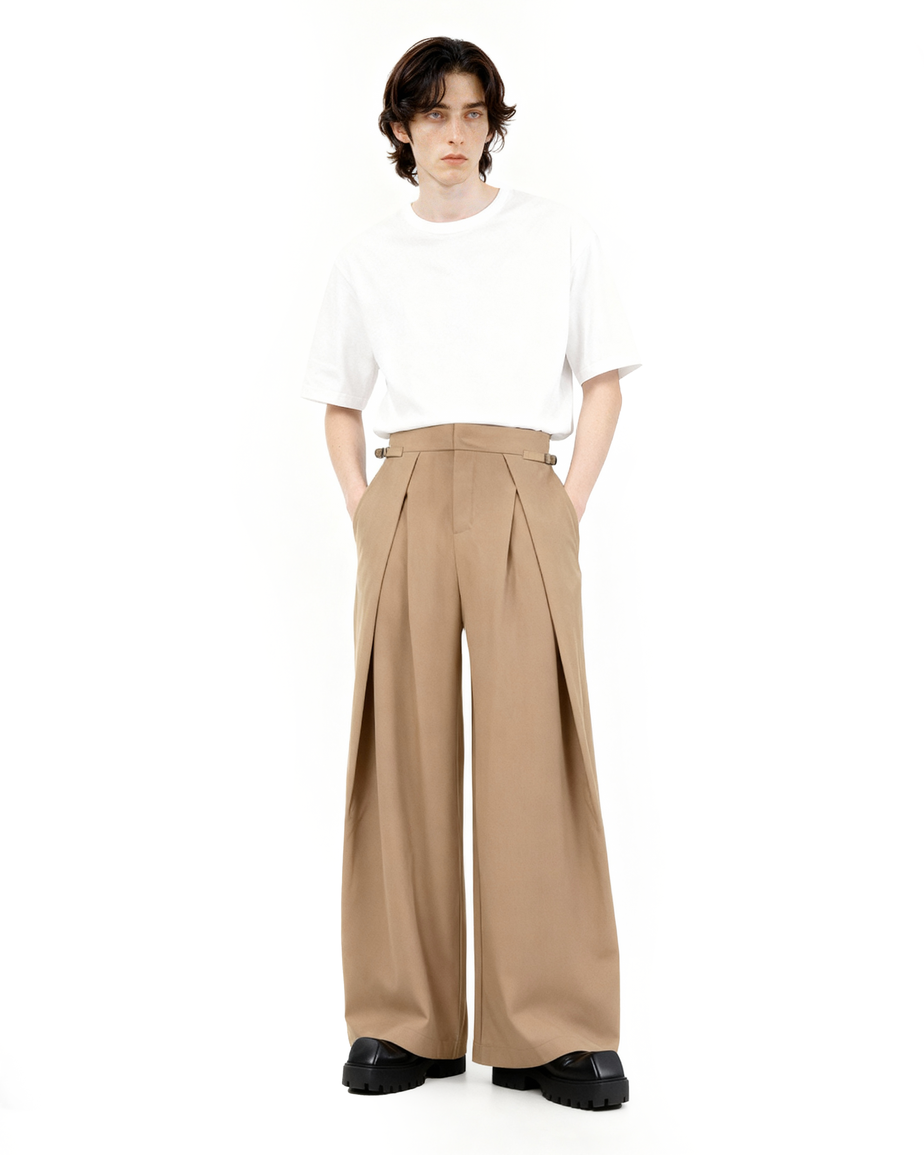 These trousers are crafted from a premium polyester blend, offering both durability and comfort with a hint of stretch. The pleated design and wide-leg cut combine to create a fluid silhouette that exudes confidence, while the solid color and minimalistic style ensure they remain a timeless staple.