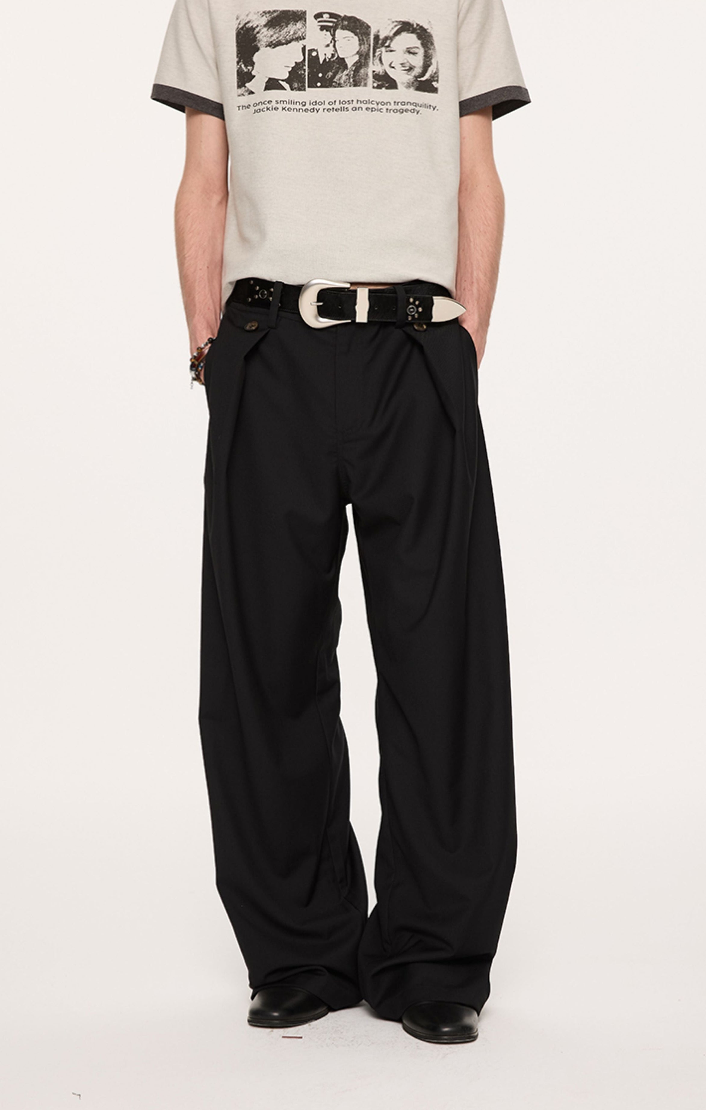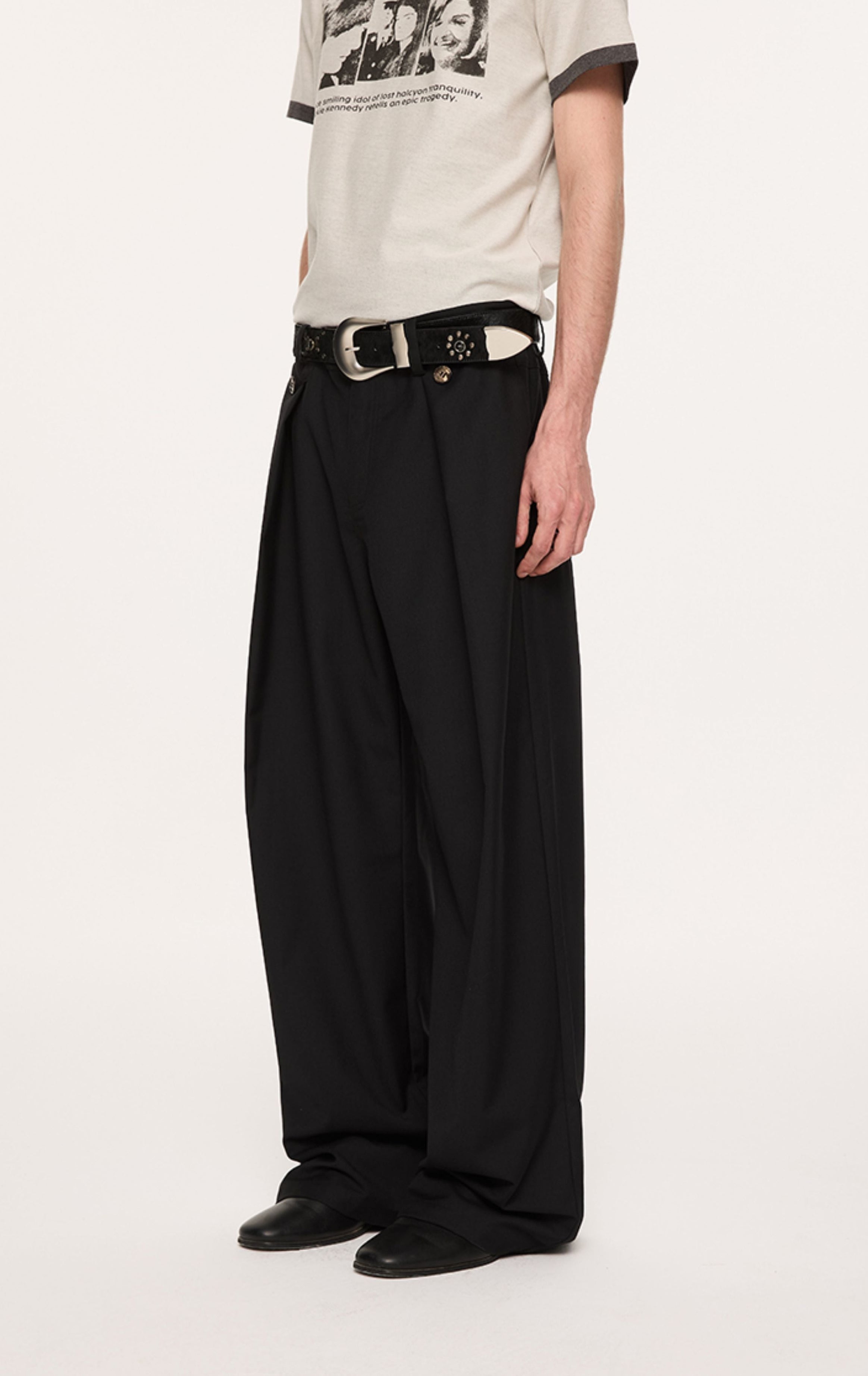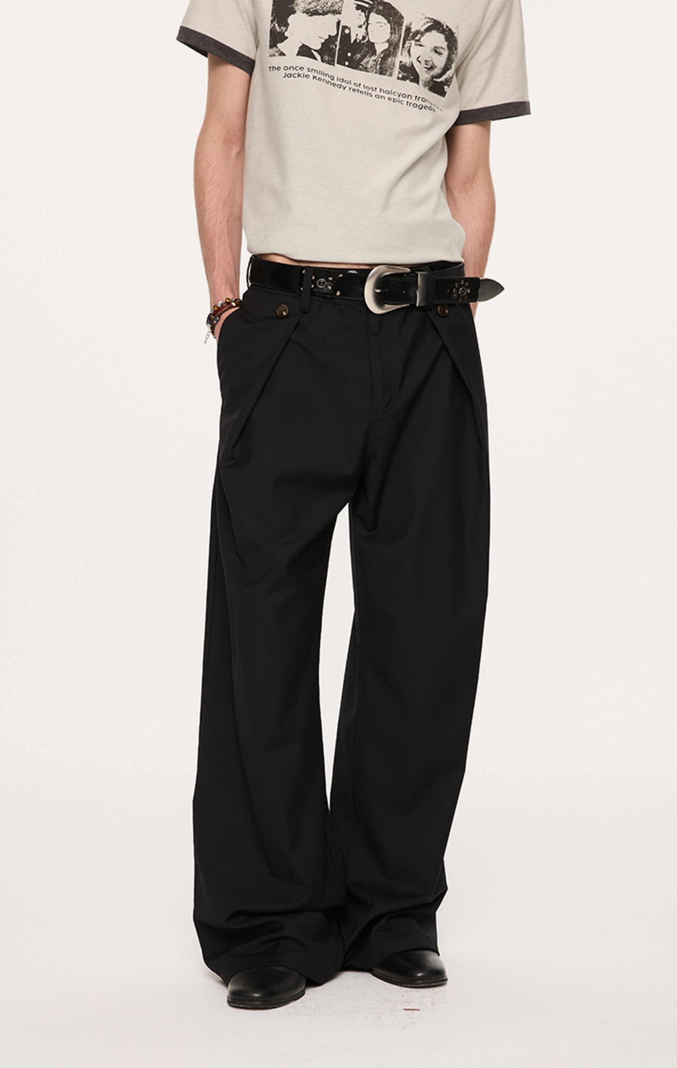 Wide Leg Pleated Pants with Side Overlay Button Panels