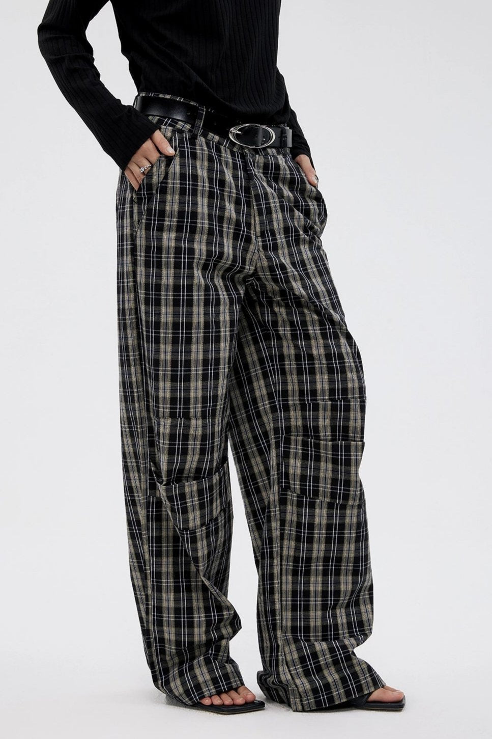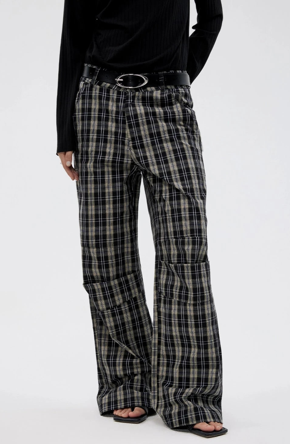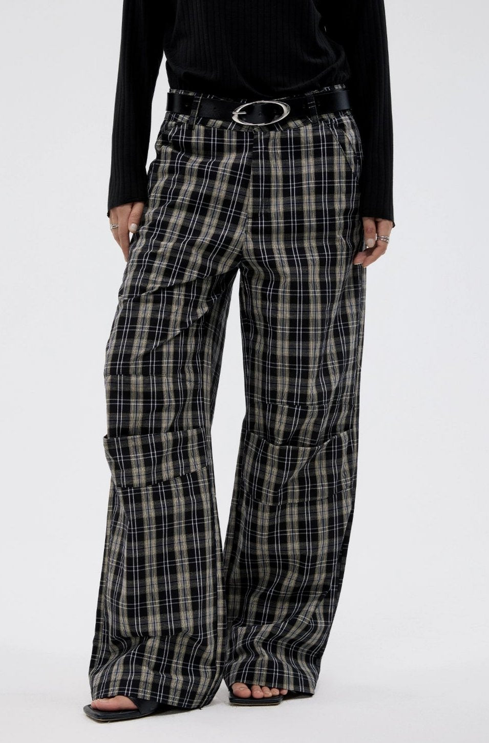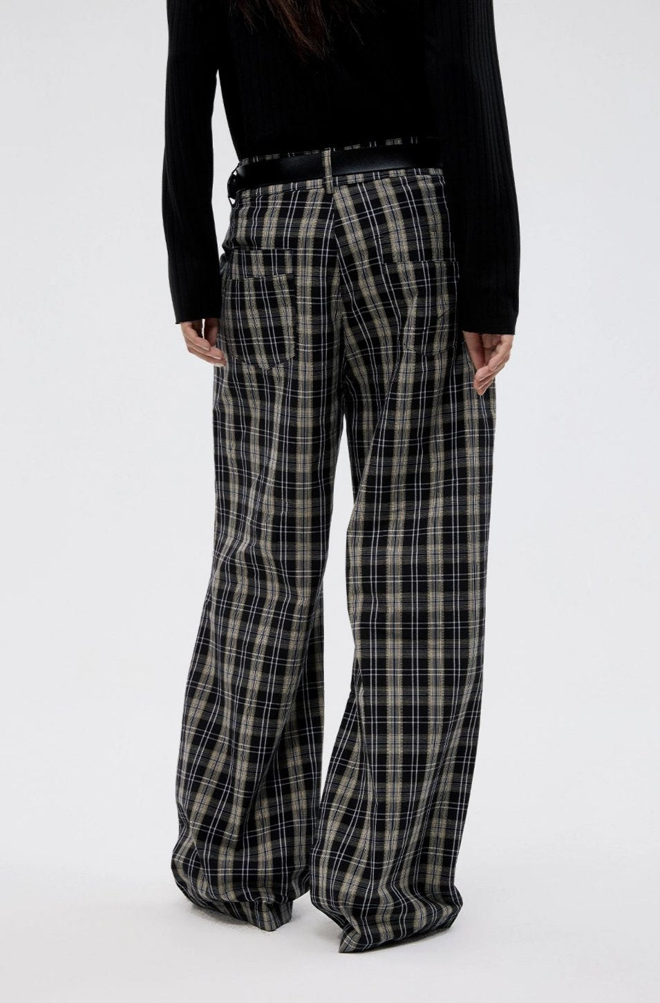 Meticulously crafted with a focus on detail, these trousers showcase a sharp pleated front, amplifying the flow of the soft fabric. The timeless plaid pattern adds a hint of sophistication, effortlessly transitioning from office to off-duty chic. The mid-rise waist and loose straight fit provide both comfort and style, embodying effortless fashion with a moody edge.
