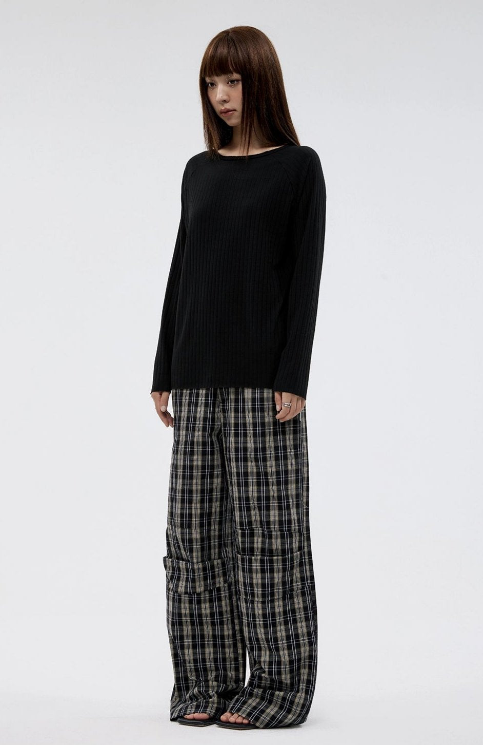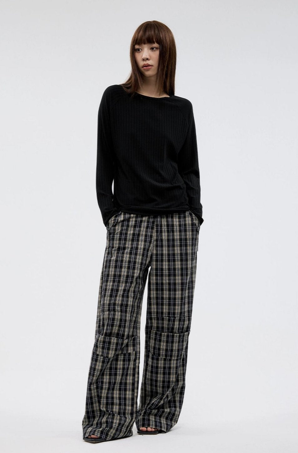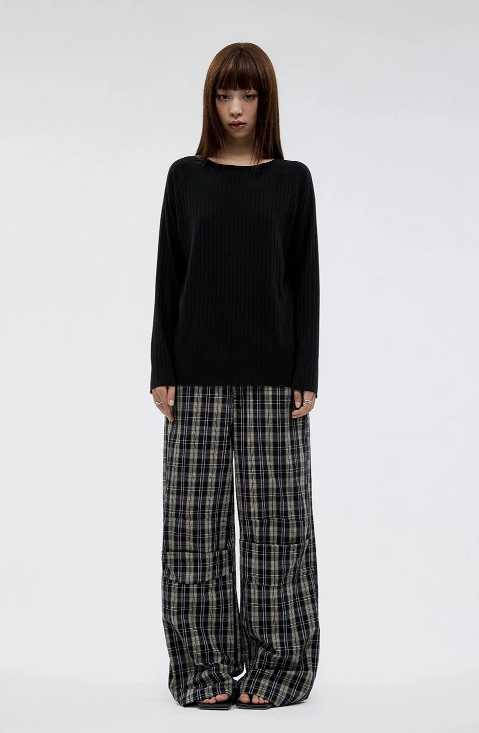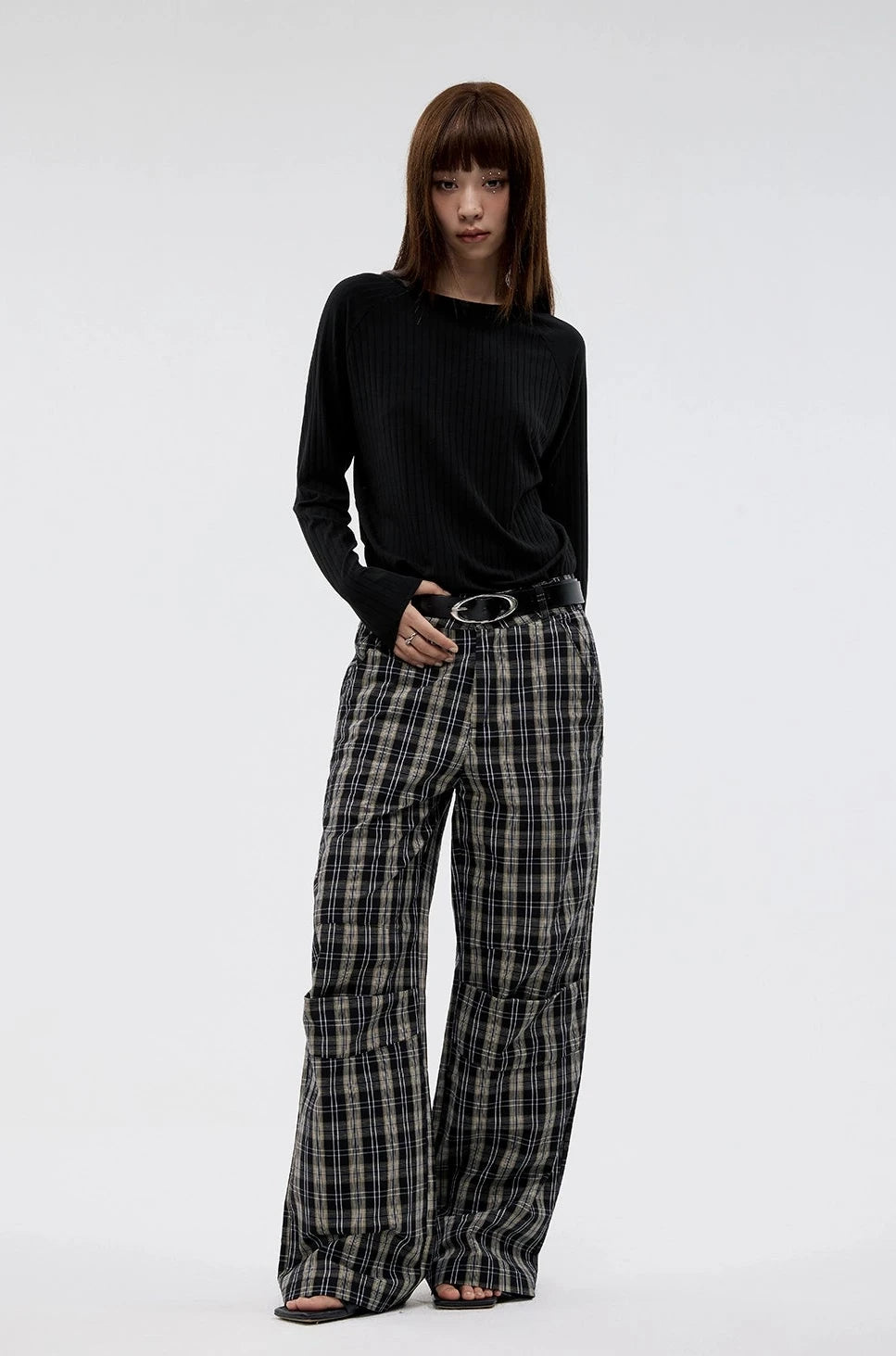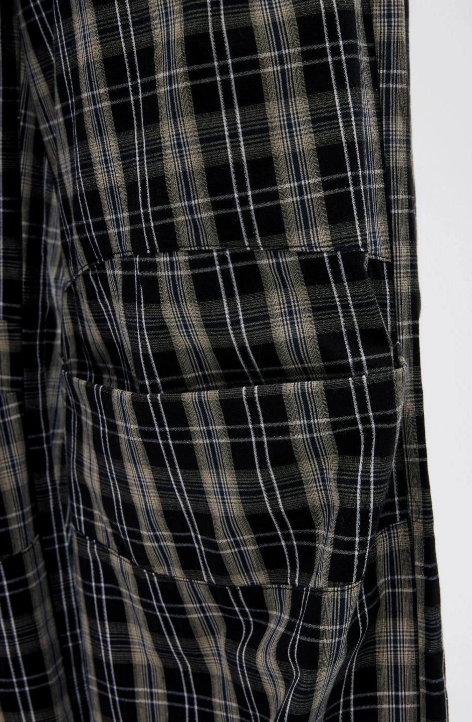 Meticulously crafted with a focus on detail, these trousers showcase a sharp pleated front, amplifying the flow of the soft fabric. The timeless plaid pattern adds a hint of sophistication, effortlessly transitioning from office to off-duty chic. The mid-rise waist and loose straight fit provide both comfort and style, embodying effortless fashion with a moody edge.
