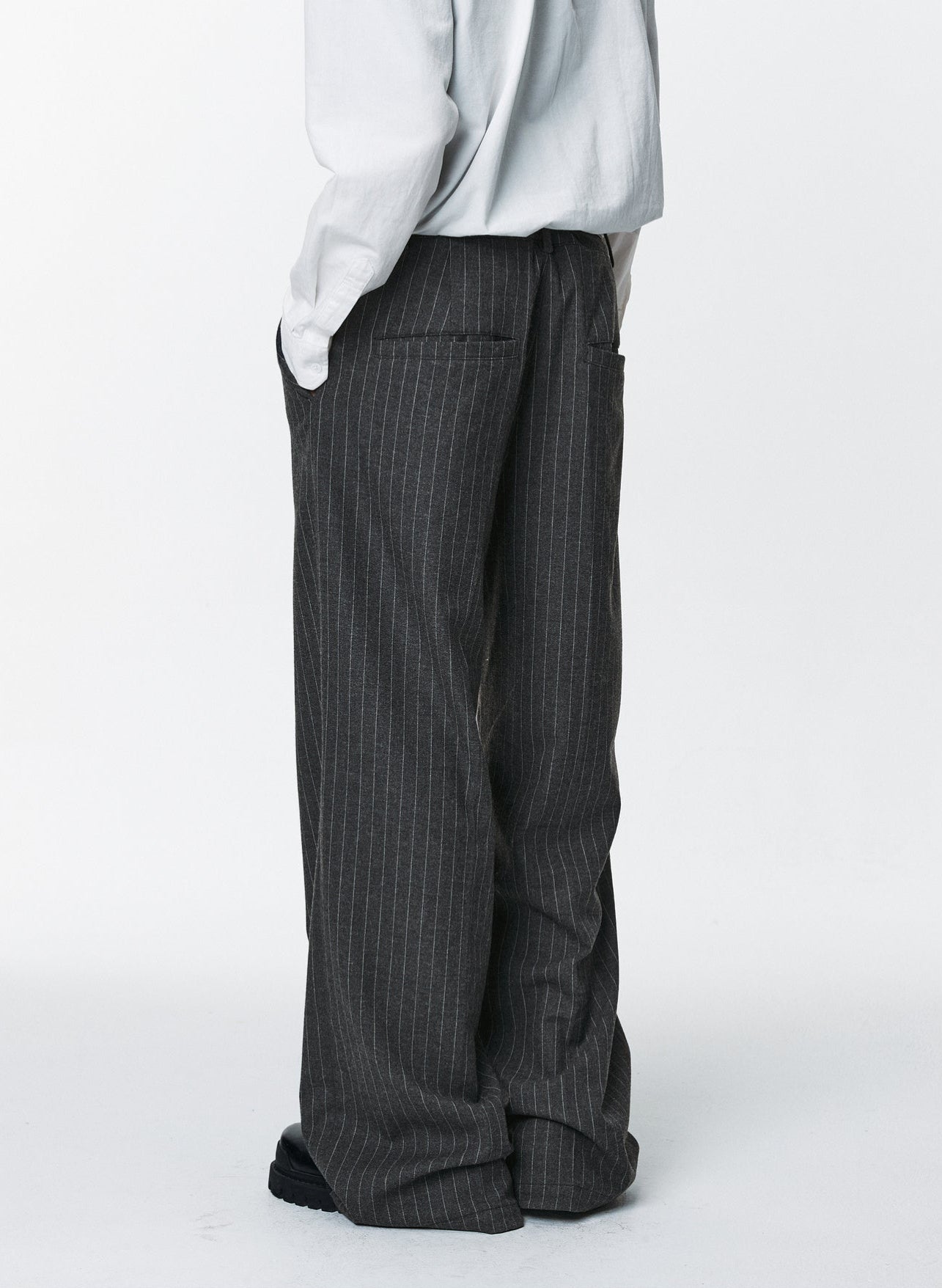 Made from a soft, medium-weight wool-blend fabric with 18% wool content, they feature subtle vertical pinstripes that add texture and elongate the leg. The loose, straight cut offers comfort without compromising structure, and the minimalist waistband closes with a sleek zip and fastener design, keeping things polished.