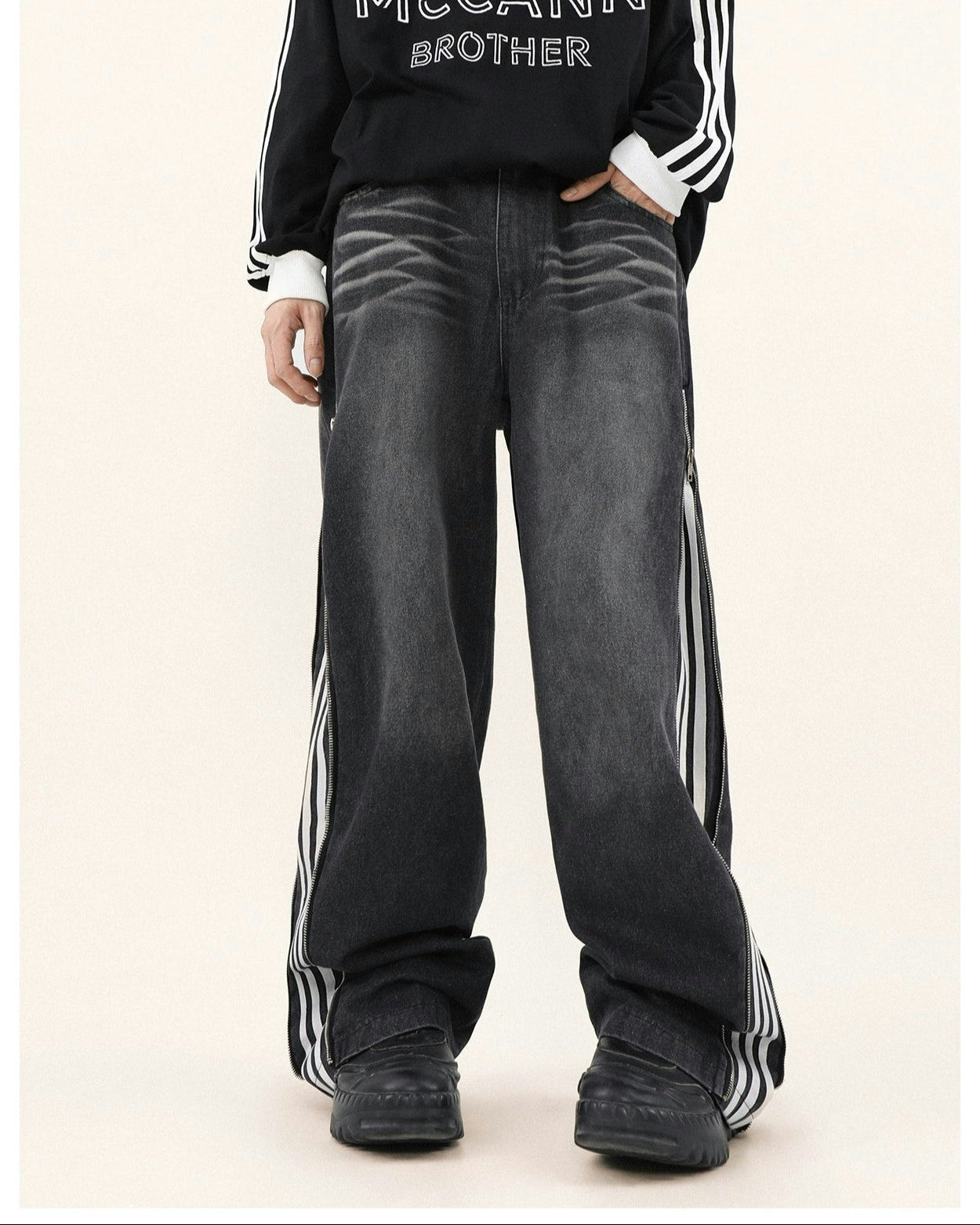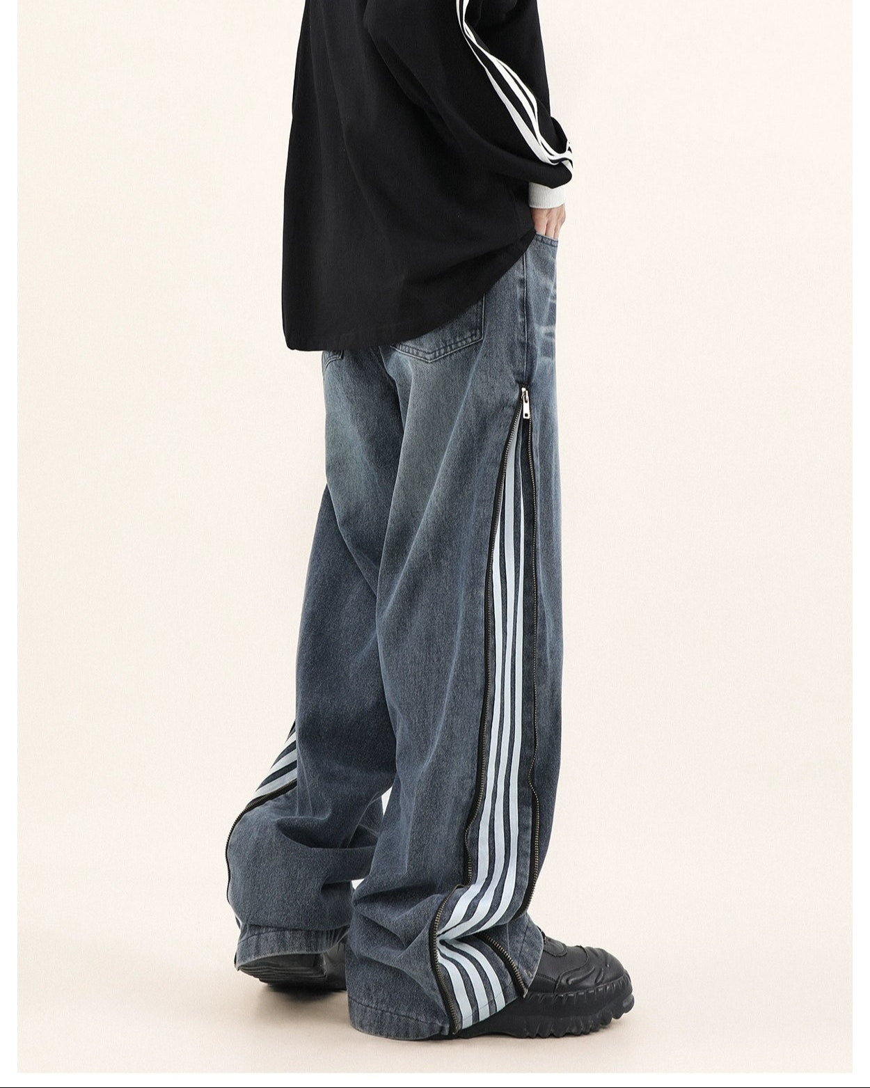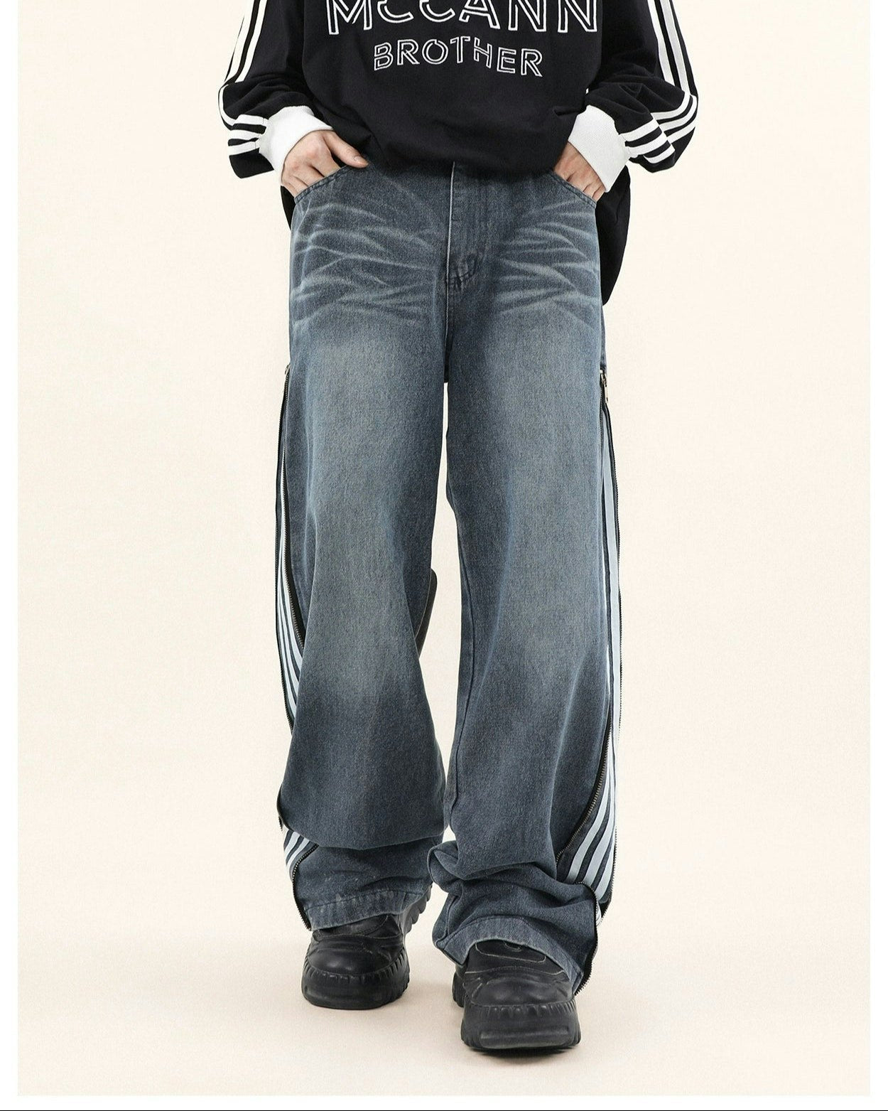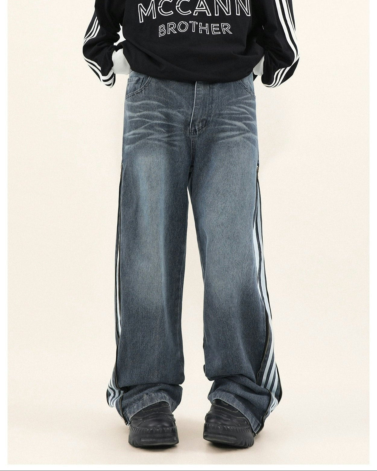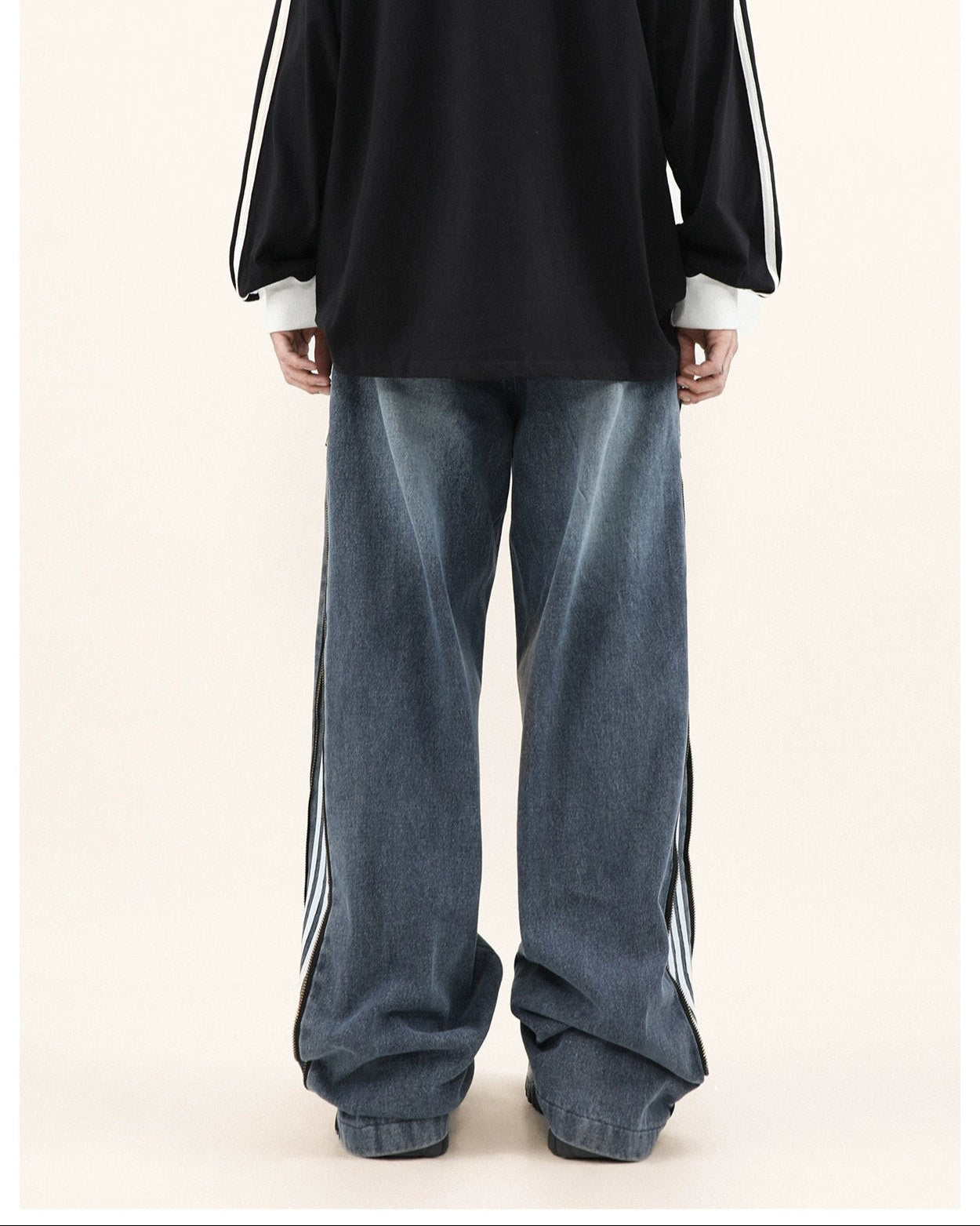 Read full Return PolicyStep up your style game with our Wide-Leg Side Stripe Denim Zippered Jeans, a bold twist on a classic silhouette. High-quality jeans pair with striking side stripes, invoking a crisp aesthetic with a side zipper that adds an edge. These versatile jeans are a savvy investment for anyone looking to elevate their wardrobe with a piece that transcends the everyday.