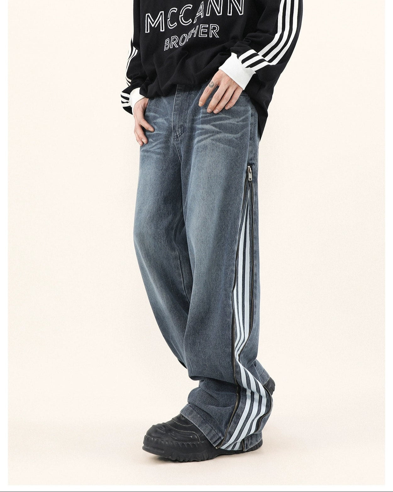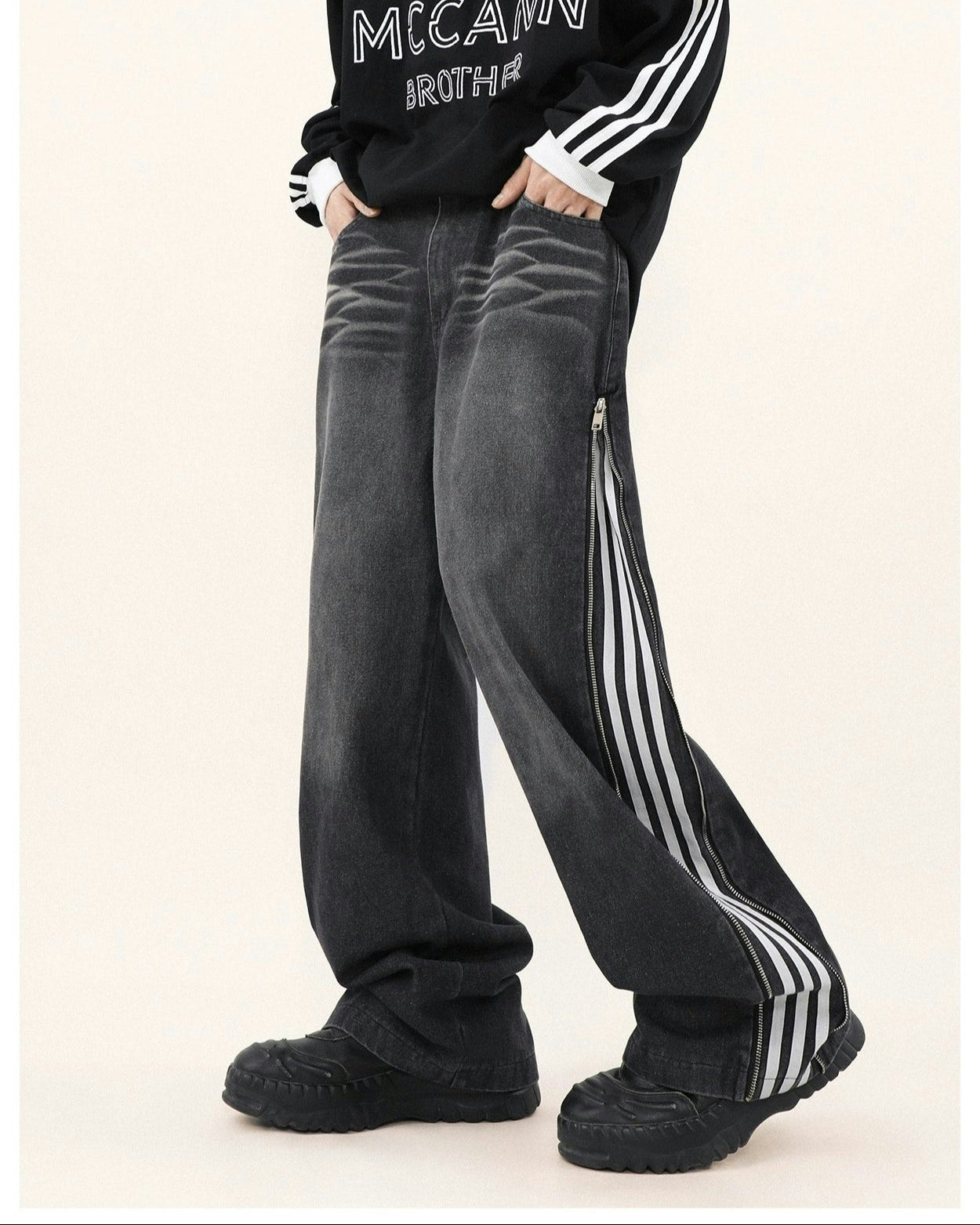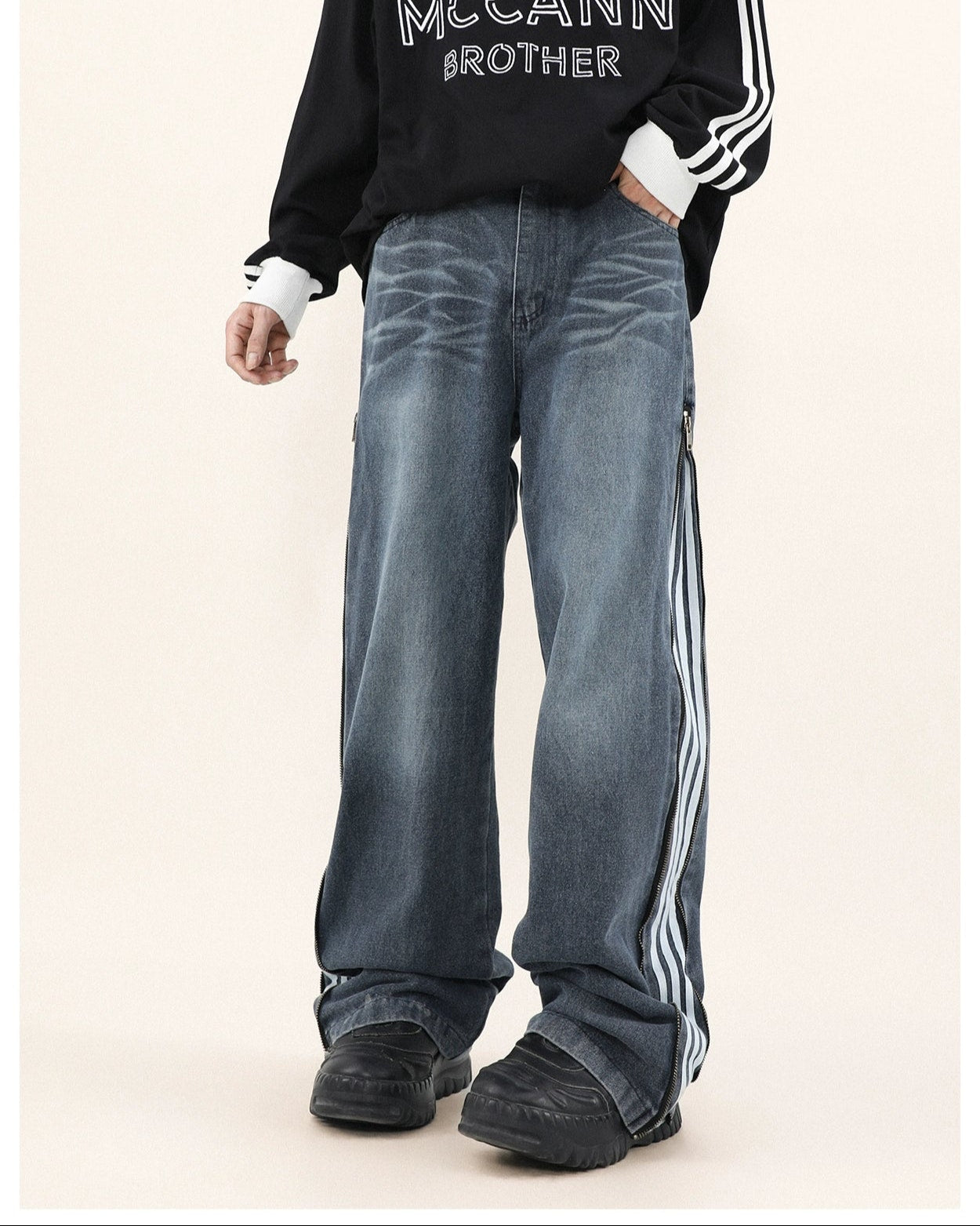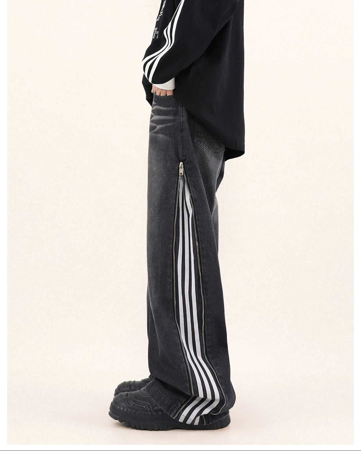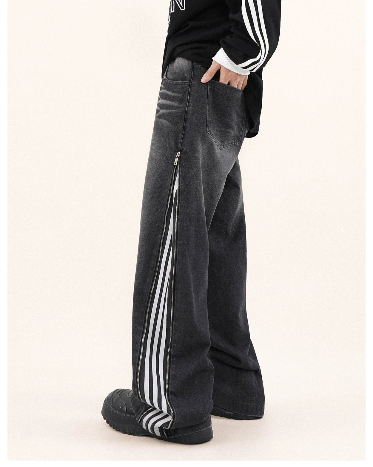 Read full Return PolicyStep up your style game with our Wide-Leg Side Stripe Denim Zippered Jeans, a bold twist on a classic silhouette. High-quality jeans pair with striking side stripes, invoking a crisp aesthetic with a side zipper that adds an edge. These versatile jeans are a savvy investment for anyone looking to elevate their wardrobe with a piece that transcends the everyday.