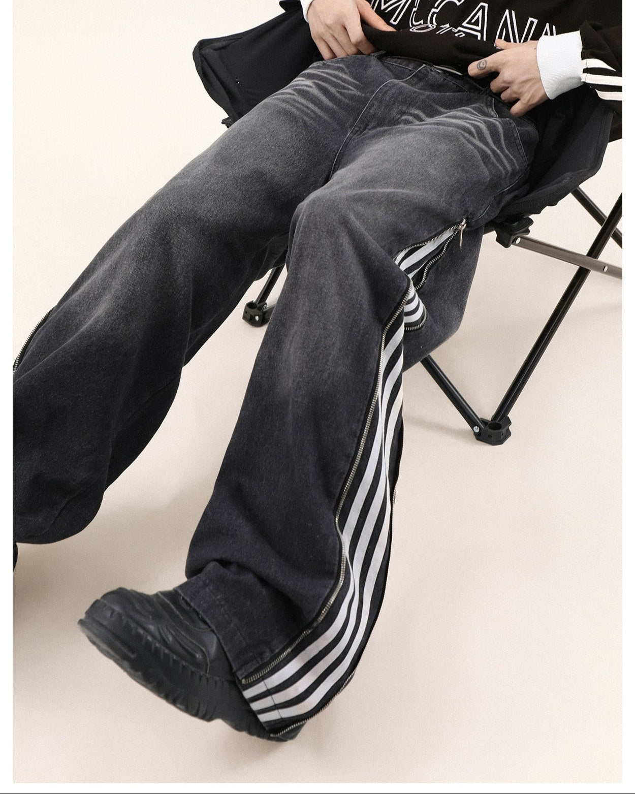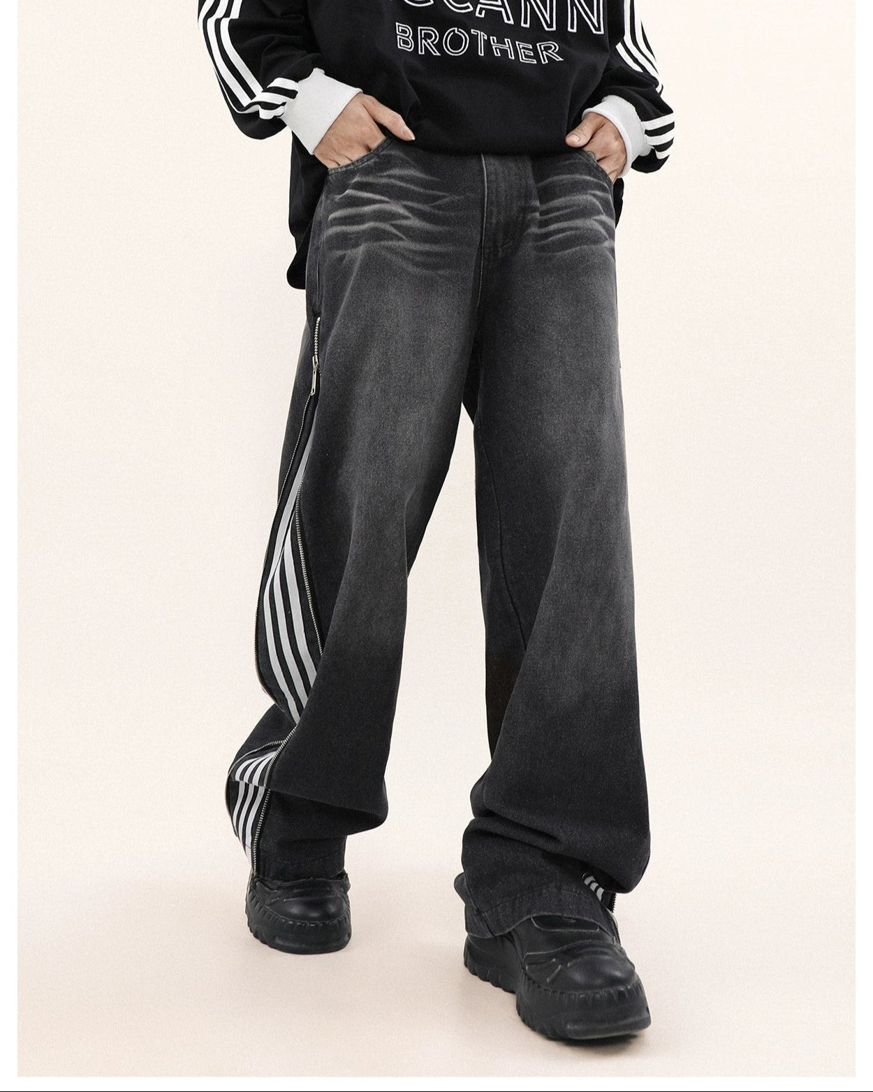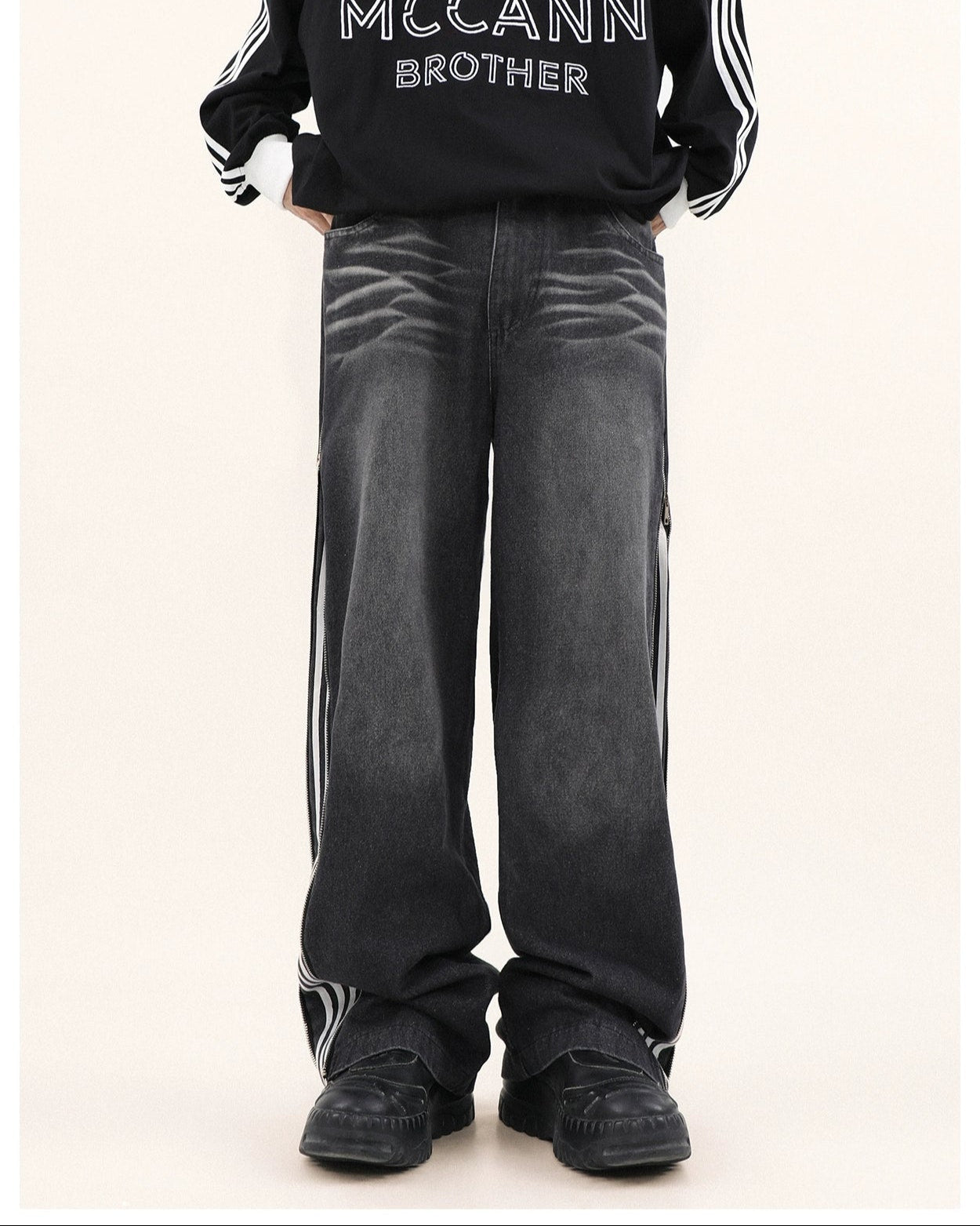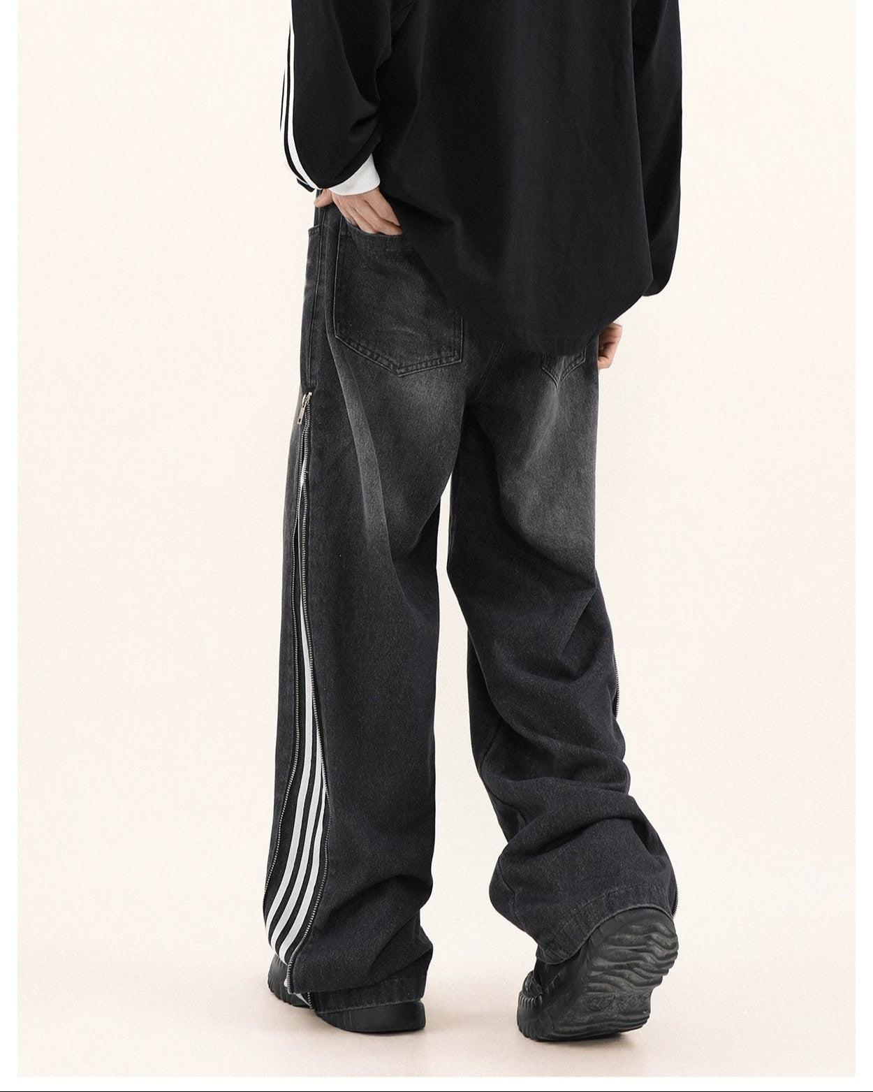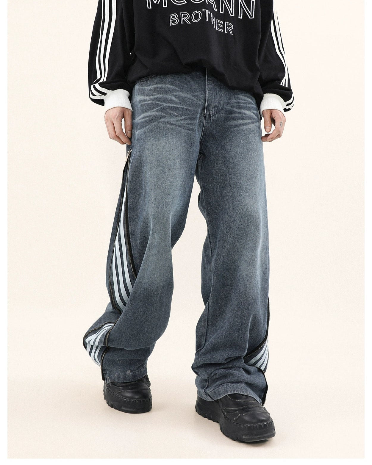 Read full Return PolicyStep up your style game with our Wide-Leg Side Stripe Denim Zippered Jeans, a bold twist on a classic silhouette. High-quality jeans pair with striking side stripes, invoking a crisp aesthetic with a side zipper that adds an edge. These versatile jeans are a savvy investment for anyone looking to elevate their wardrobe with a piece that transcends the everyday.