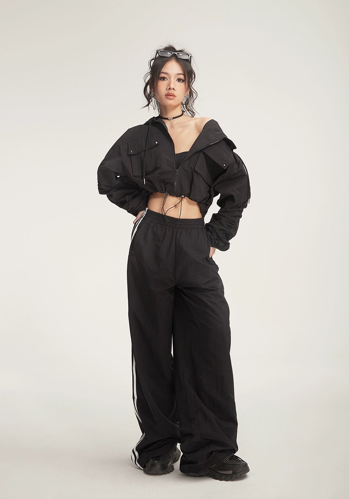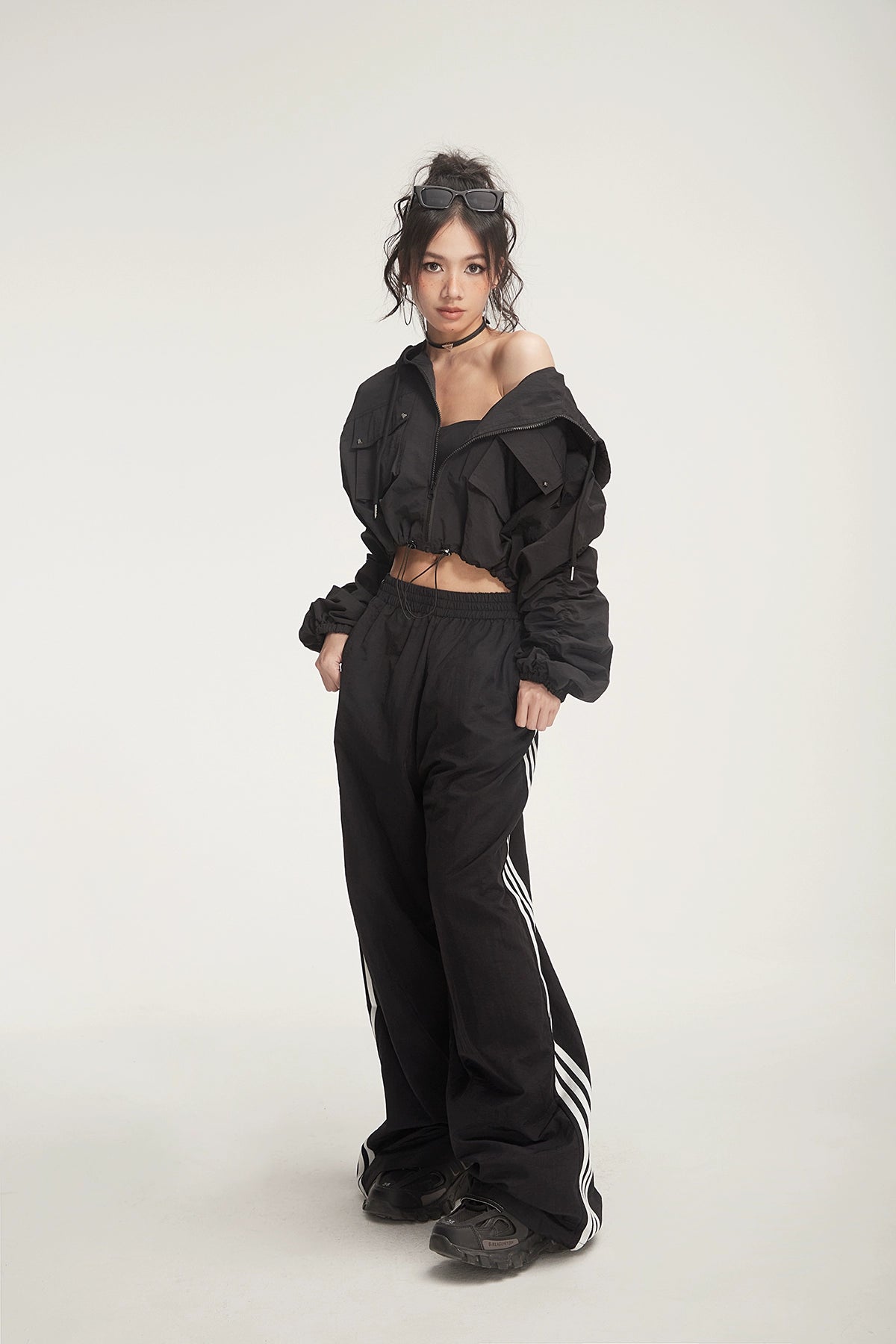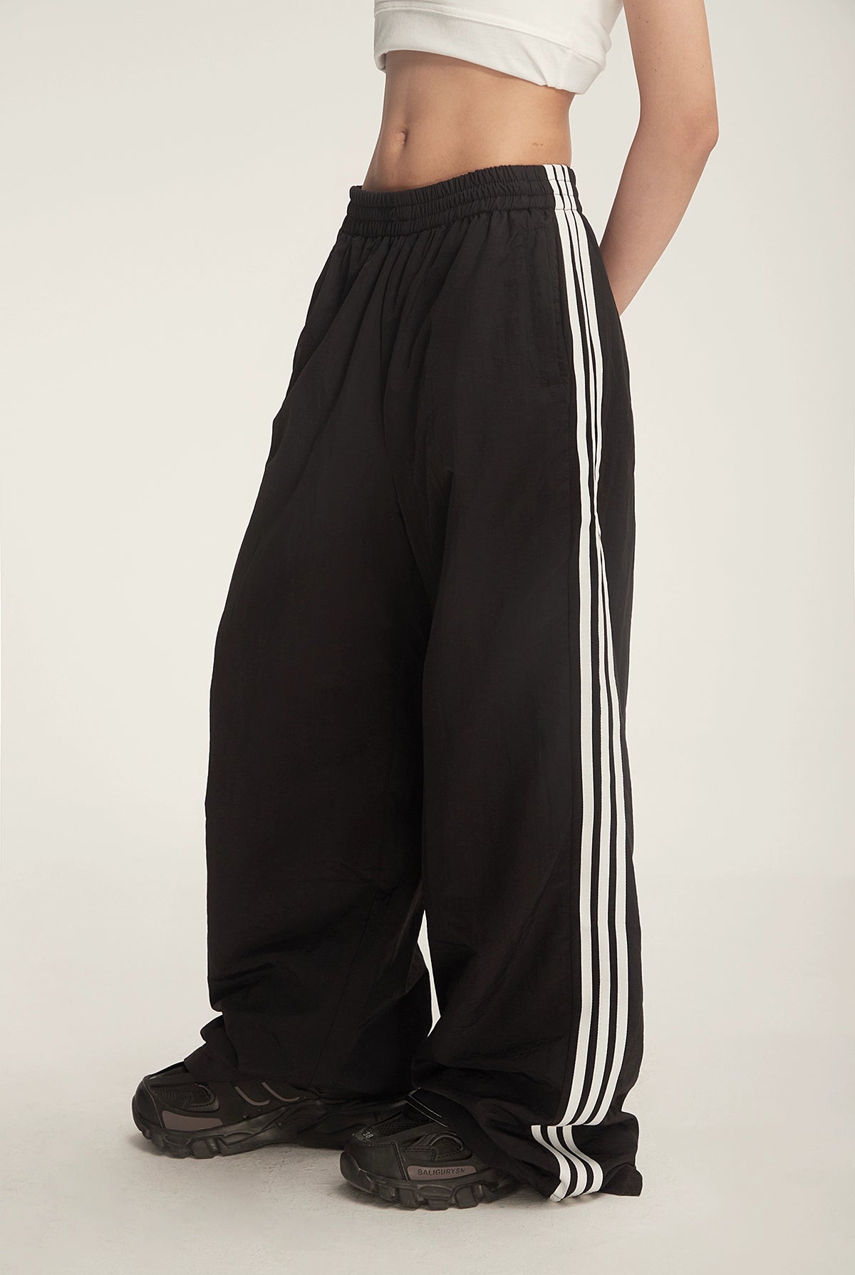 Read full Return PolicyCapture the effortless cool with these Wide-Leg Striped Track Pants, bringing a modern twist to a classic silhouette.