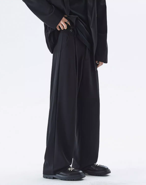 Expertly crafted to deliver both comfort and an edge, these trousers are a sartorial staple. The luxurious feel of the high-end fabric combines with a laid-back, wide-leg cut and precise tailoring to create a garment that transcends occasions. Belt details add a nuanced touch, integrating function with a whisper of defiance.